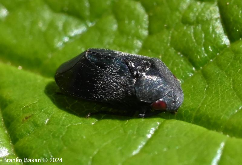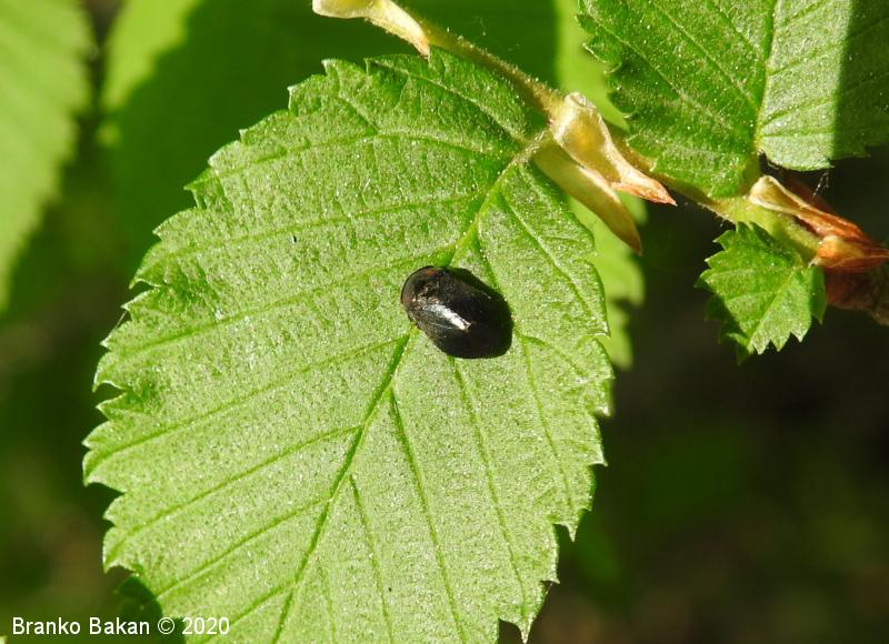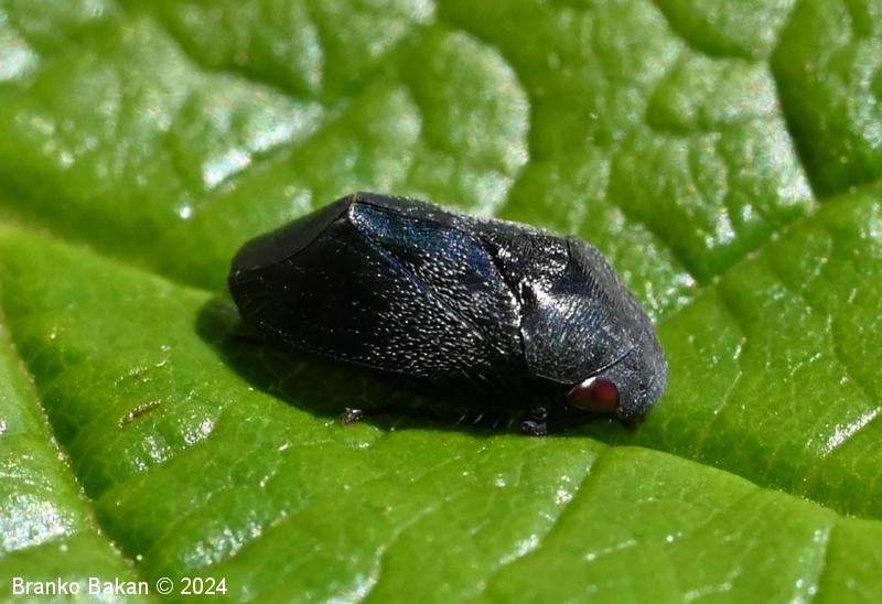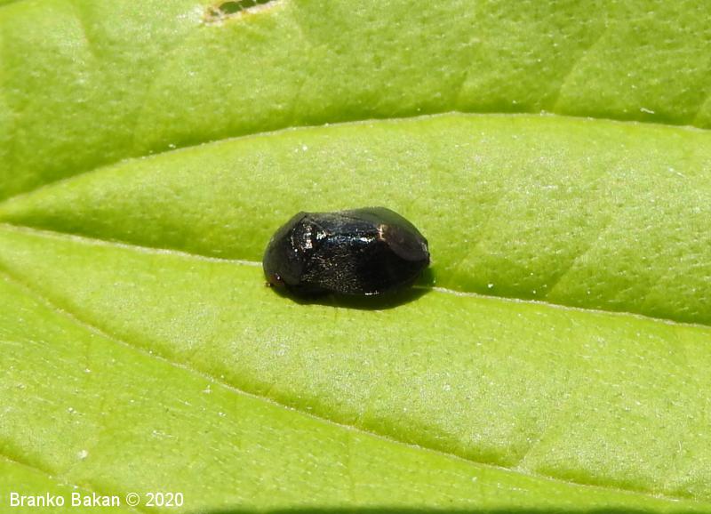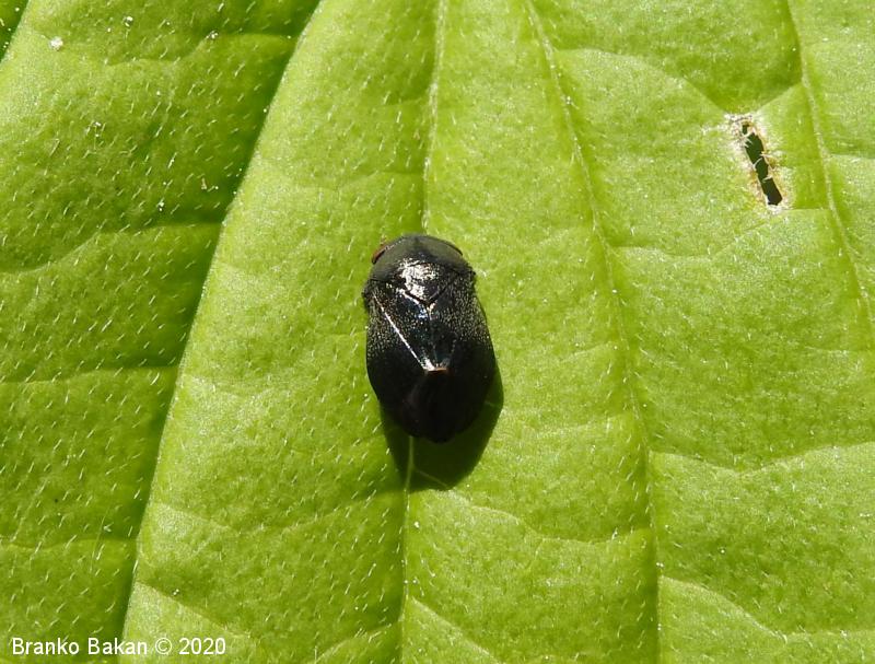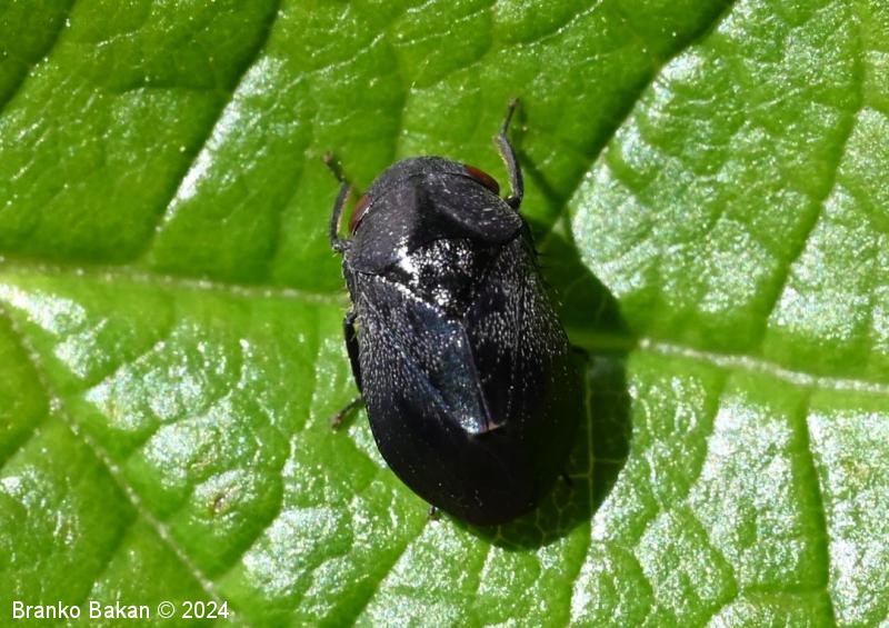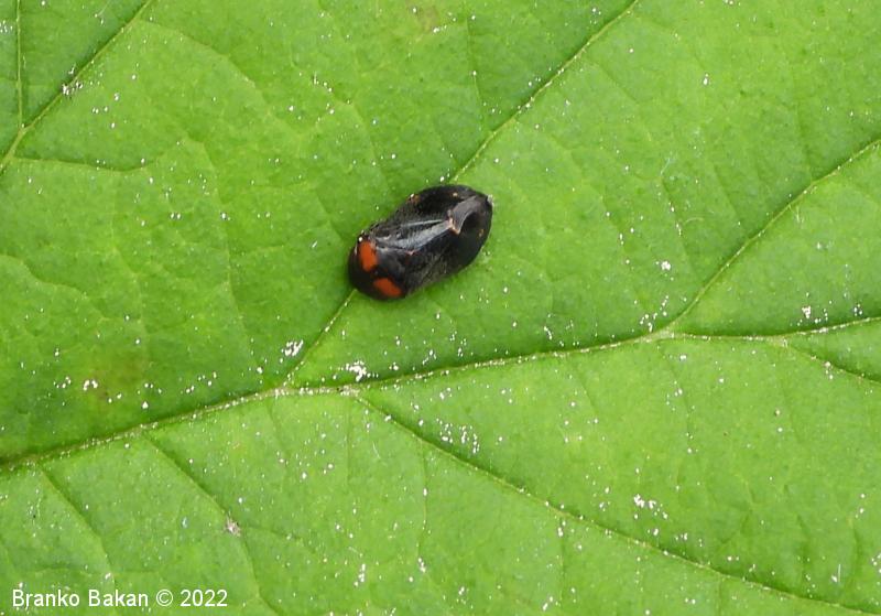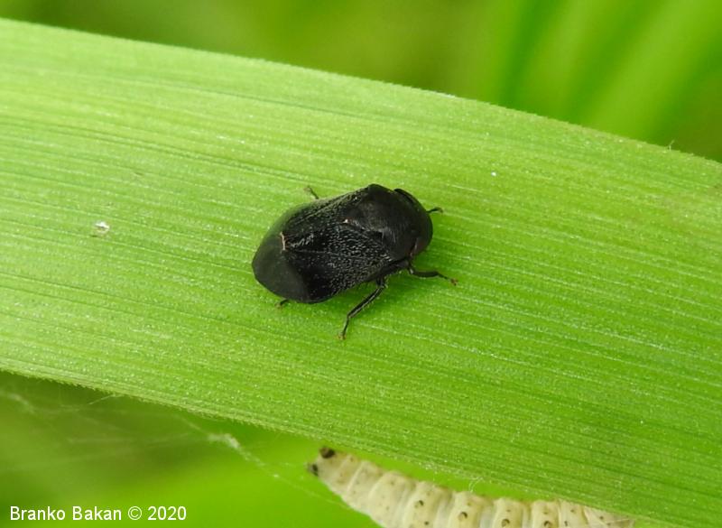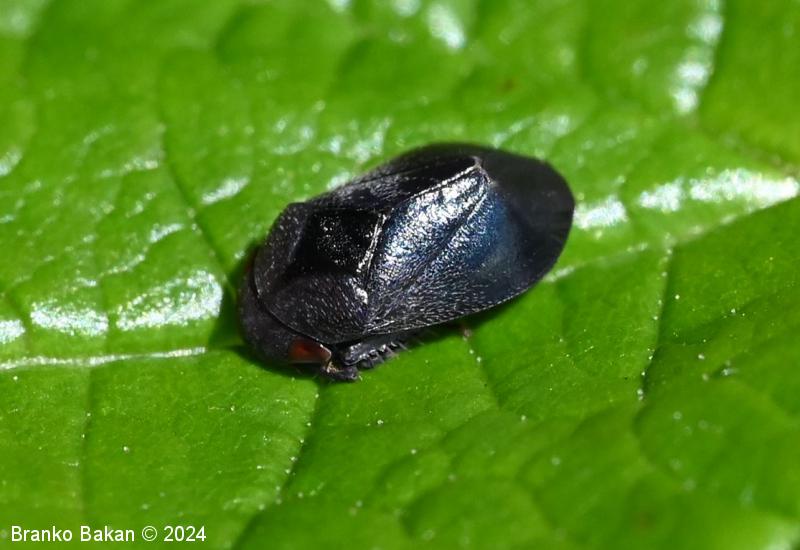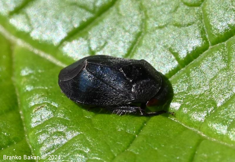Odrasli osebki: telo je drobno, čokato, izrazito grbasto in v zadnjem delu skoraj poševno odrezano, skoraj v celoti črnomodro bleščeče do rdečkastorjavo, poraslo s kratkimi, svetlimi dlakami, na zadnjem delu pogosto s parom rdečih lis, rdeči lisi sta včasih tudi na oprsju. Ščitek (scutellum) je zelo dolg, ozkotrikoten, sega daleč nazaj. Oči so rjavordeče.