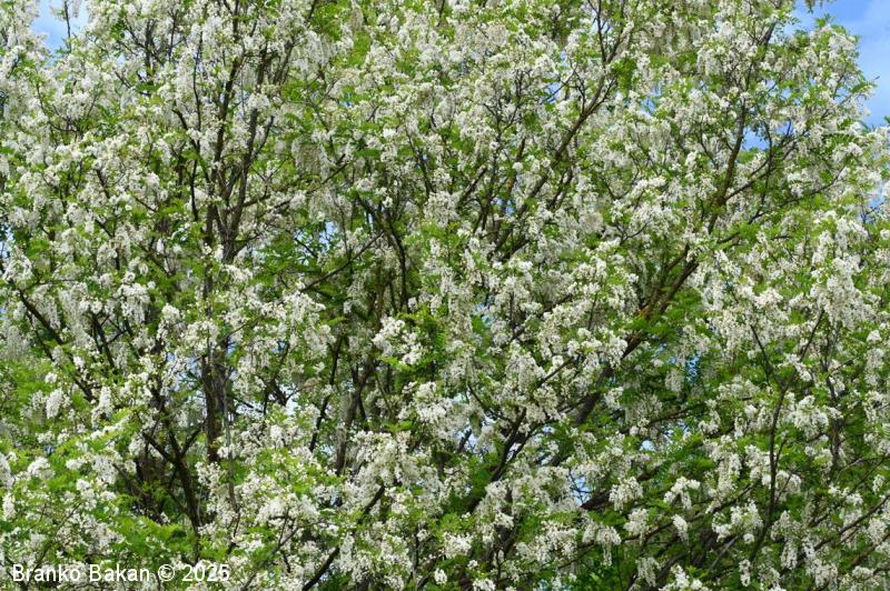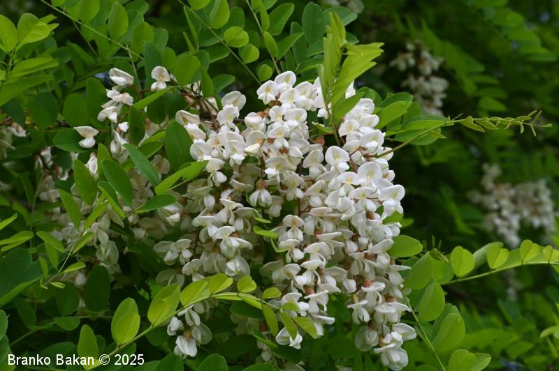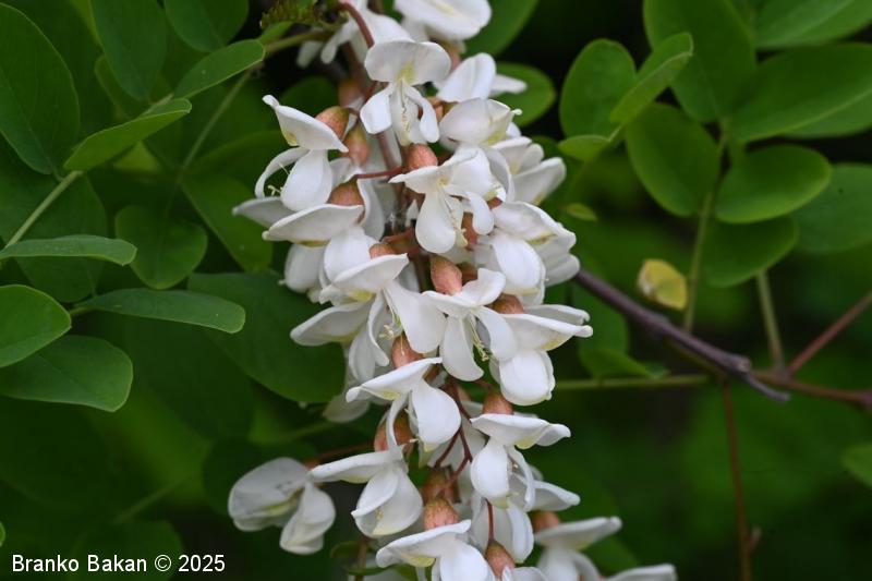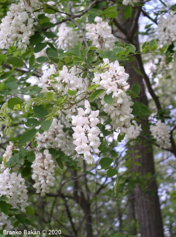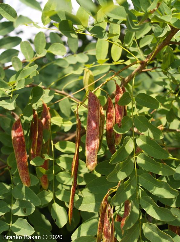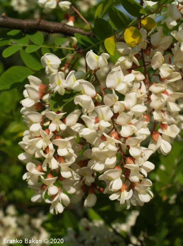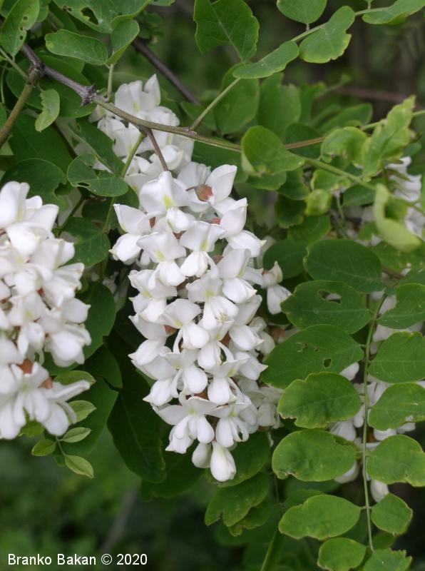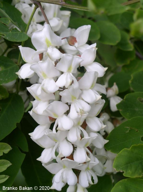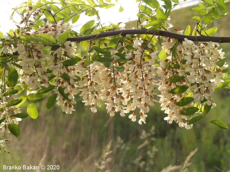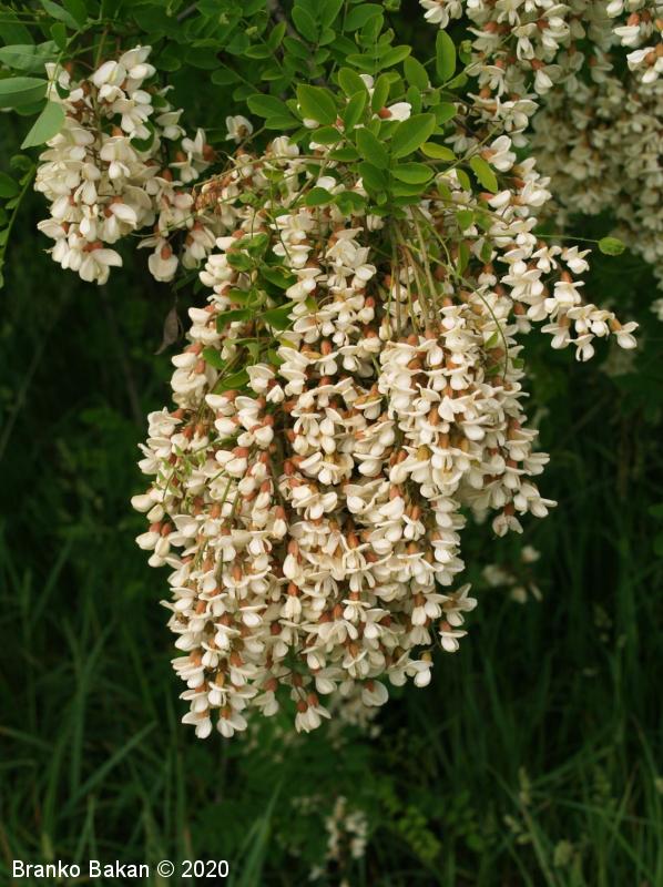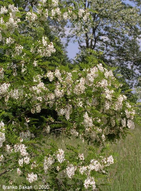 Posebnosti: vsa rastlina - z izjemo cvetov - je zelo strupena! Robinija izvira iz Severne Amerike in se je v Evropi sprva razširila kot okrasno drevo nekje v 17. stol., kasneje so jo širili zaradi lesa in bogatega cvetja, kar je še dandanes priljubljeno pri čebelarjih. Robinija je v svetovnem merilu v skupini najbolj invazivnih organizmov, čeprav se je marsikje že popolnoma naturalizirala.