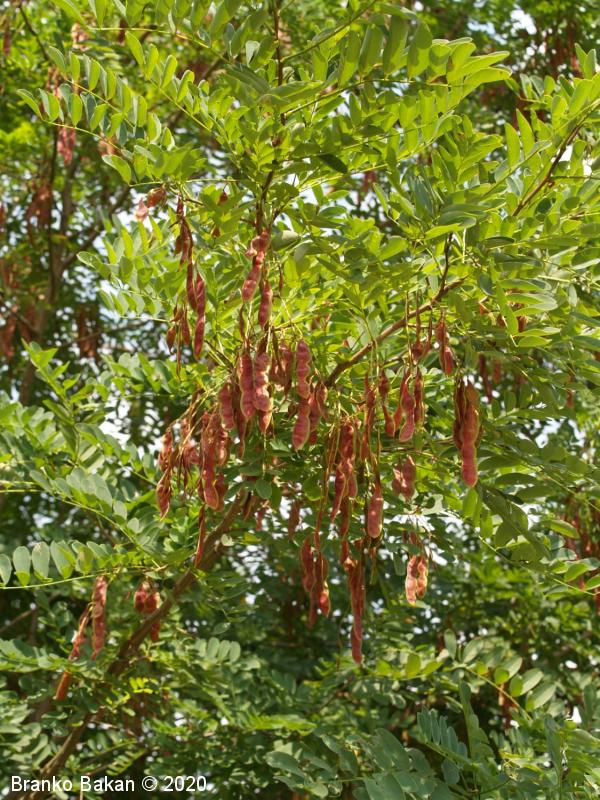 Opis: drevo z izrazito izbrazdanim lubjem in trnatimi poganjki (trni so enostavni). Listi so lihopernato sestavljeni iz eliptičnih do jajčastih, kratopecljatih lističev. Cvetovi so precej veliki, somerni (metuljasti), beli, zgoščeni v viseča, mnogocvetna, grozdasta socvetja, močno dehteči. Čašni listi so zrasli v zelo kratko, golo cev, ki ima na vrhu pet kratkih zobcev. Plod je strok, z valovitim zunanjim robom, ob zrelosti rdečkast, gol, 8-15 cm dolg.
