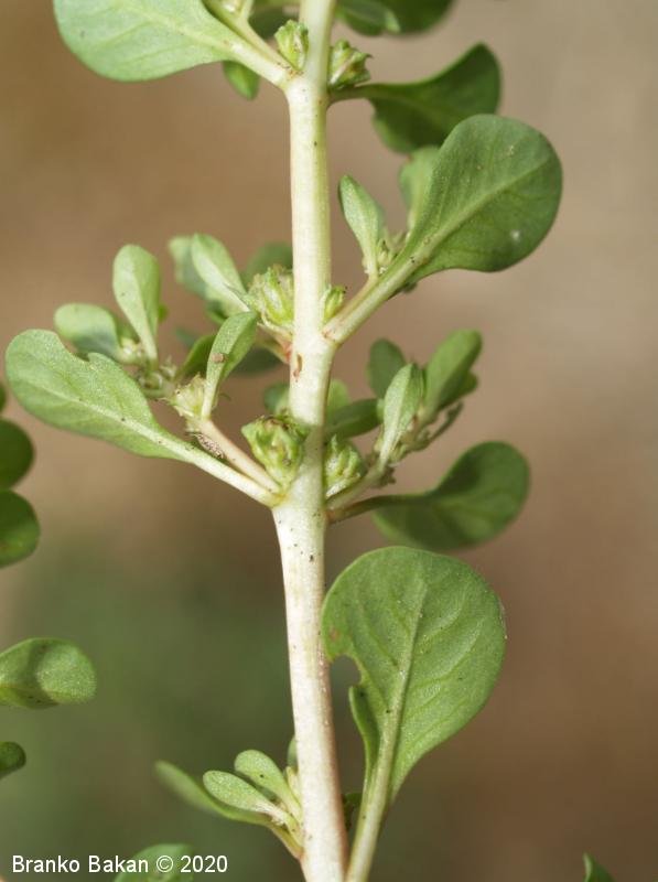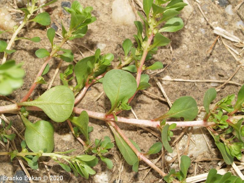 Opis: močno razrasla, polegla do kipeča, gola enoletnica, ki se na kolencih pogosto ukoreninja. Steblo je velikokrat rdečkasto. Listi so nasprotno razvrščeni, narobe jajčasti do lopatičasti, pecljati, goli, celorobi, na vrhu zaokroženi. Cvetovi so drobni, posamični v zalistjih. Venčni listi so rožnati ali belkasti, velikokrat manjkajo. Čaša je široko cevasta, nazobčana, gola, rdečkasta. Plod je okrogla glavica.