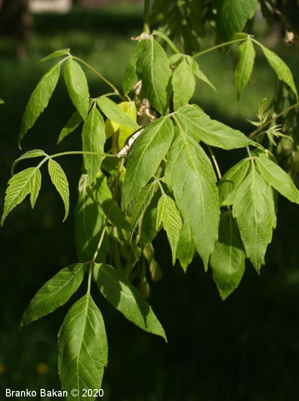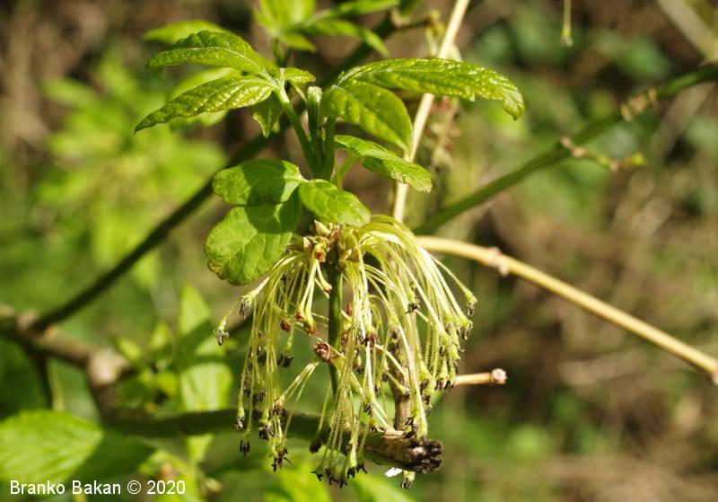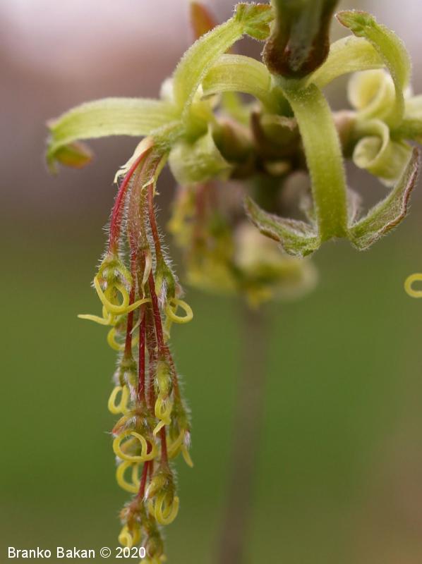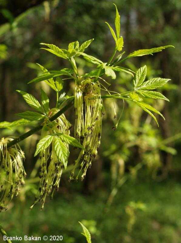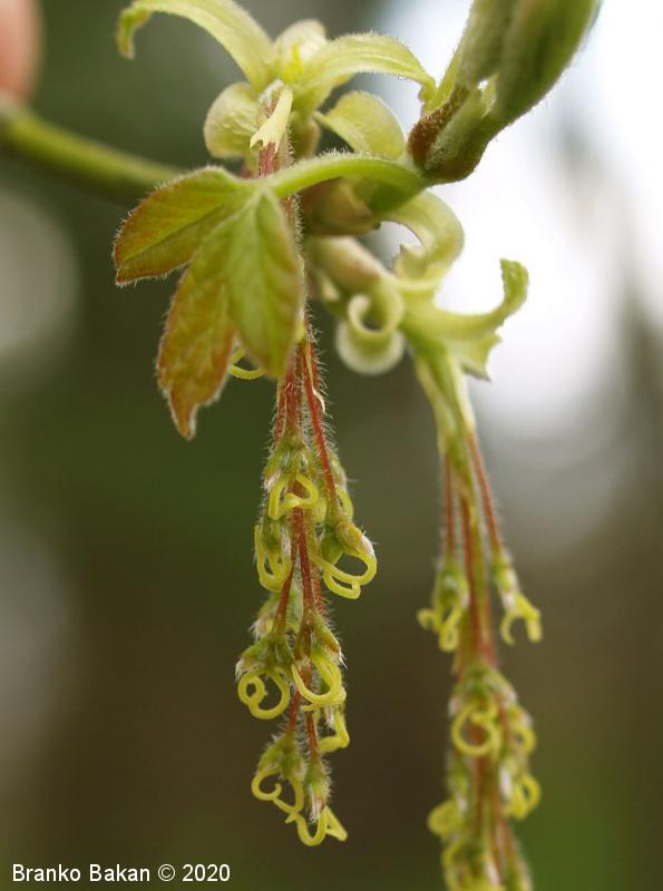 Opis: razvejano dvodomno drevo s sorazmerno gladkim, sivorjavim lubjem in dolgimi, ravnimi, zelenimi poganjki, ki imajo modrikast poprh. Listi so nasprotno razvrščeni, dolgopecljati, pernato sestavljeni iz jajčastosuličastih, pecljatih, po robu neenakomerno nazobčanih do krpatih segmentov (vsaj končni segment običajno krpat). Tako ženski kot moški cvetovi so združeni v viseča šopasta ali grozdasta socvetja, brez cvetnega odevala, moški cvetovi izstopajo po rdečih prašnikih, ženski cvetovi po dvodelni plodnici. Zreli plodovi so sestavljeni iz dveh krilatih plodičev, ki med seboj tvorita ostri kot.