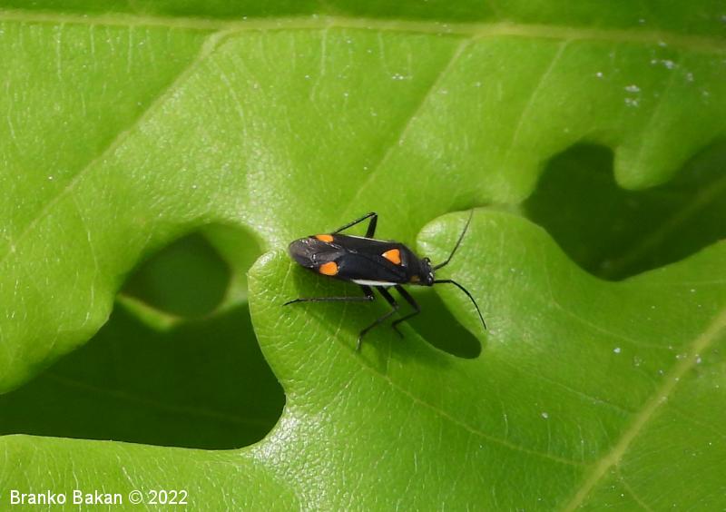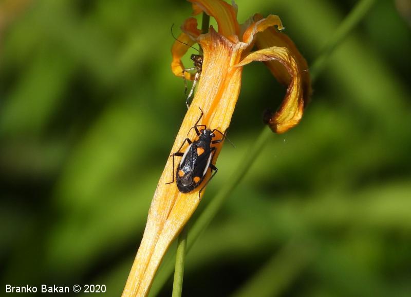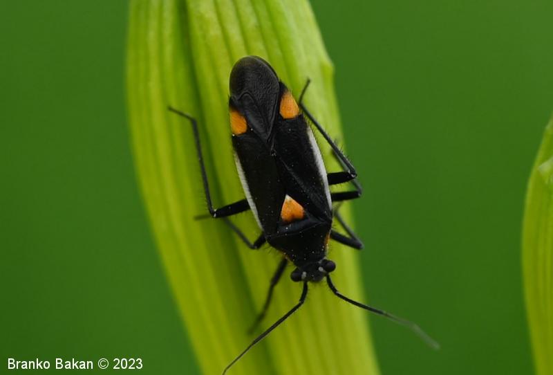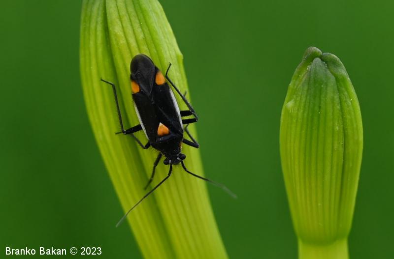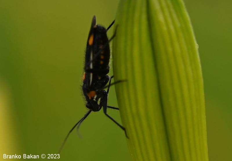 Odrasli osebki: telo je črno, gosto poraslo s črnimi dlačicami. Glava je drobna, trikotna, s tankimi, temnimi, dolgočlenastimi tipalnicami, ki so pogosto prelomljene. Ob očeh je pogosto bela lisa. Oprsje je trapezoidno, ob zunanjem robu večinoma z rumeno ali oranžno liso. Ščitek (scutellum) je trikoten, na sedini z oranžno ali rumeno, trikotno liso. Pokrovke so črne, ob zunanjih robovih ozko belo ali rumenkasto obrobljene, na vsaki konici z večjo oranžno ali rumeno liso. Opnasta krila so temna. Noge so dokaj dolge, vitke, črne, dlakave.