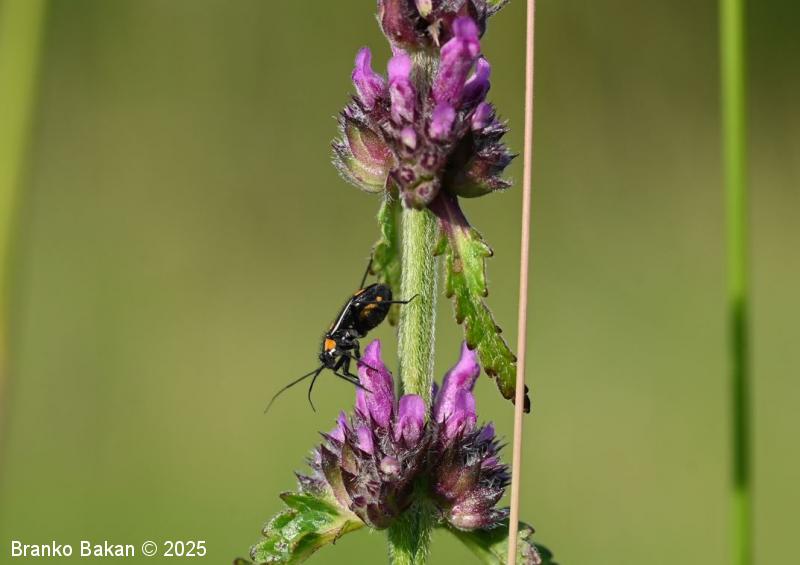 Odrasli osebki: telo je črno, gosto poraslo s črnimi dlačicami. Glava je drobna, trikotna, s tankimi, temnimi, dolgočlenastimi tipalnicami, ki so pogosto prelomljene. Ob očeh je pogosto bela lisa. Oprsje je trapezoidno, ob zunanjem robu večinoma z rumeno ali oranžno liso. Ščitek (scutellum) je trikoten, na sedini z oranžno ali rumeno, trikotno liso. Pokrovke so črne, ob zunanjih robovih ozko belo ali rumenkasto obrobljene, na vsaki konici z večjo oranžno ali rumeno liso. Opnasta krila so temna. Noge so dokaj dolge, vitke, črne, dlakave.