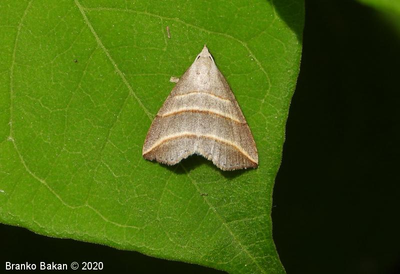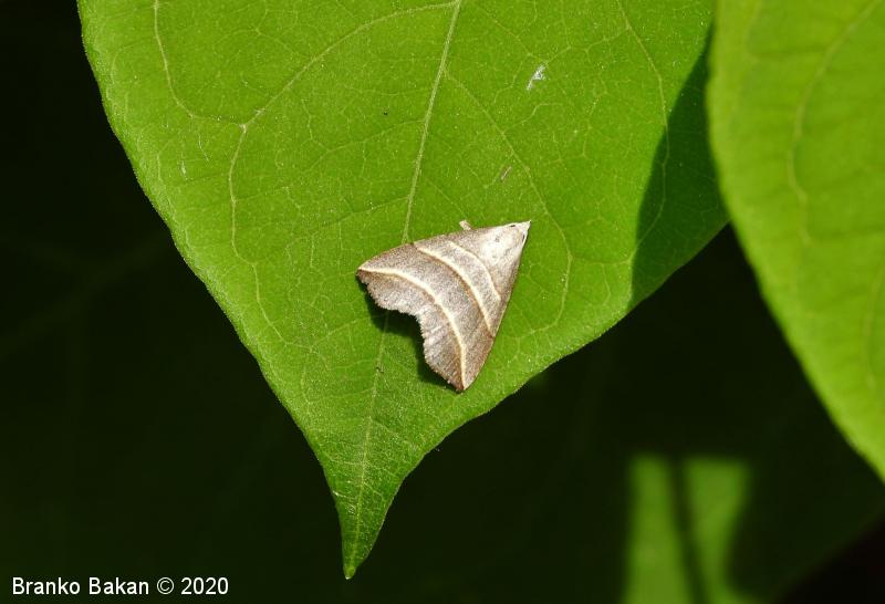 Odrasli osebki: zelo prepoznaven metulj, ki ima na prednjih kril tri prečne pasove, od katerih je zunanji najbolj ukrivljen. Krila so v mirovanju trikotno zložena. Prednja krila so sivorjava, na zunanjem robu nekoliko valovita in črtkano obrobljena, s po tremi ozkimi, temnorjavimi, svetlo obrobljenimi prečnimi pasovi. Zadnja krila so enovito umazanorjava, s temnejšim obrobnim delom.