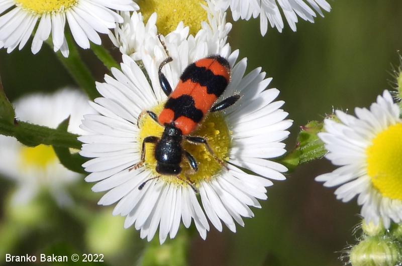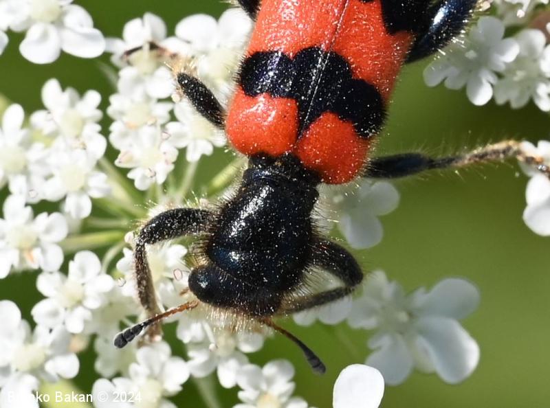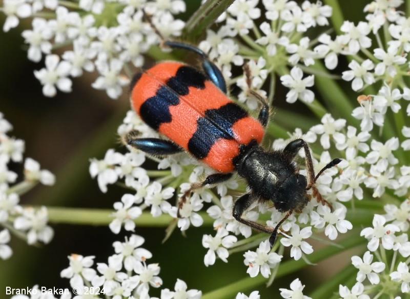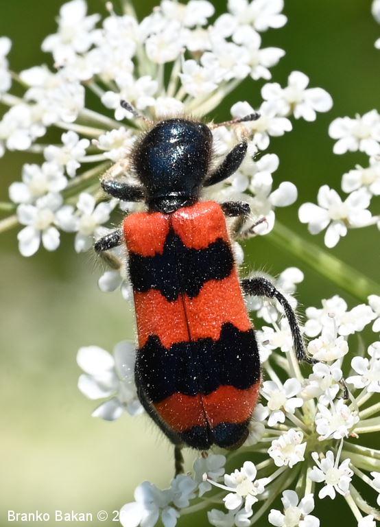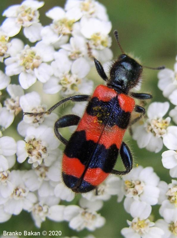 Odrasli osebki: živordeče in kovinsko temnomodro obarvani, zelo prepoznavni hrošči, ki so porasli s rumenkastimi, ščetinastimi dlakami. Glava je široka in kratka, z velikimi, temnimi očmi, kovinsko temno modra. Tipalnice so ozko členaste, na vrhu betičasto odeblejne, temne ali sivkaste. Oprsje je vitko (ožje od pokrovk), podolgasto, proti dnu nekoliko zoženo, gosto poraslo z dlakami, kovinsko temnomodro, fino drobno luknjičasto (pikčasto). Pokrovke so živordeče, v ramenskem delu ravne, proti dnu rahlo razširjene in nato koničasto zožene, zelo drobno luknjičaste, z dvema širokima, valovitima, prečnima, temnomodrima pasovoma in temnomodrimi konicami. Prvi pas na pokrovkah je v sredini trikotno koničast, skoraj nikoli ne predeli rdečega dela v dve izraziti lisi. Noge so črnomodre, razen členki stopalc na prednjih parih nog, ki so rumenorjavi. Obarvanost pokrovk je zelo variabilna!