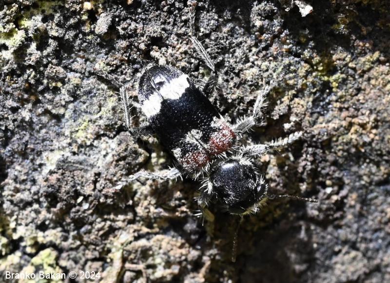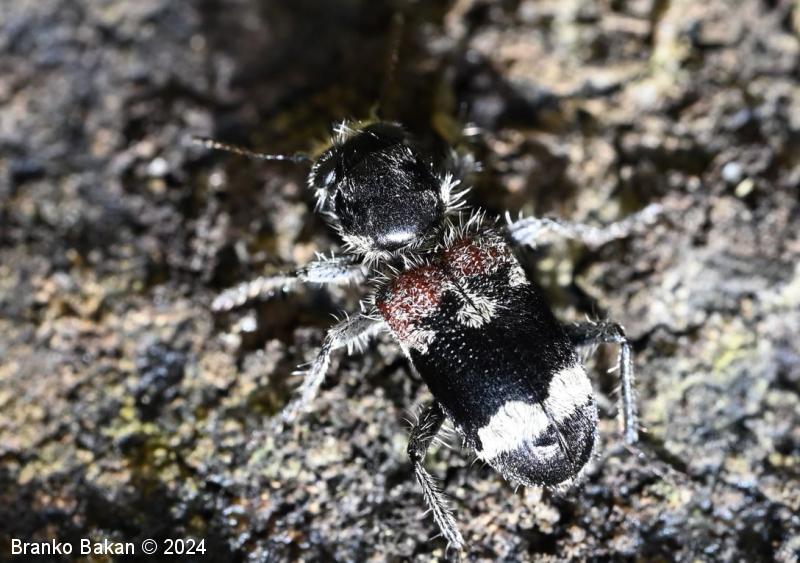 Odrasli osebki: srednje veliki, zelo hitri hrošči, ki so porasli s svetlimi ščetinastimi dlakami (predvsem po nogah). Telo je večinoma črno. Glava je široka in navzdol usmerjena, z velikimi, temnimi očmi ter močnimi čeljustmi. Tipalnice so vitke, kratkočlenaste. Oprsje je precej veliko, skoraj kvadratasto, ožje od pokrovk, črno. Pokrovke so le malo večje od ostalega telesa, črne, v ramenskem delu rdečerjave, z valovitim, širokim belim pasom na spodnjem delu in ozkim belim pasom, ki obroblja rdečerjav segment in je večinma reduciran na trikotno liso ob kateri sta pogosto še manjši, obstranski lisi. Noge so temne, porasle s svetlimi ščetinastimi dlakami.