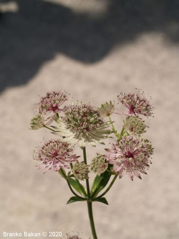 Opis: pokončna trajnica z golim, robatim steblom. Pritlični listi dolgopecljati, dlanasto deljeni v široko jajčaste, delno plitvo krpate segmente, ki so po robu ostro nazobčani, nekoliko bleščeči, vrhnji stebelni listi mnogo manjši, pogosto sedeči ali s kratkim pecljem. Socvetja (kobulčki) so združena v ovršni kobul, ki ga podpirajo čvrsti, zelenkastobeli ali rožnato nadahnjeni podporni listi (ogrinjalo), ki imajo 3-5 izrazite glavne žile, ki so med seboj mrežasto povezane. Cvetovi so beli ali rožnati, blagodehteči, pecljati. Vsak kobulček obdajajo šilasti do suličasti podporni listi (ogrinjalce), ki so tako dolgi kot kobulček (podvrsta major) ali do 2-krat daljši od kobulčka (podvrsta carinthiaca). Plod razpade na dva plodiča, ki sta luskasto hrapava.