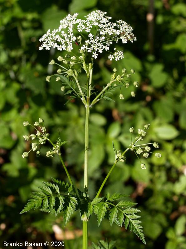 Opis: pokončna trajnica s krepko, navpično korenino. Steblo izbrazdano, gladko, golo. Listi so dolgopecljati (dno peclja je povečano v nožnico), pernato sestavljeni iz večjih segmentov (spodnja segmenta sta mnogo manjša kot preostali del lista), ki so prav tako deljeni. Segmenti zadnjega reda so ozkojajčasti, priostreni, krpati ali celi, po robu ostro nazobčani, goli, bleščeči. Cvetovi so združeni v ovršne kobule, beli, zunanji cvetovi so pogosto somerni, njihovi venčni listi so plitvo izrobljeni. Ogrinjalo (podporni listi kobula) ni razvito, ogrinjalce (podporni listi kobulčkov) je večlistno, lističi so jajčasti, po robu dlakavi, štrleči ali navzdol usmerjeni. Plod (karpofor) razpade na dva ozka plodiča, ki sta gladka, proti vrhu rahlo zožena, pri dnu z vencem zelo drobnih dlačic, 7-10 mm velika.