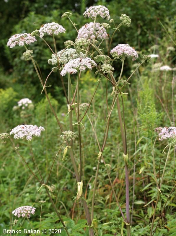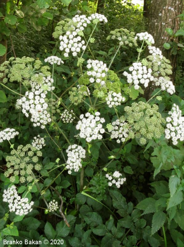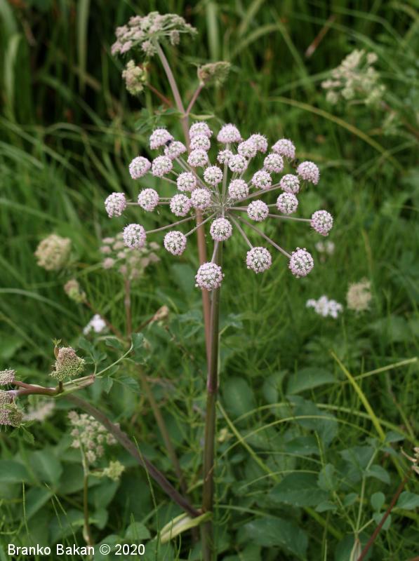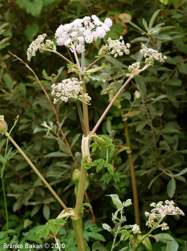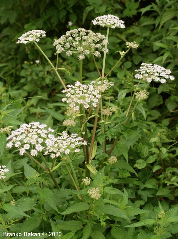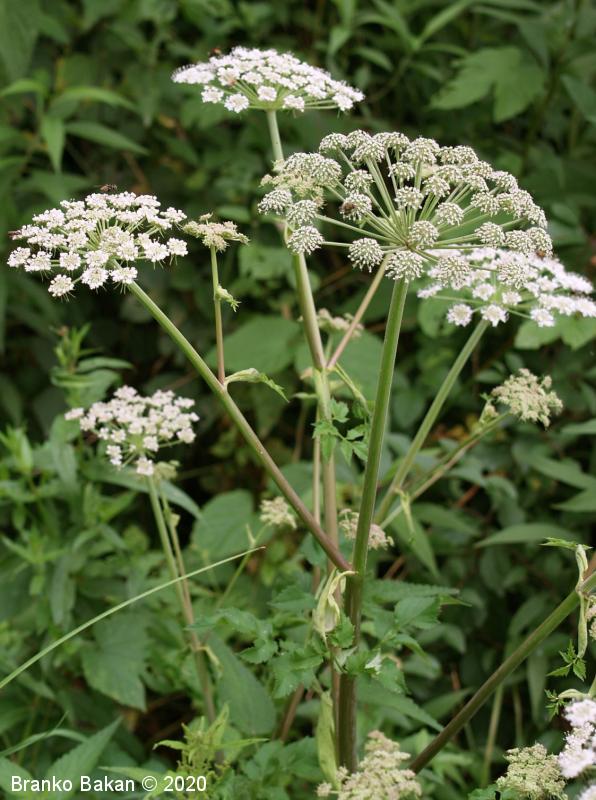 Opis: pokončna, zelo velika, razrasla večletnica s krepko korenino. Steblo je precej debelo, večinoma rdečkasto ali vijoličasto nadahnjeno, votlo, gladko, golo. Listi so dolgopecljati (dno peclja je močno povečano v "mehurjasto" nožnico), 3-krat pernato sestavljeni iz jajčastih do suličastih segmentov, ki so po robu drobno nazobčani, vsaj nekateri tudi delno krpati in asimetrični. Cvetovi so združeni v velike, poloble, ovršne kobule, beli ali rdečkasti, dehteči. Ogrinjalo (podporni listi kobula) 1- do 6-listno ali manjka, ogrinjalce (podporni listi kobulčkov) je večlistno. Plod (karpofor) razpade na dva ozka plodiča, ki sta široko krilata in izbrazdana, 4-8 mm velika.