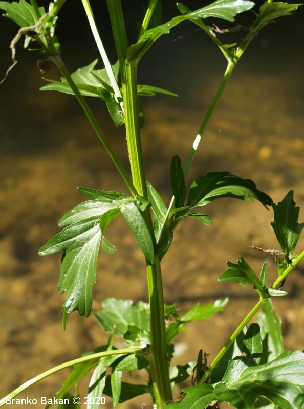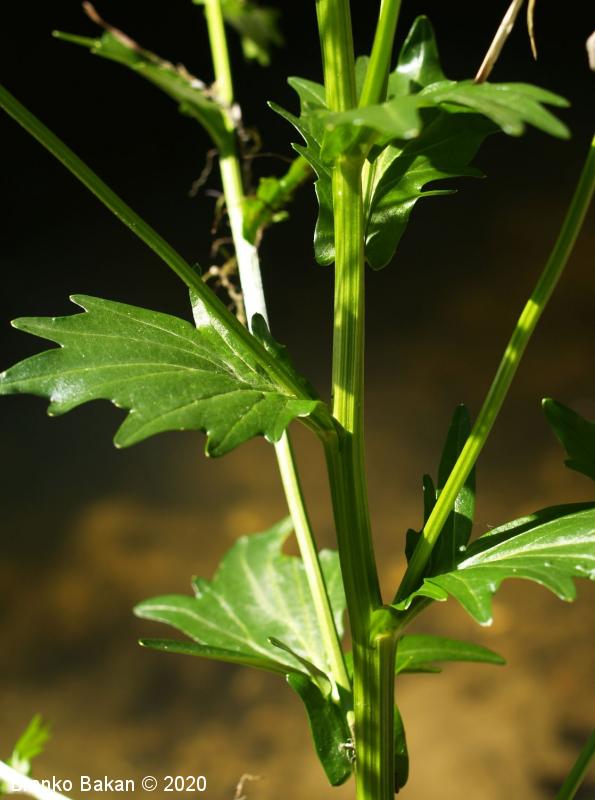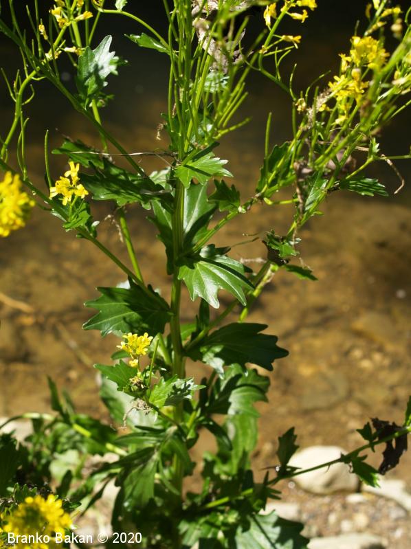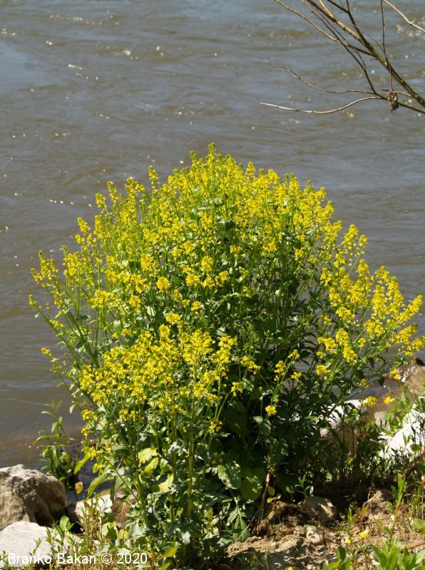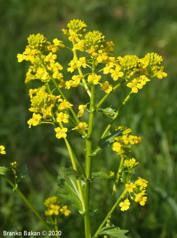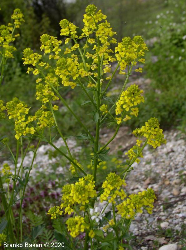 Opis: pokončna, gola dvoletnica. Steblo je gladko, izbrazdano, večinoma v cvetni regiji razvejano. Pritlični listi so dolgopecljati, združeni v rozeto, pernato nacepljeni v jajčaste, suličaste ali skoraj okrogle segmente (končni segment je mnogo večji od stranskih), ki so po robu neenakomerno plitvo topo nazobčani. Stebelni listi so sedeči, nekoliko usnjati, bleščeči, pri dnu puščičasti do srčasti, večinoma z enim parom ozkih stranskih rogljev ter večjim osrednjim segmentom, ki je po robu plitvo nazobčan do nacepljen. Cvetovi so zlatorumeni, zgoščeni v podaljšana, grozdasta socvetja, 4-števni. Venčni listi so na vrhu zaokroženi, z izrazito ploščico in žebico, ki je tako dolga kot čašni listi, ki so ozkosuličasti (hruškasti), rumenkasti, goli. Plod je podolgasta, ravna glavica (lusk), poševno štrleč, okrog 3 cm velik, gol, rahlo valovito naguban.