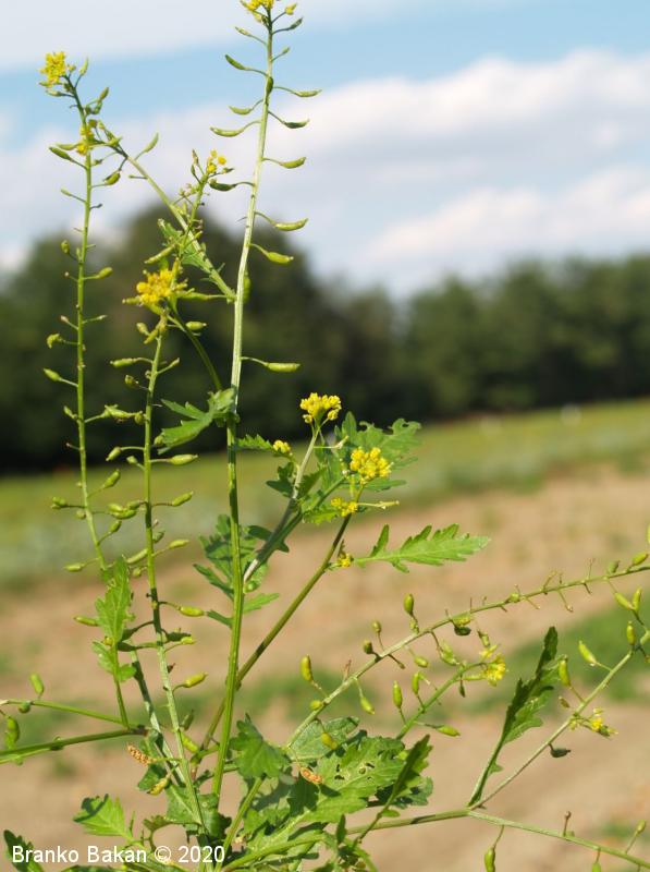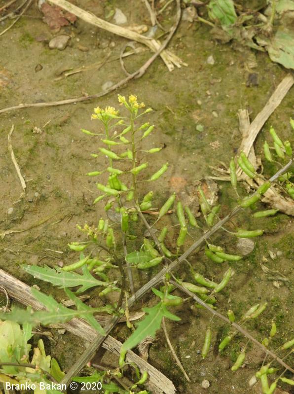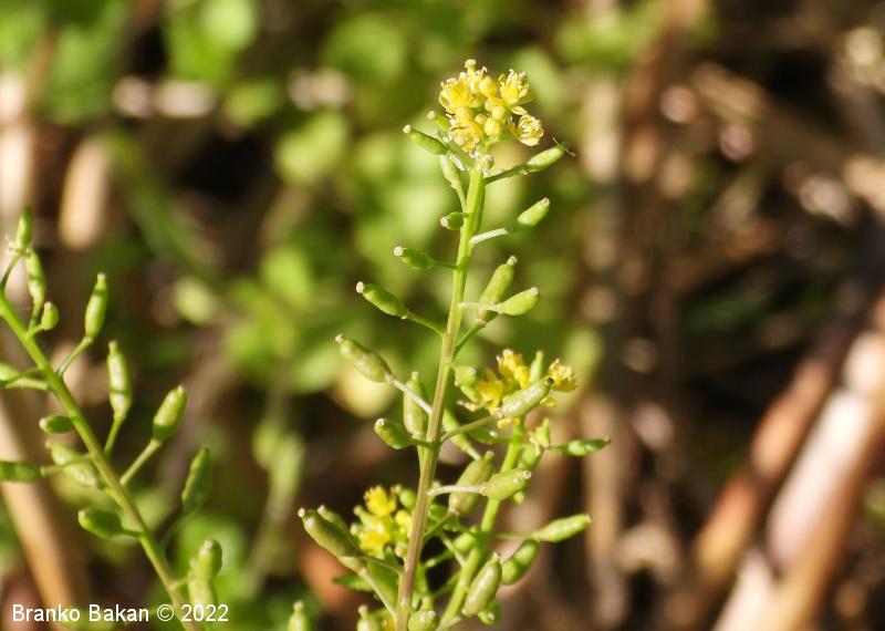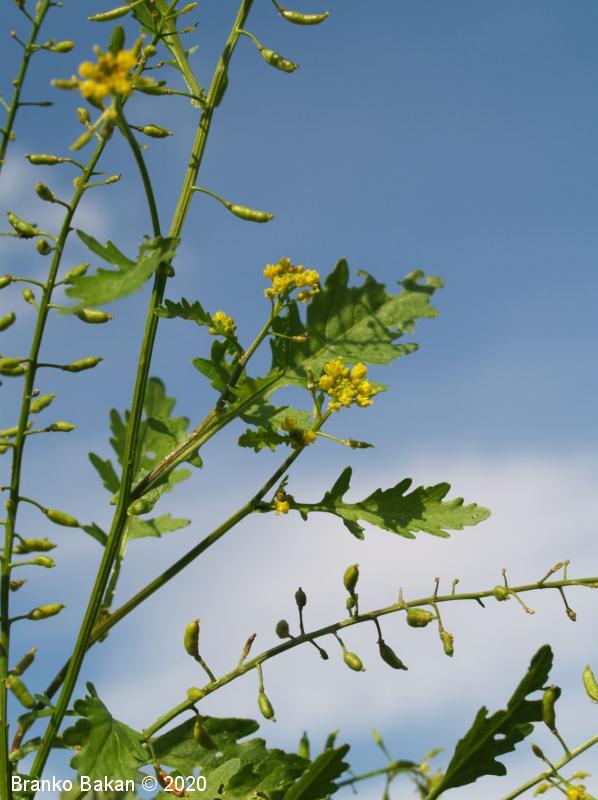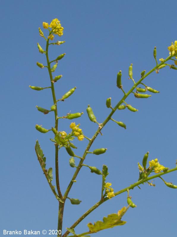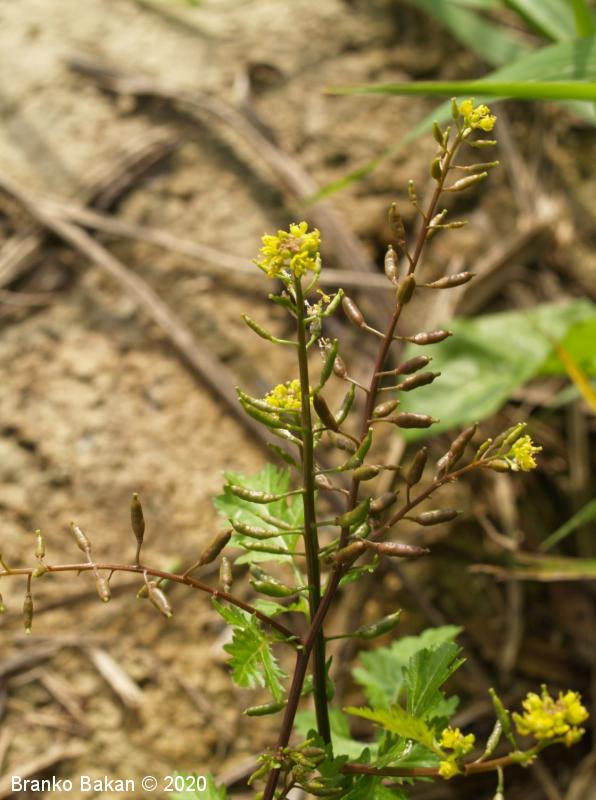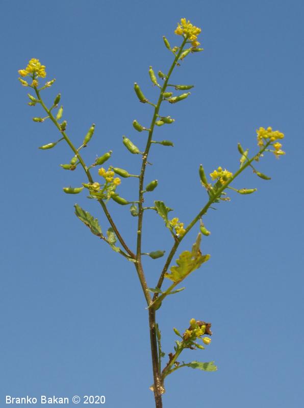 Opis: polegla, kipeča ali pokončna eno- ali dvoletnica. Steblo gladko, nekoliko robato, razraslo, bleščeče. Spodnji listi so dolgopecljati, pernato sestavljeni iz ozkojajčastih do suličastih segmentov (končni segment navadno večji od ostalih), po robu neenakomerno nazobčani. Stebelni listi so večinoma sedeči, pernato deljeni v ozke, enako velike roglje, ki so po robu topo nazobčani do nacepljeni. Cvetovi so bledorumeni, združeni v podolgovata grozdasta socvetja, 4-števni. Venčni listi so na vrhu zaokroženi, tako dolgi ali krajši od čašnih listov. Ti so jajčasti, priostreni, rahlo dlakavi. Plod je podolgasta, napihnjena glavica (lusk), nekoliko naguban, rahlo ukrivljen, gol, večinoma vodoravno štrleč.