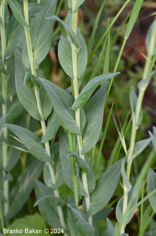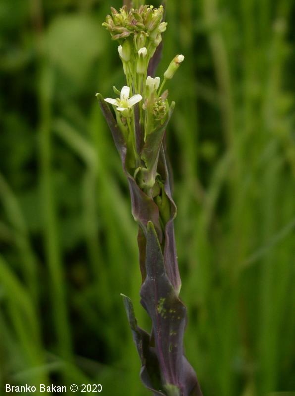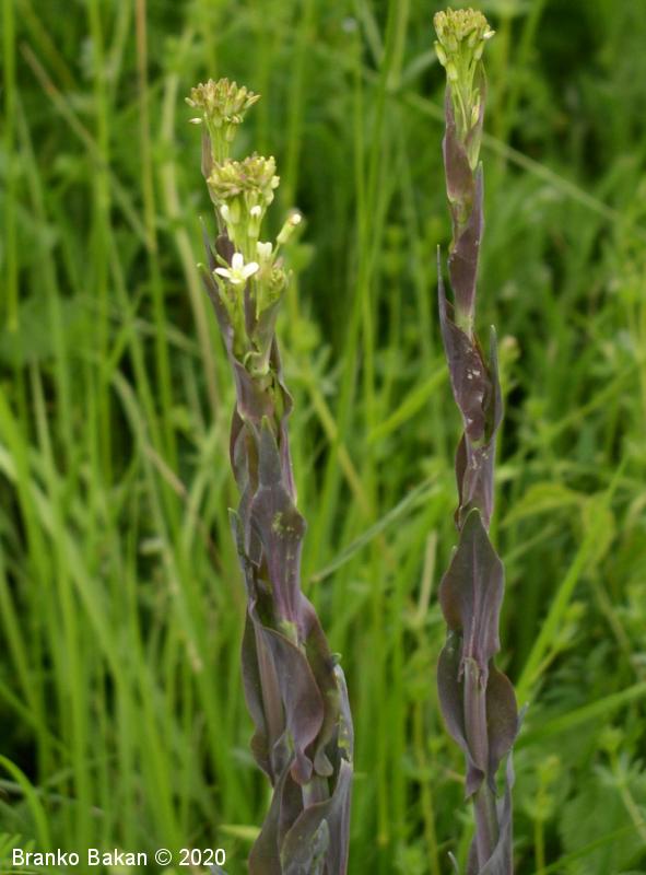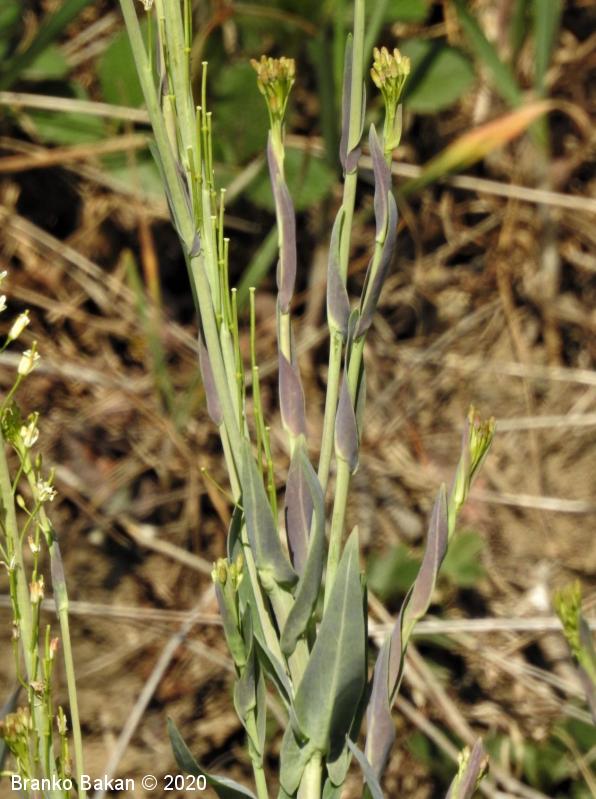 Opis: pokončna eno- ali dvoletnica s pritlično listno rozeto in gosto olistanim, nerazraslim, golim steblom. Pritlični listi so podolgasto suličasti, enostavni ali pernato nacepljeni, porasli z razraslimi dlakami, stebelni listi so enostavni, jajčastosuličasti, celorobi, sedeči, s puščičastim ali srčastim dnom, goli, sinjezeleni, pogosto rdečevijoličasti. Cvetovi so bledorumeni, 4-števni, združeni v močno podaljšano grozdasto socvetje. Venčni listi so večinoma navzgor štrleči, daljši od črtalastih čašnih listov. Plod je ozkopodologasta glavica (lusk), pokončen, prilegel ob steblo.