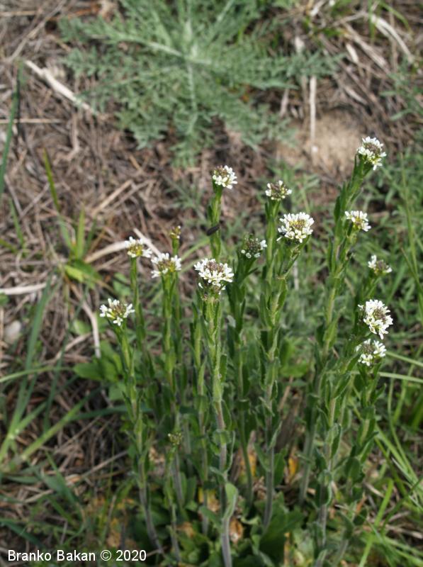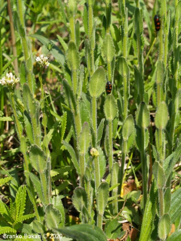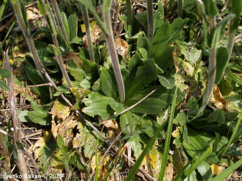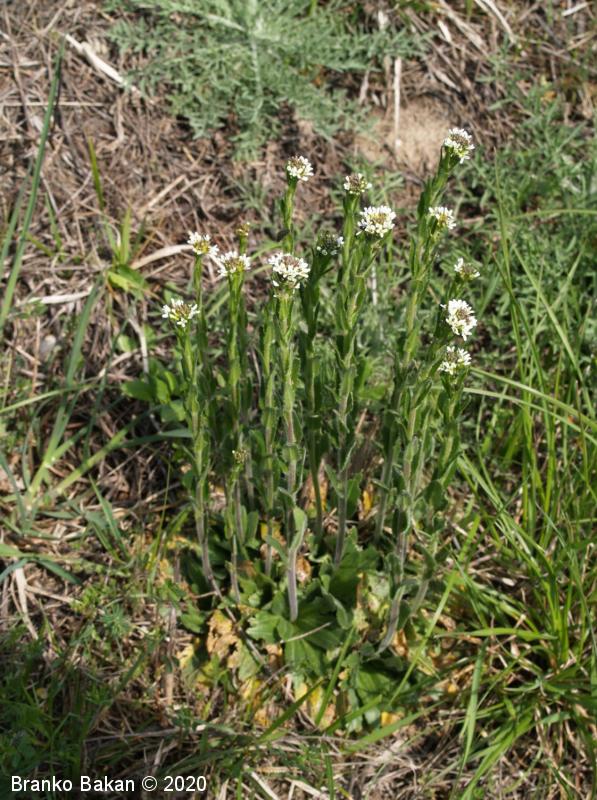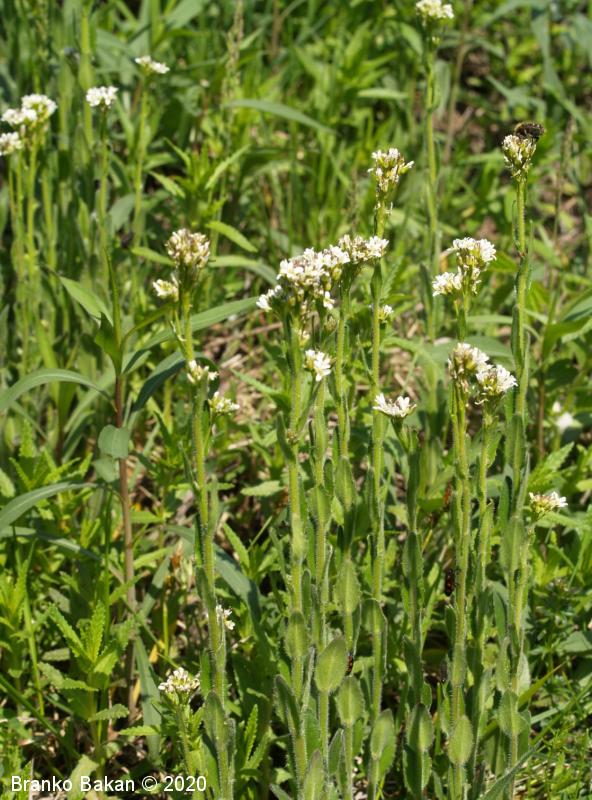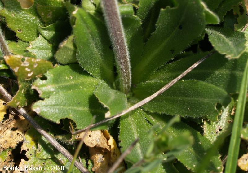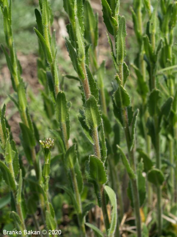 Opis: pokončna, večinoma nerazrasla, vsaj v spodnjem delu gosto štrlečedlakava (laski so enostavni in dvokraki, pecljati) dvoletnica s pritlično listno rozeto. Pritlični listi so podolgasto lopatičasti, enostavni, po robu grobo plitvo nazobčani, gosto dlakavi, stebelni listi so jajčastosuličasti, sedeči z rahlo srčastim do puščičastim dnom, po robu plitvo nazobčani, gostodlakavi. Cvetovi so beli, 4-6 mm veliki, združeni v podaljšano, grozdasto socvetje. Venčni listi so večinoma navzgor štrleči, na vrhu zaokroženi, daljši od šašnih listov. Plod je ozko podolgasta glavica (lusk), pokončno štrleč in nekoliko prilegel ob steblo.