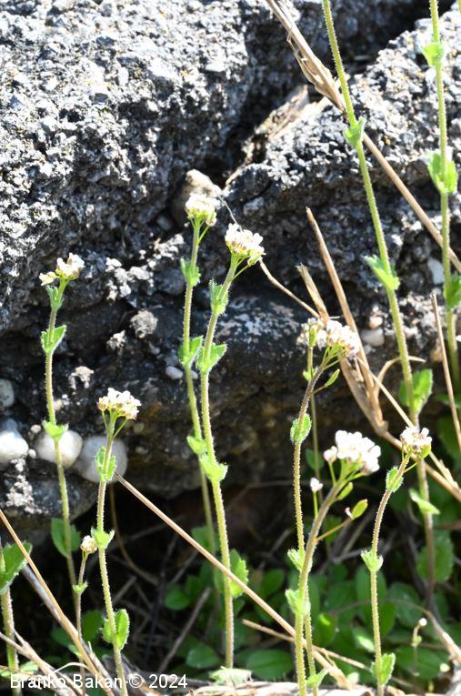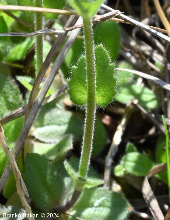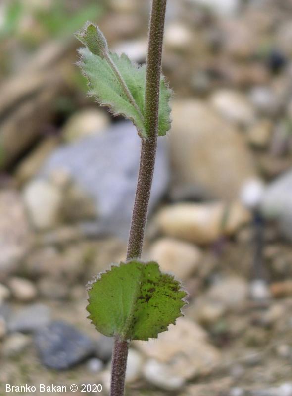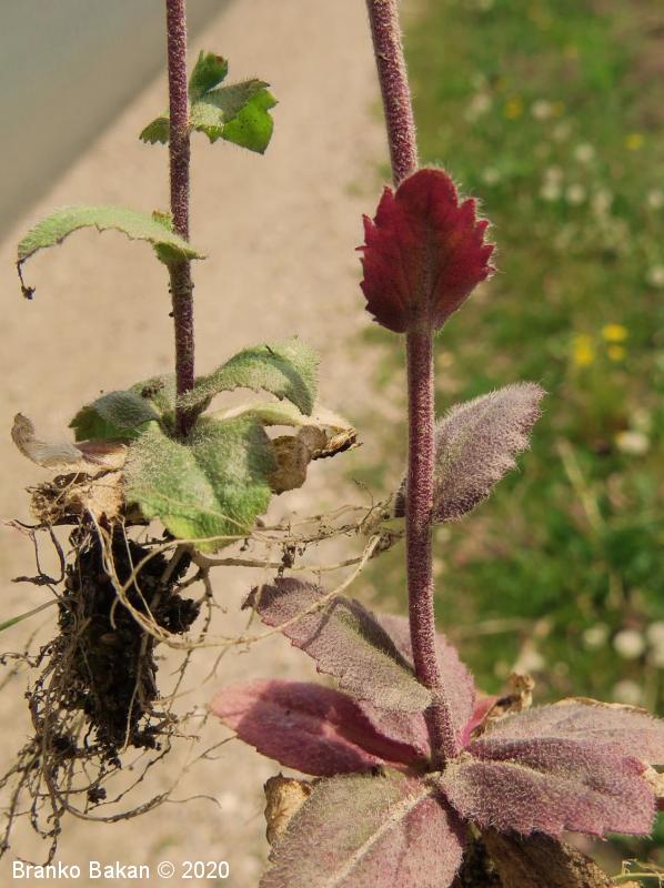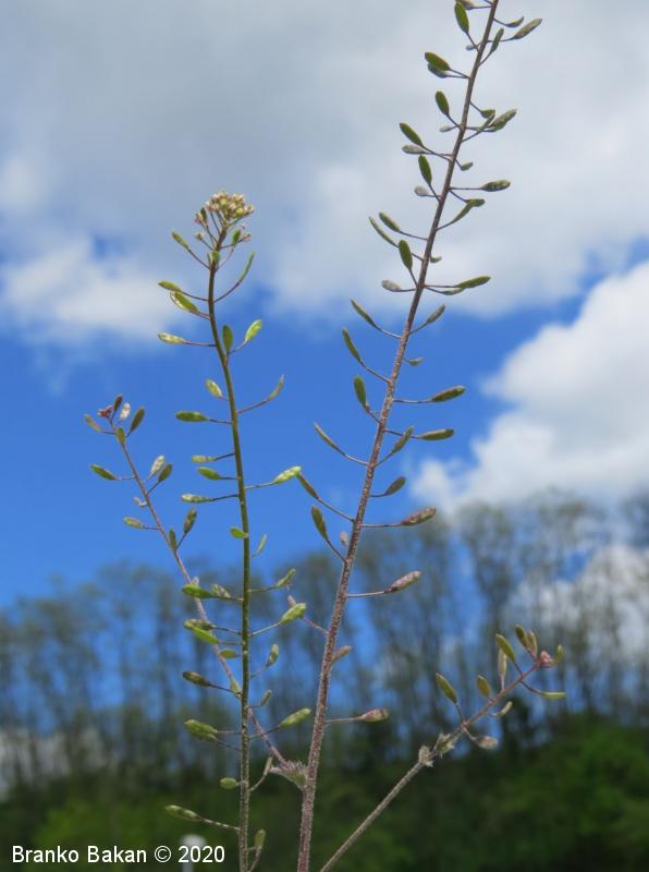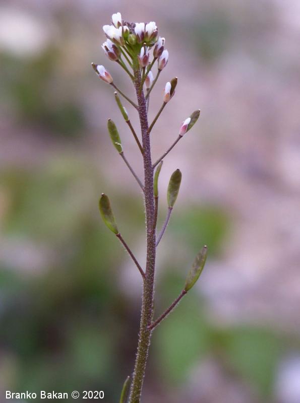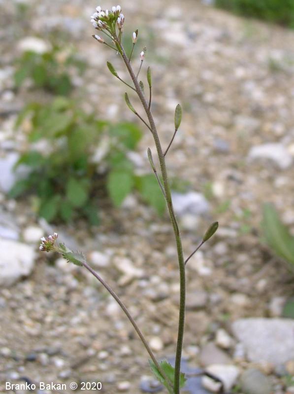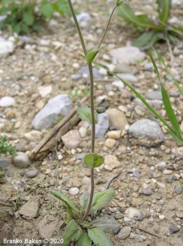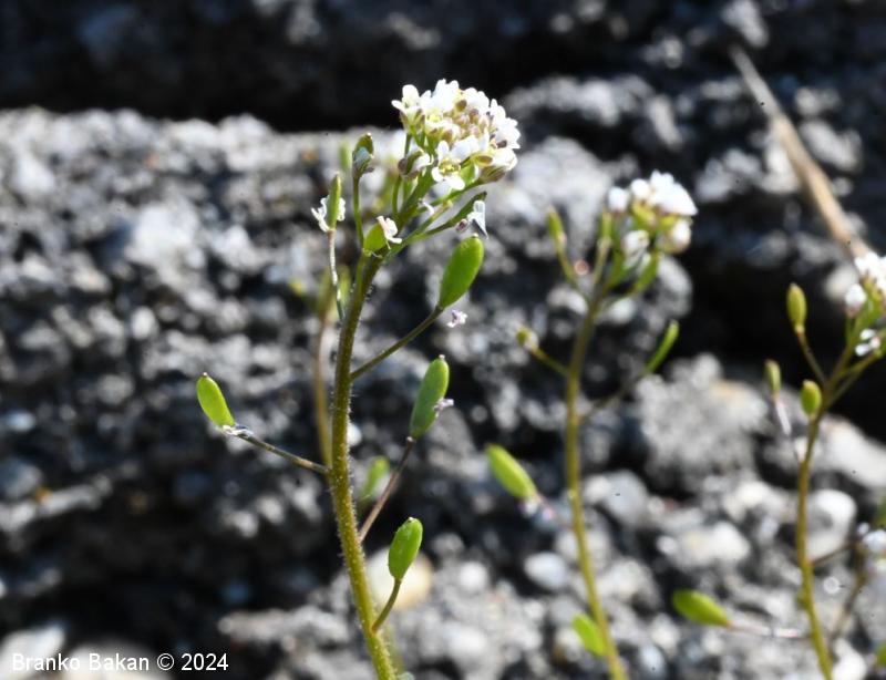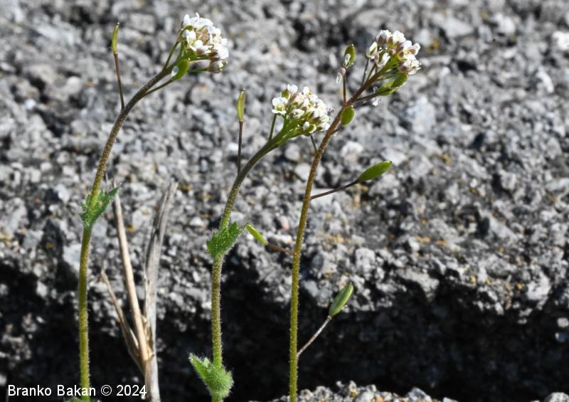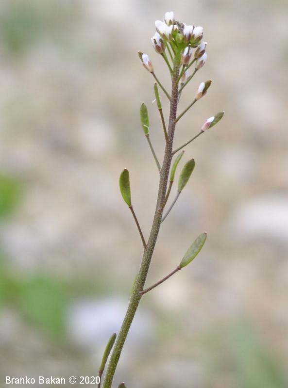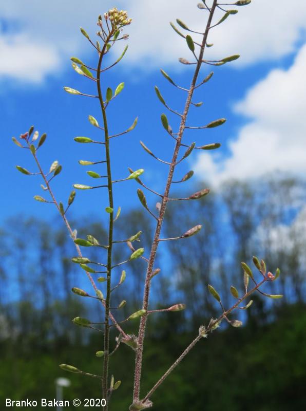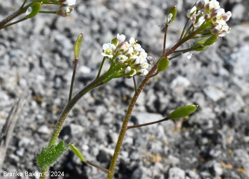 Opis: pokončna, štrlečedlakava enoletnica s pritlično listno rozeto. Priltični listi so lopatičasti ali širokojajčasti, po robu ostro nazobčani, gostodlakavi (laski so večinoma 2- do 4-kraki, sedeči), stebelni listi so jajčasti, sedeči s srčastim dnom, po robu grobo globoko nazobčani, porasli tudi z enostavnimi laski. Cvetovi so beli, združeni v podaljšano grozdasto socvetje, 4-števni, 2 do 3 mm veliki. Plod (lušček) je ozko podolgast do ozko jajčast, 4 do 6 mm velik, dolgopecljat, vodoravno do pokončno štrleč.