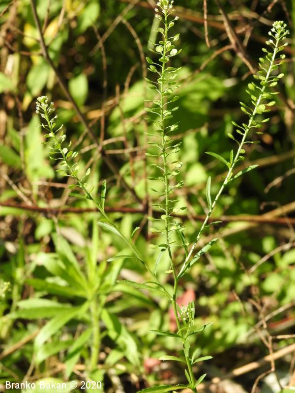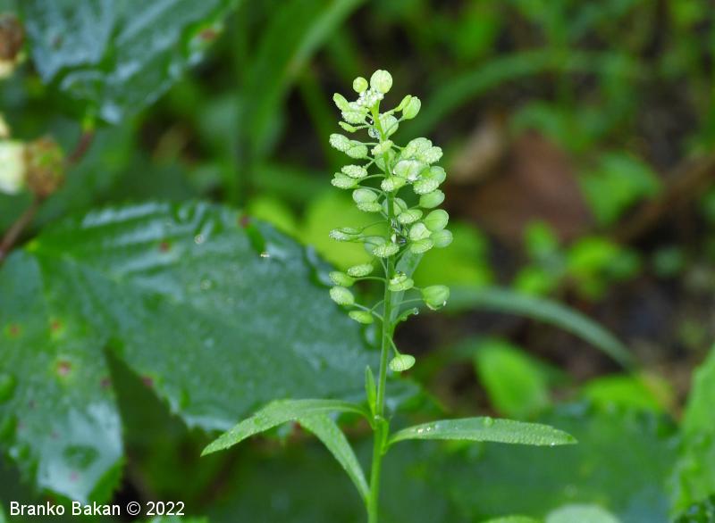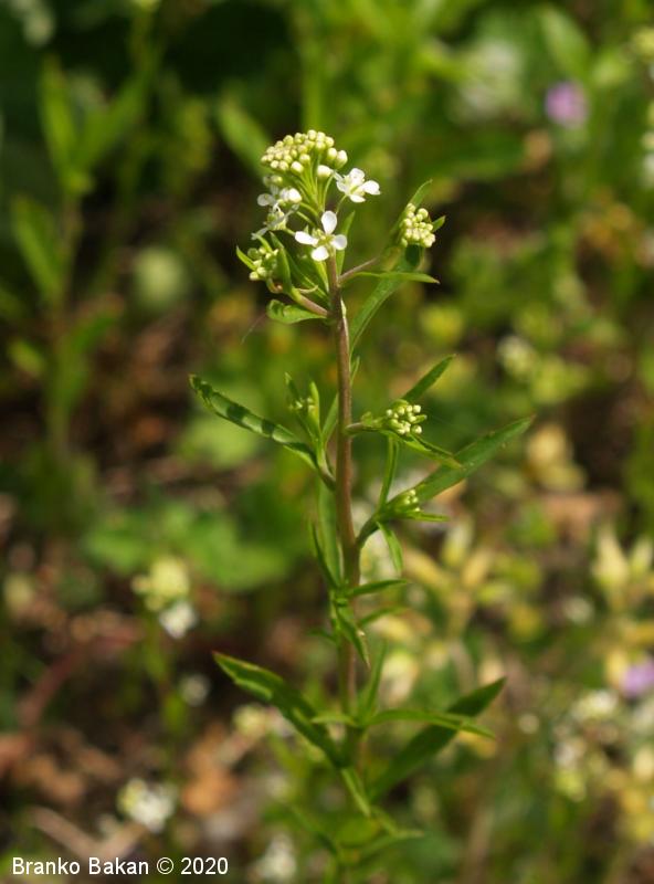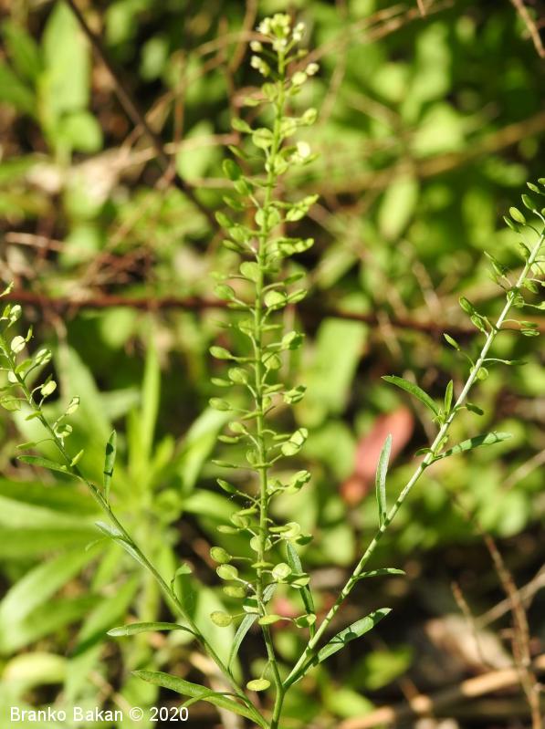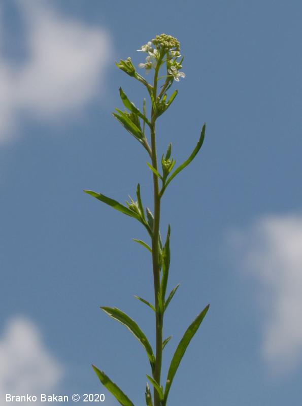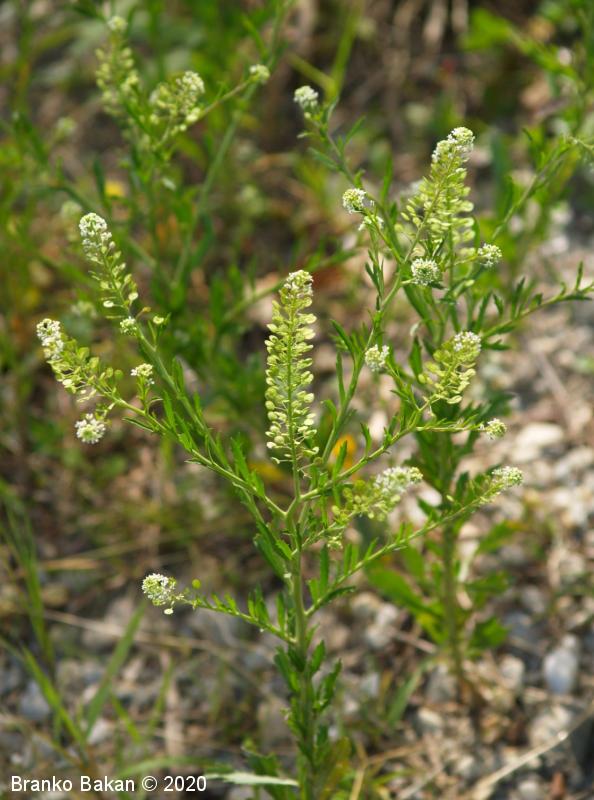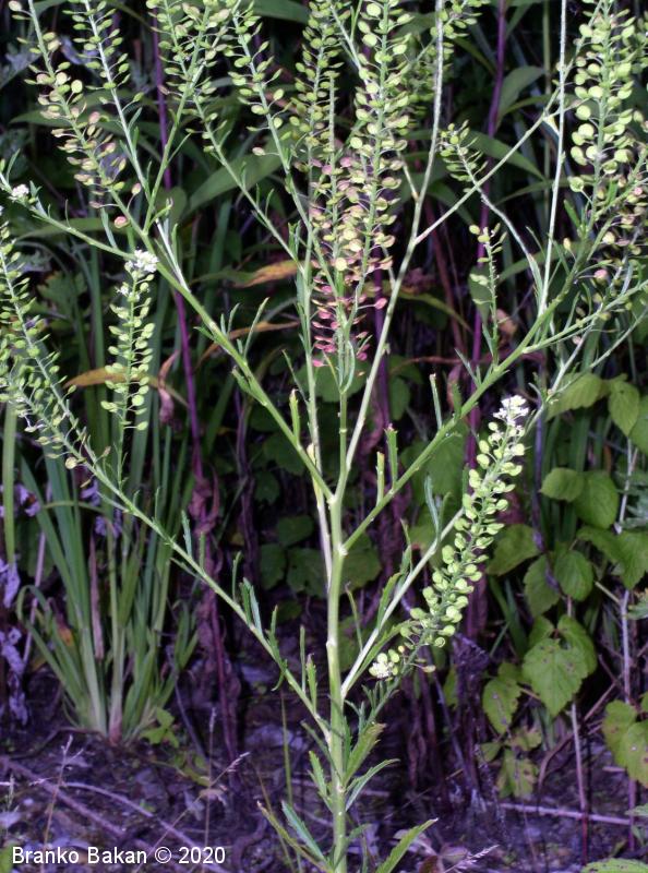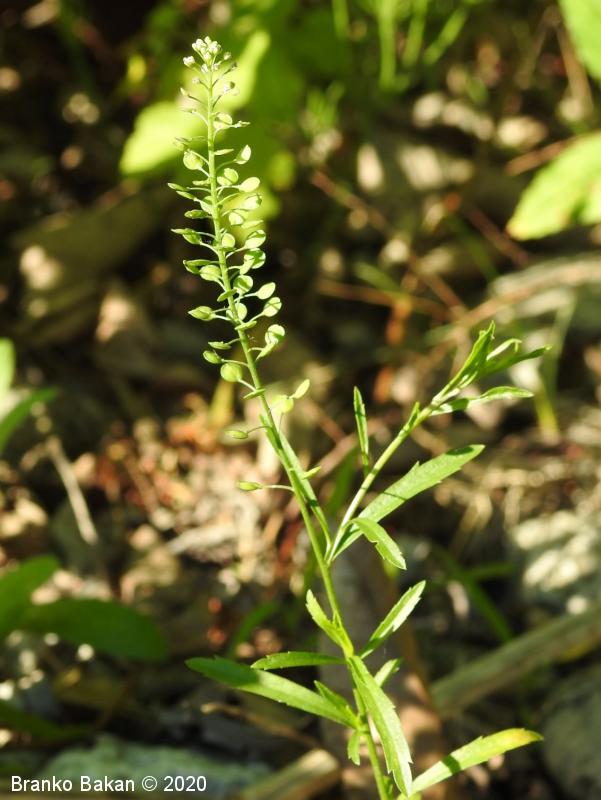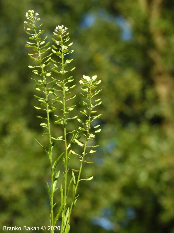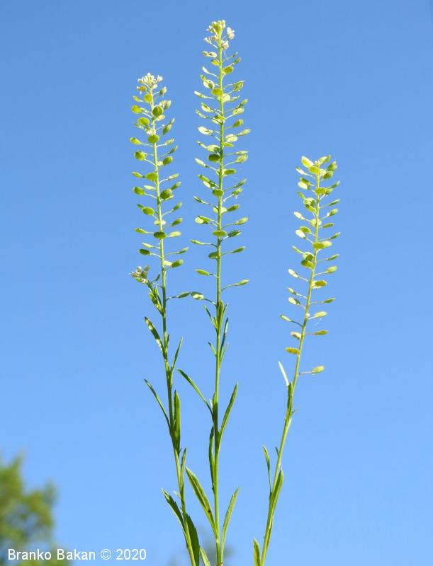 Opis: pokončna, v zgornjem delu razrasla eno- ali dvoletnica. Listi so jajčasto- do črtalastosuličasti, proti dnu "pecljato" zoženi, sedeči, večinoma nazobčani (nikoli deljeni!). Cvetovi so drobni, združeni v gostocvetna, podaljšana grozdasta socvetja, 4-števni. Venčni listi so beli, le malo daljši od čašnih listov, večinoma razviti. Plod (lušček) je skoraj okrogel, bočno ugreznjen, krilat, na vrhu ozko izrobljen, štrleč.