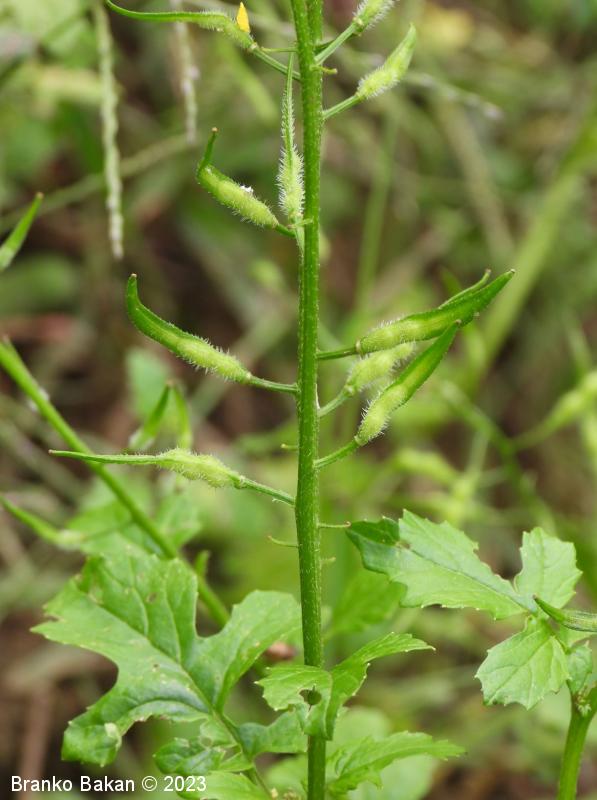Opis: pokončna enoletnica z robatim steblom. Listi so neenakomerno pernato deljeni v ozke stranske in široko jajčast, nacepljen končni segment, pecljati. Cvetovi svetlo rumeni, združeni v podaljšana, grozdasta socvetja, 4-števni. Venčni listi razločno deljeni v zaokroženo ploščico in ozko žebico, daljši od čašnih listov. Plod (lusk) je podolgasta glavica, v spodnjem delu valovit, napihnjen in porasel z belkastimi, štrlečimi dlakami, v zgornjem delu podaljšan v rahlo ukrivljen, gol kljunec.