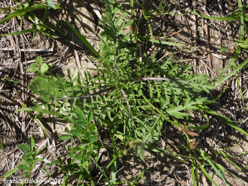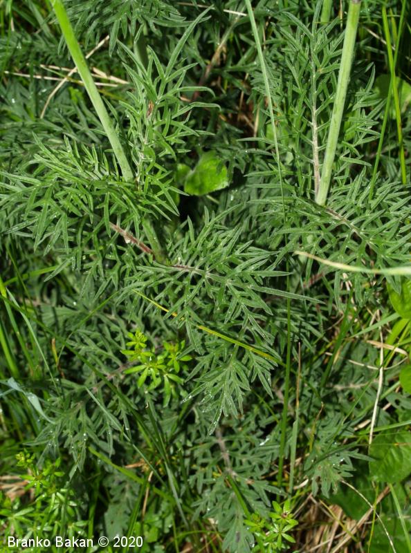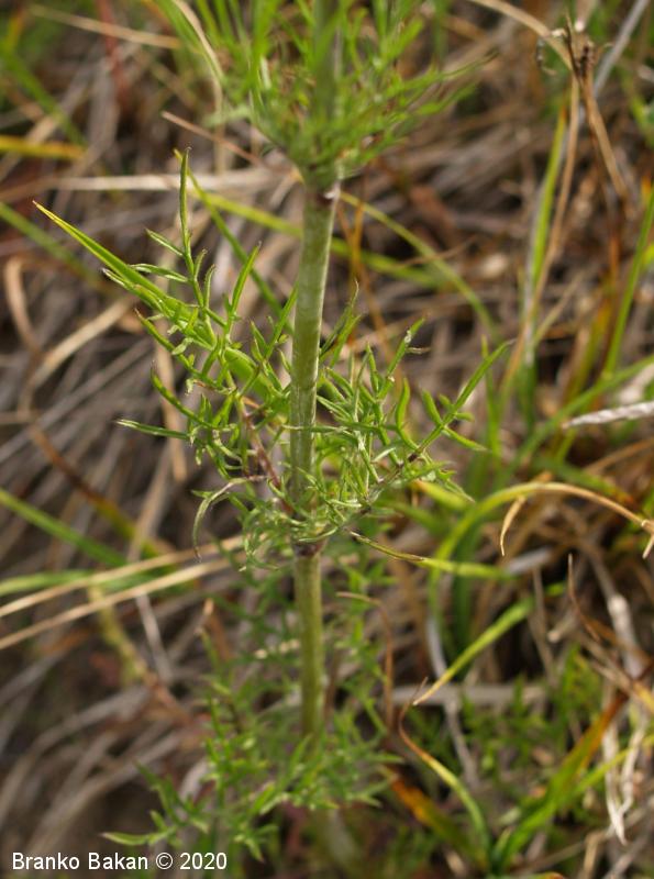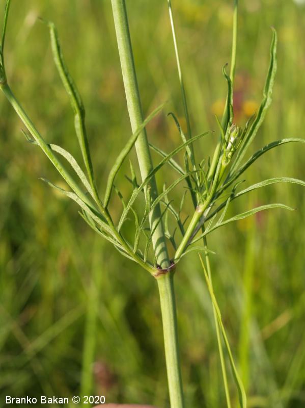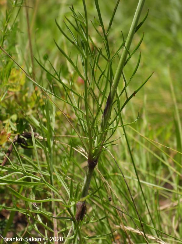 Opis: pokončna, delno razrasla trajnica. Steblo je golo, okroglo, sinjezeleno. Listi so nasprotno razvrščeni, pernato deljeni, pritlični listi so pecljati in pogosto deljeni v ozkosuličaste segmente z mnogo večjim končnim segmentom, stebelni listi so sedeči, pernato deljeni v ozkočrtalaste, do skoraj lasaste segmente, ki so pogosto nacepljeni, večinoma goli, vsi enako veliki. Cvetovi so modrovijoličasti, cevasti, somerni, 5-števni, združeni v pladnjasto glavičasta ovršna socvetja, ki jih podpirajo šilasti ovršni (ovojkovi) listi. Čašni listi so zrasli v cev, na vrhu s širokim ovratnikom in petimi, zelo kratkimi črnimi ščetinami, ki lahko tudi manjkajo. Plod je rožka (ahena).