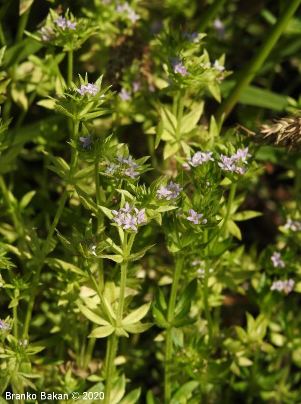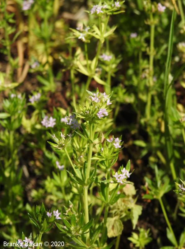 Opis: plazeča ali kipeča, močno razrasla enoletnica. Steblo je v prerezu 4-robo, večinoma poraslo s togimi, ščetinastimi dlakami. Listi so črtalasti do suličasti, po 4-5 nameščeni v vretencih, po robu porasli s srhkimi zobci, proti vrhu koničasto zoženi, sedeči, pri dnu zoženi. Cvetovi so bledovijoličasti, cevasto zvonasti, (venčna cev je mnogo daljša od čašnih listov), zgoščeni v ovršna socvetja, ki jih podpirajo ovršni listi. Plod je sestavljen iz dveh plodičev.