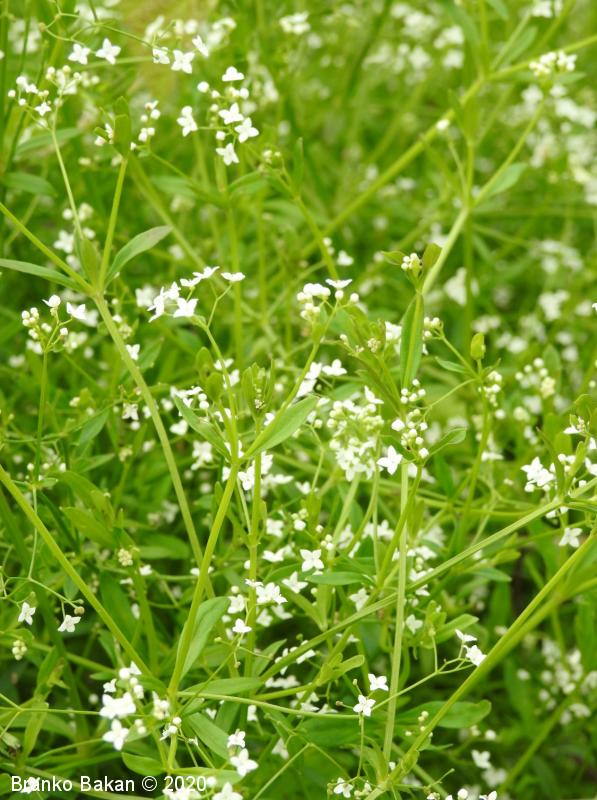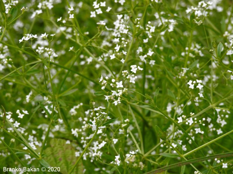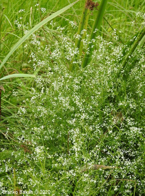 Posebnosti: vrsta pogosto uspeva v močvirni in obrežni vegetaciji, a zelo redko skupaj s podobno močvirsko lakoto (Galium palustre).