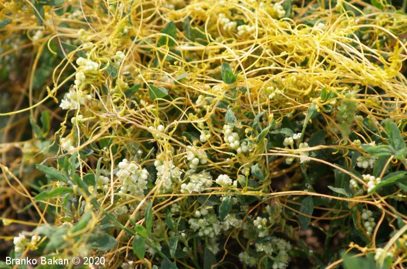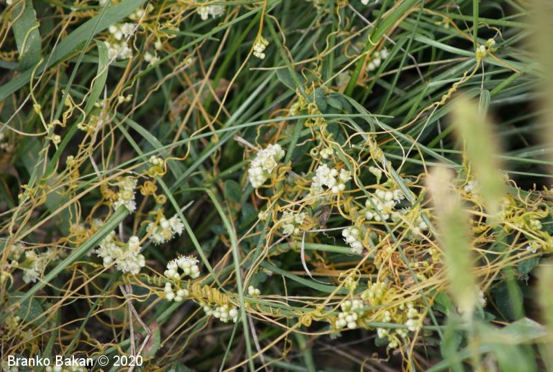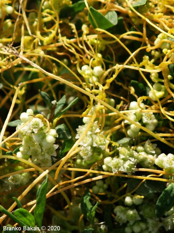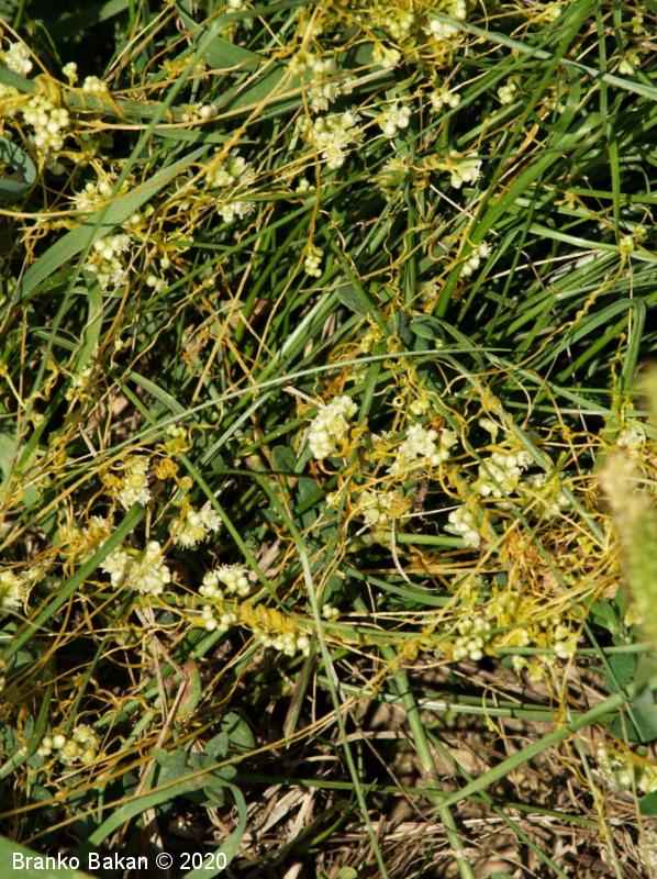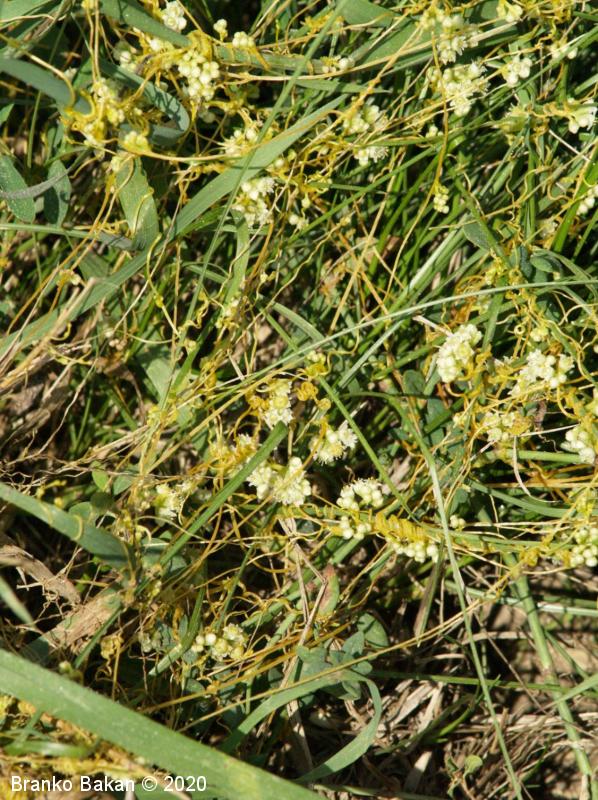 Opis: plazeča, močno razrasla enoletnica z oranžnim ali rumenkastim, dokaj čvrstim, ovijajočim se steblom. Pravi listi manjkajo, na steblu so razviti le drobni luskolisti. Cvetovi so drobni, zgoščeni v klobčasta do latasto razrasla, obstranska socvetja, beli ali zelenkasto beli, skoraj brez vonja, zvonasti, razločno pecljati. Venčni listi so med seboj zrasli, med vsakim parom je po en prašnik, ki je zrasel z močno nacefranimi goltnimi luskami, ki so skoraj tako dolge kot venčne krpe. Plodnica je nadrasla, okroglasta, z dvema vratovoma, ki sta tako dolga kot plodnica, na vrhu z glavičastima brazdama. Plod je glavica, ki se odpira s prečnim šivom, široka do 3 mm.