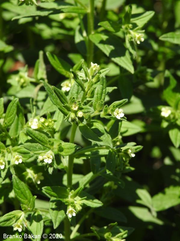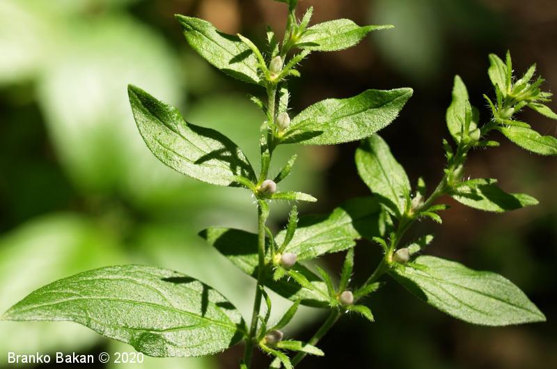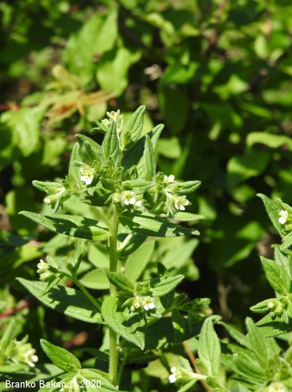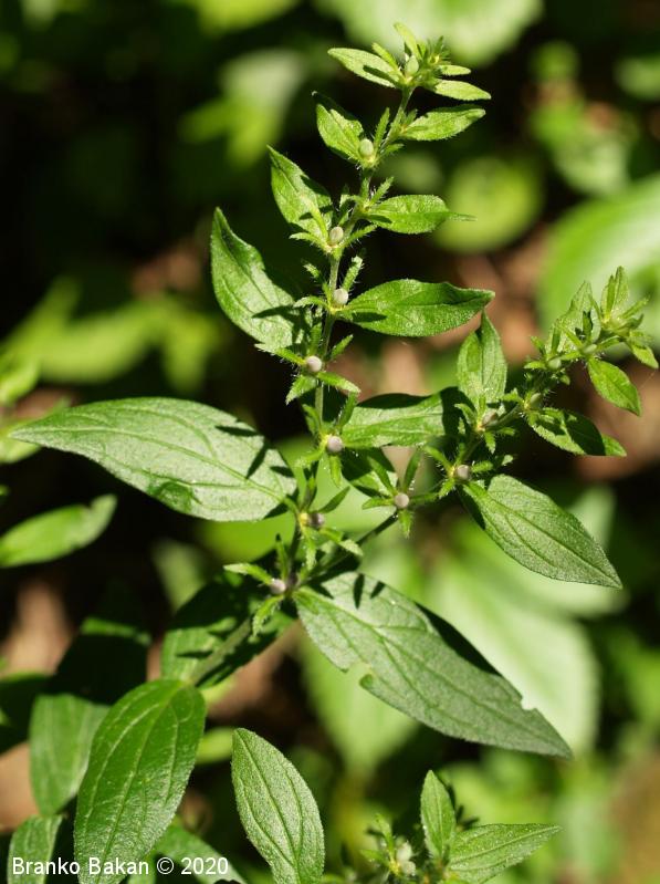Opis: pokončna, srhkodlakava trajnica, ki je v zgornjem delu pogosto razrasla. Listi so ozkosuličasti, sedeči, enostavni, celorobi, proti dnu zoženi, na vrhu koničasti, mrežasto žilnati (stranske žile se lokasto povezujejo). Cvetovi so drobni, umazano- do rumenkastobeli, združeni v podaljšana, vijačkasta socvetja, vsak cvet z majhnim podpornim listom. Plod razpade na 4 gladke, izredno trde, bleščeče plodiče.