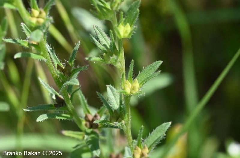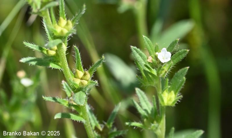 Opis: pokončna, srhkodlakava enoletnica, ki je v zgornjem delu pogosto razrasla. Listi so ozkosuličasti ali jajčasti, sedeči, enostavni, celorobi, proti dnu zoženi, na vrhu koničasti, z vidno osrednjo žilo. Cvetovi so drobni, umazano- do rumenkastobeli, združeni v podaljšana, vijačkasta, pogosto 3-vejnata socvetja, vsak cvet z majhnim podpornim listom. Venčni listi so med seboj zrasli v cev, prašniki prirasli ob dno venčne cevi. Čašni listi so ozkočrtalasti, dlakavi, ob zrelostu plodu zvezdasto razprti. Plod razpade na 4 rahlo bradavičaste, izredno trde plodiče.