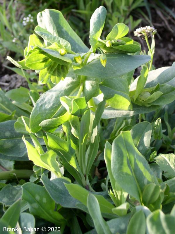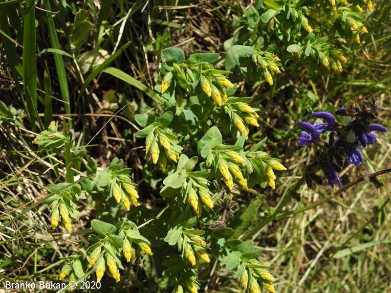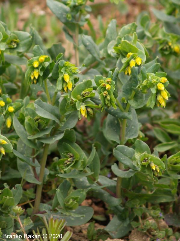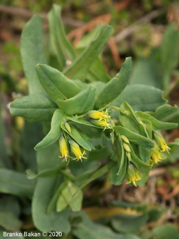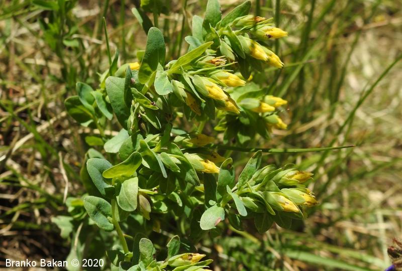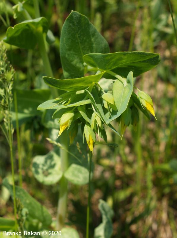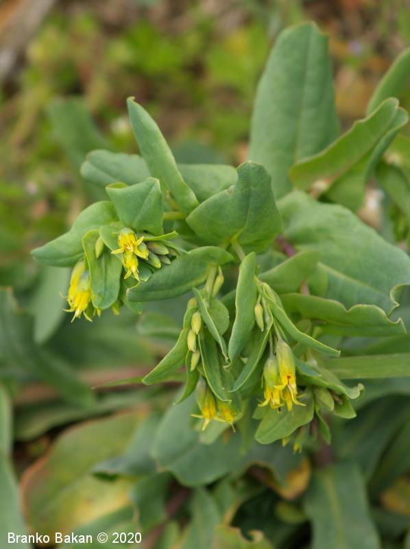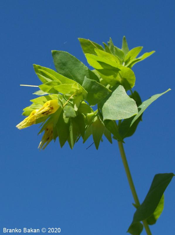 Opis: precej razrasla, pokončna, gola dvoletnica. Spodnji listi so podolgasto jajčasti do skoraj lopatičasti, podaljšani v dolg pecelj, enostavni, celorobi, sinjezeleni, belo lisasti, zgornji stebelni listi so jajčasti, s srčastim dnom objemajo steblo. Cvetovi so rumeni (pogosto z rdečkastimi ali vijoličastimi lisami), kimasti, navidezno zvonasti, združeni v podaljšana, vijačkasta, pogosto 3-vejna socvetja, vsak cvet s podpornim listom. Venčni listi so ozkočrtalasti, v spodnji polovici zrasli v venčno cev in zapirajo vhod vanjo. Čašni listi med seboj niso zrasli, tako dolgi kot venčna cev. Plod razpade na dva plodiča.