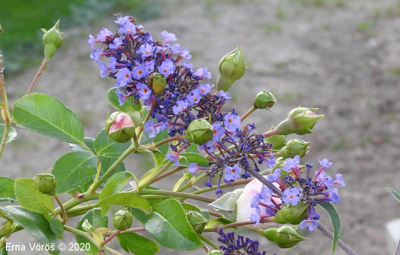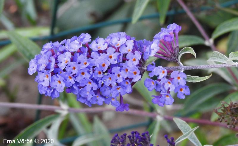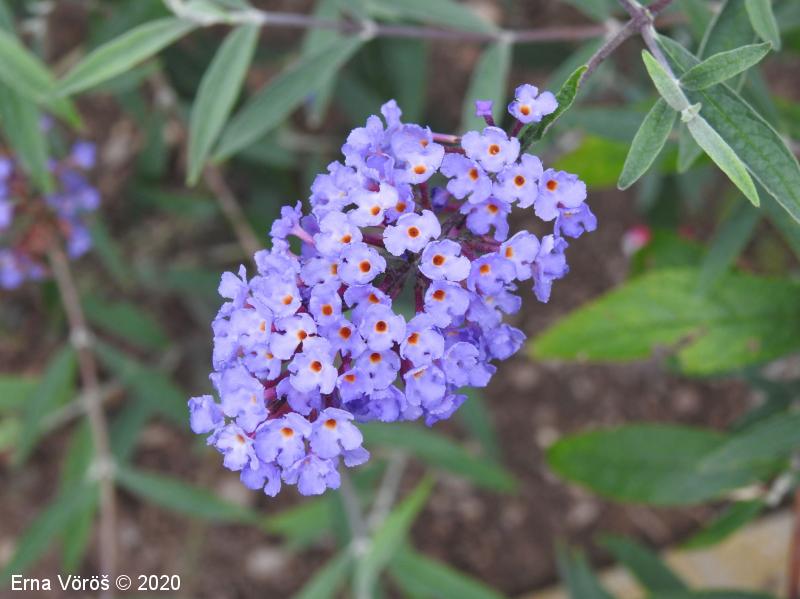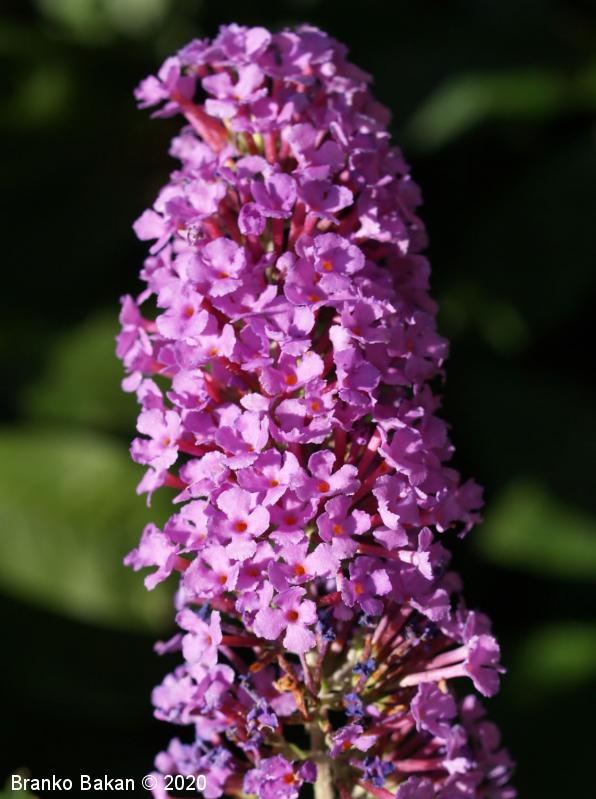 Opis: močno razrasel grm, mnogi stranski poganjki se upognejo in ukoreninijo. Listi so podolgasto suličasti, nasprotno razvrščeni, po robu drobno nazobčani, proti vrhu koničasti, po spodnji strani gosto belodlakavi. Cvetovi so združeni v gostocvetna, latasto razrasla, po obliki piramidasta socvetja, vijoličasti (tudi beli, rdeči, modrovijoličasti ali škrlatni), močno dehteči. Venčni listi so zrasli v dolgo, ozko venčno cev, na vrhu pladnjasto razprti. Plod je glavica.