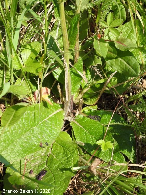 Opis: pokončna trajnica s pritlično listno rozeto. Pritlični listi so dolgopecljati, jajčasti do jajčastosuličasti, po robu valovito plitvo nazobčani, stebelni listi so kratkopecljati do sedeči, suličasti, premenjalno razvrščeni. Cvetovi so temno vijoličasti, okrog 2 cm veliki, razvrščeni v grozdastem, ovršnem socvetju, dolgopecljati, zvezdasto razprostrti, 5-števni, vsak cvet  z drobnim podpornim listom. Prašnikov 5, njihove niti vijoličasto in belkasto volnatodlakave, prašnice pahljačasto sploščene, temnovijoličaste in rumeno obrobljene. Plod je glavica, ki je za polovico daljša od čašnih listov.