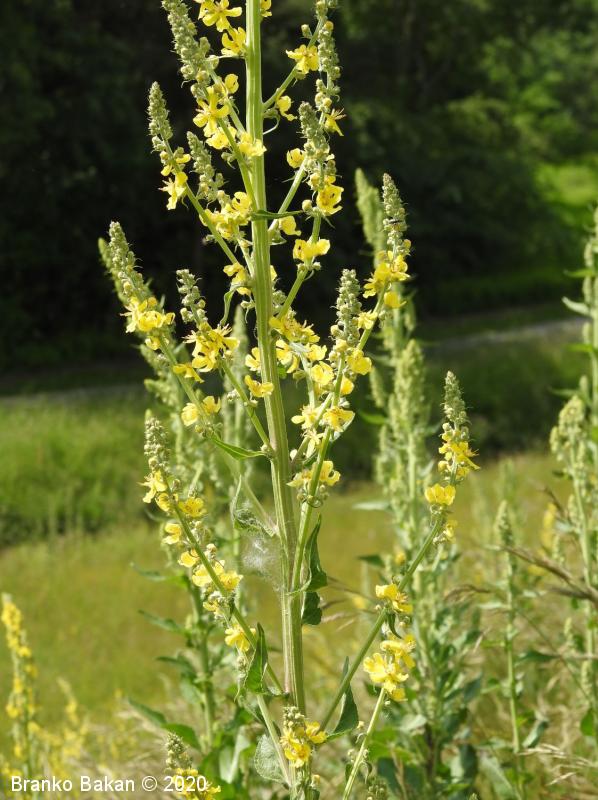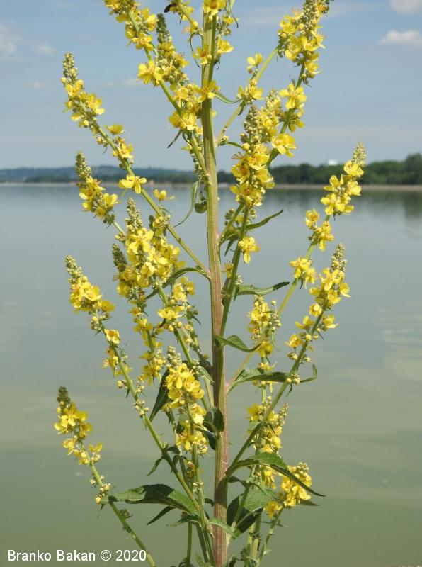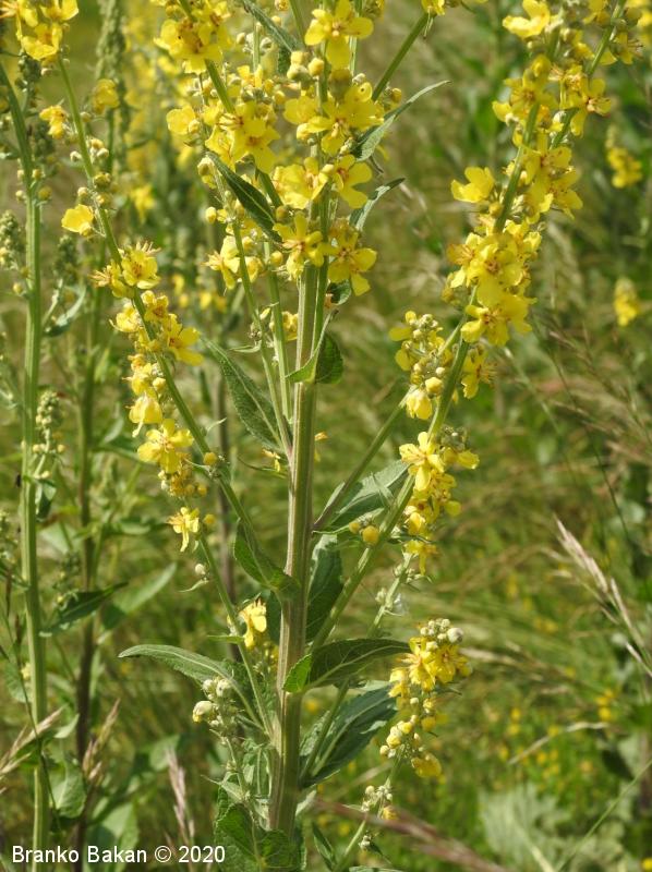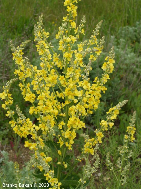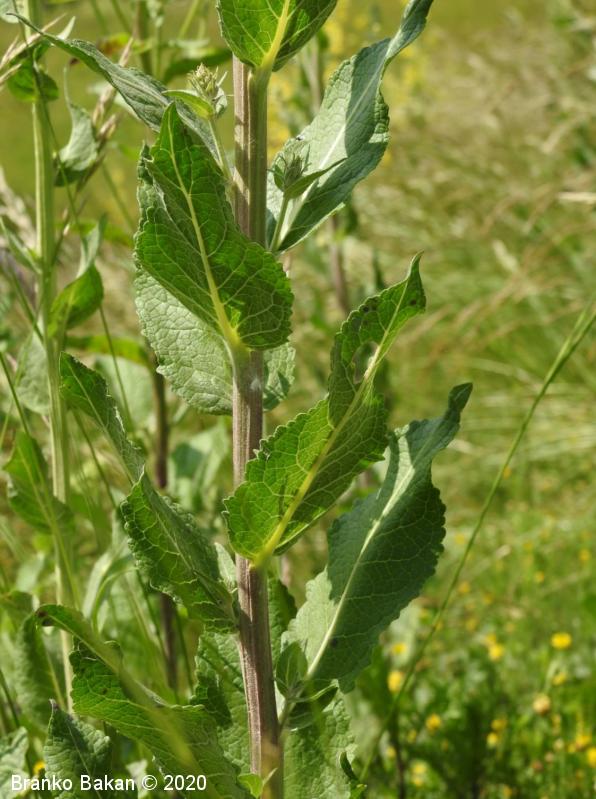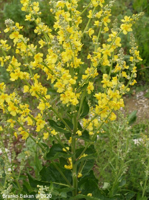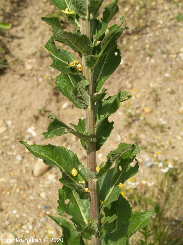 Opis: krepka, pokončna, močno razrasla dvoletnica ali večletnica, z izrazito robatim, kratkodlakavim (v cvetni regiji skoraj moknatim) steblom. Spodnji listi so podolgastosuličasti, dolgopecljati, po robu grobo topo nazobčani, po zgornji strani skoraj goli, temnozeleni in bleščeči, po spodnji strani dlakavi (skoraj moknati), z izrazito osrednjo žilo, zgornji listi so večinoma sedeči, jajčastosuličasti, premenjalno razvrščeni. Cvetovi so rumeni (ali beli), nekje do 1.5 cm veliki, zgoščeni v razrasla, grozdasta socvetja, zbližani, pecljati, zvezdasto razprostrti, 5-števni, vsak cvet s podpornim listom. Prašnikov 5, niti vsaj treh prašnikov belo volnatodlakave, prašnice prečno nameščene na prašnično nit, oranžnorumene. Plod je valjasta glavica, ki je mnogo daljša od čašnih listov.