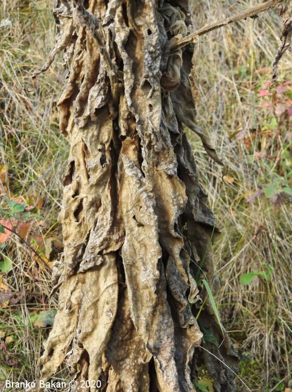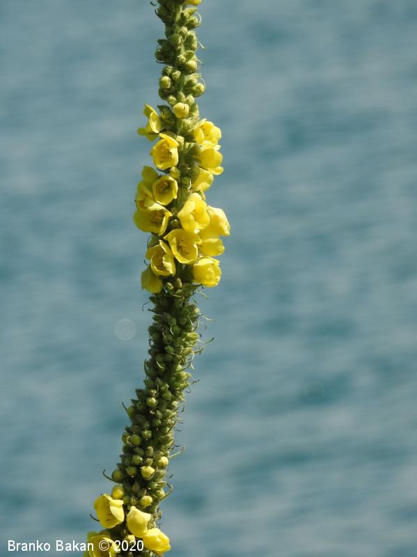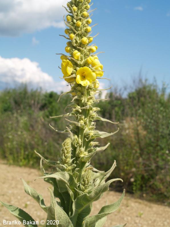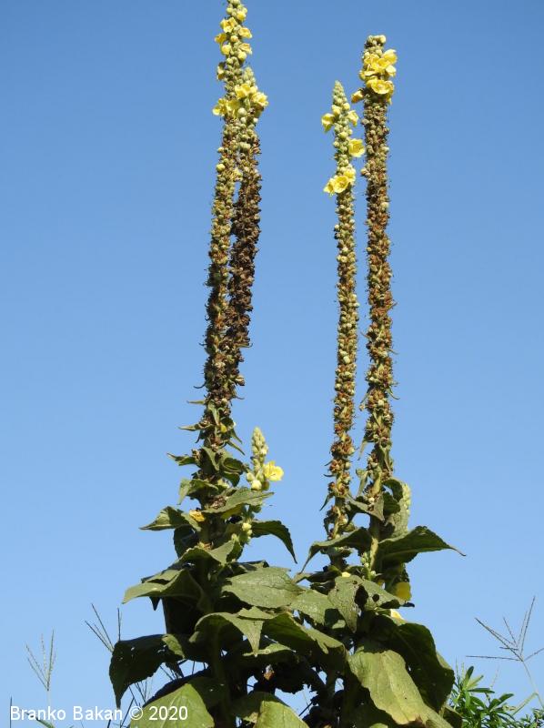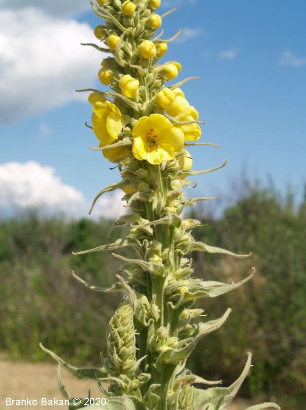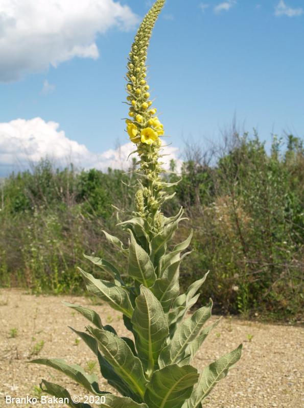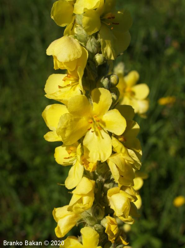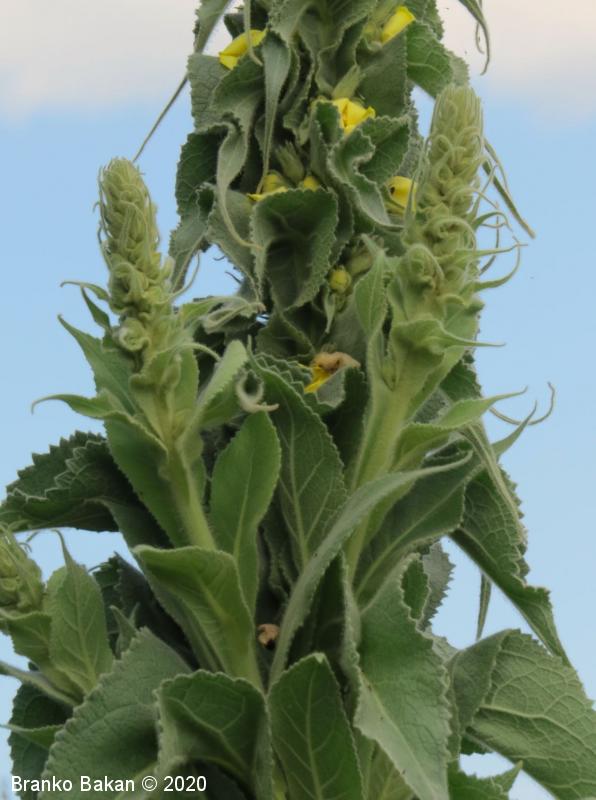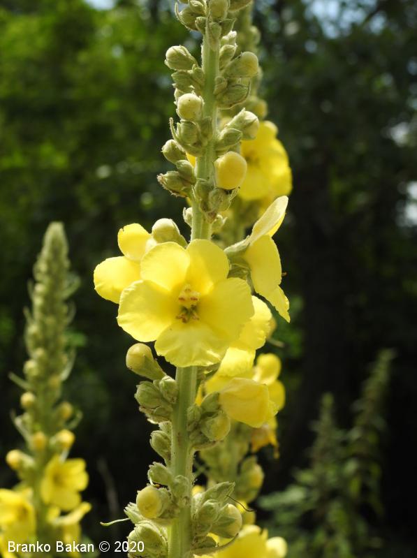 Opis: krepka, pokončna, dvoletnica ali večletnica, z enostavnim (zelo redko z razraslim), gosto mehkodlakavim steblom in gosto pritlično listno rozeto. Pritlični listi so podolgastosuličasti, pecljati, celorobi ali z neenakomerno topo nazobčanim robom, gosto porasli s sivkastimi, mehkimi dlakami (laski/trihomi so močno razvejani), stebelni listiso jajčastosuličasti, krilato se iztezajo po steblu, premenjalno razvrščeni. Cvetovi so rumeni, večinoma nad 3.5 cm veliki, zgoščeni v nerazrasla, močno podaljšana grozdasta socvetja, med seboj zbližani, kpecljati, zvezdasto razprostrti, 5-števni, vsak cvet s podpornim listom. Prašnikov je 5, niti treh krajših prašnikov so belo volnatodlakave, prašnice daljših prašnikov so obstransko nameščene na prašnični niti, ki sta do 2-krat daljši od prašnic. Plod je dlakava, skoraj okrogla glavica, ki je daljša od čašnih listov.