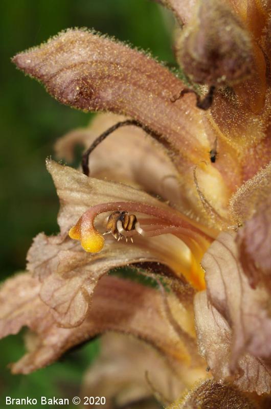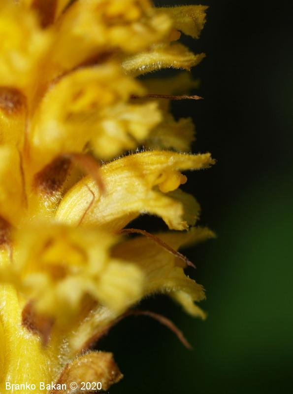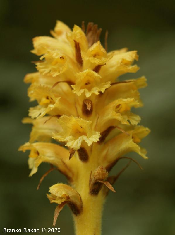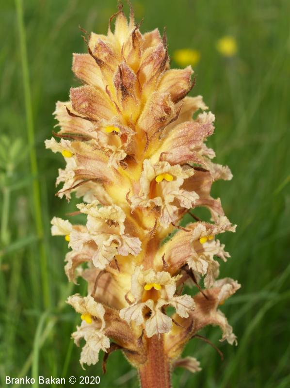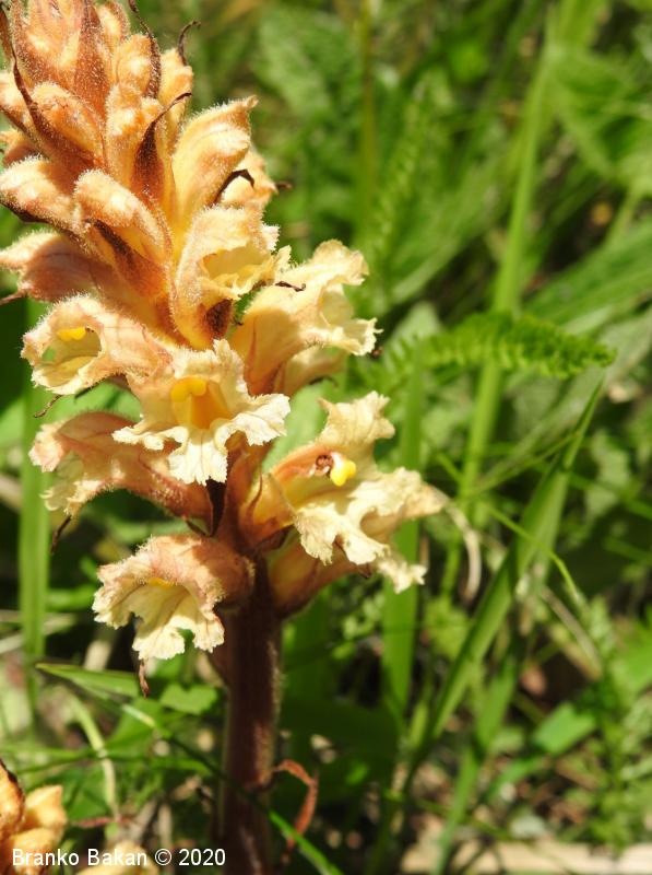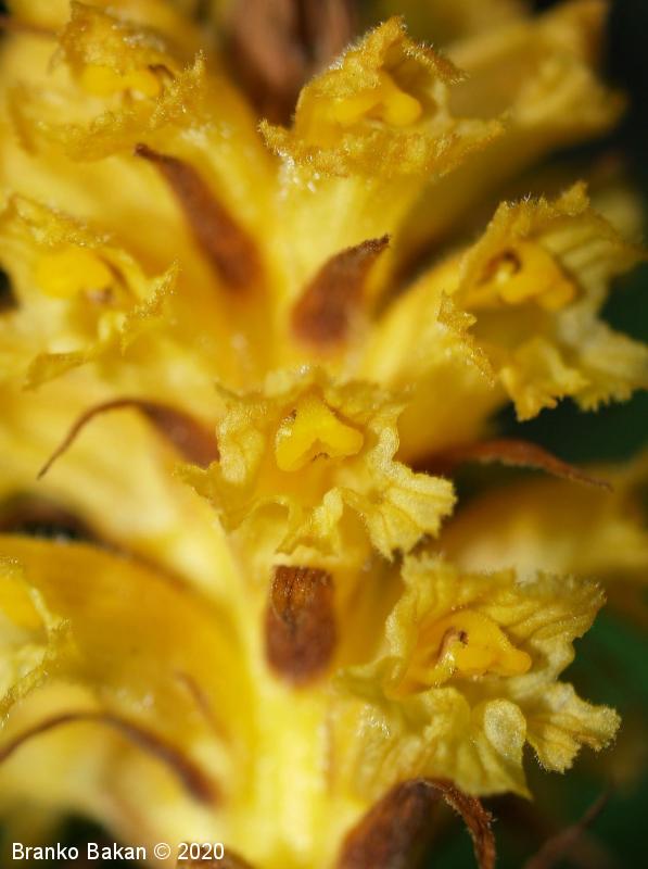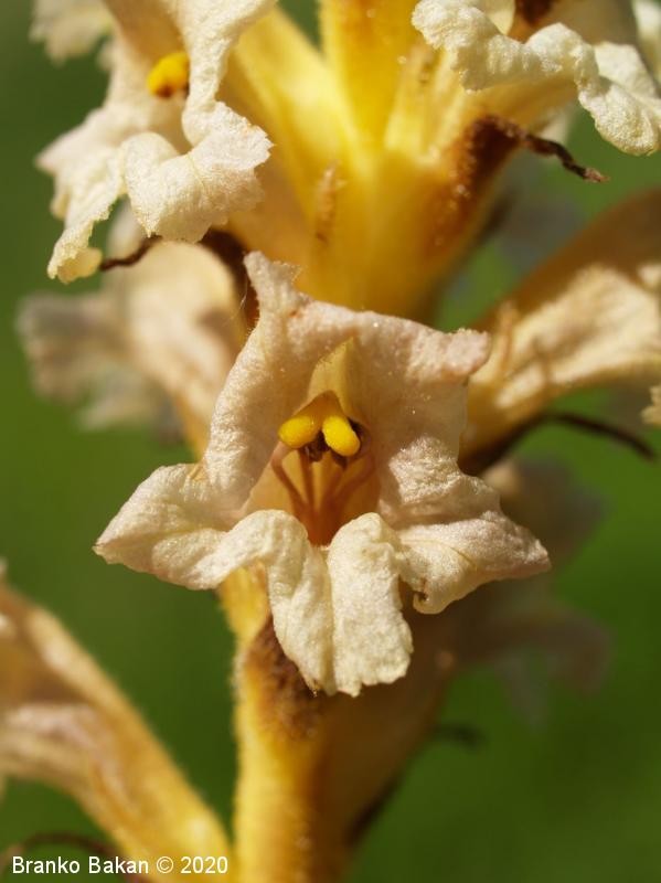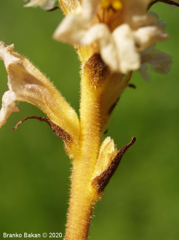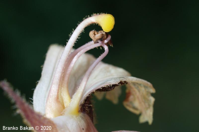 Opis: dvoletnica ali trajnica brez klorofila. Steblo je rumeno do rjavkasto, gosto poraslo z mehkimi in žlezastimi dlakami, v spodnjem delu močno odebeljeno. Listi so luskasti, šilasti, v času cvetenja večinoma že posušeni. Socvetje je zgoščeno, grozdasto, vsak cvet s šilastim krovnim listom. Cvetovi so somerni in ustnati (spodnja ustna je razločno 3-krpa, nazobčana), cevasti, venčna cev je tik na vrhu izrazito ukrivljena, sicer ravna, slamnato rumena ali bledo rjavkasta (pogosto rožnato nadahnjena in ožiljena), porasla z žlezastimi laski. Brazda pestiča je skoraj v celoti rumena, dvodelna, upognjena, pestič je žlezastodlakav. Prašnične niti so po eni strani žlezastodlakave, pritrjene vsaj 2-7 mm nad dnom venca. Plod je glavica.