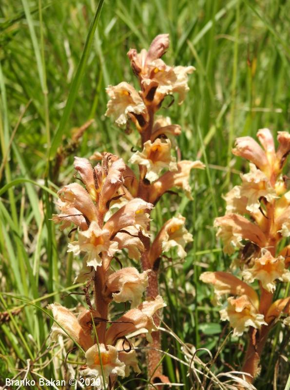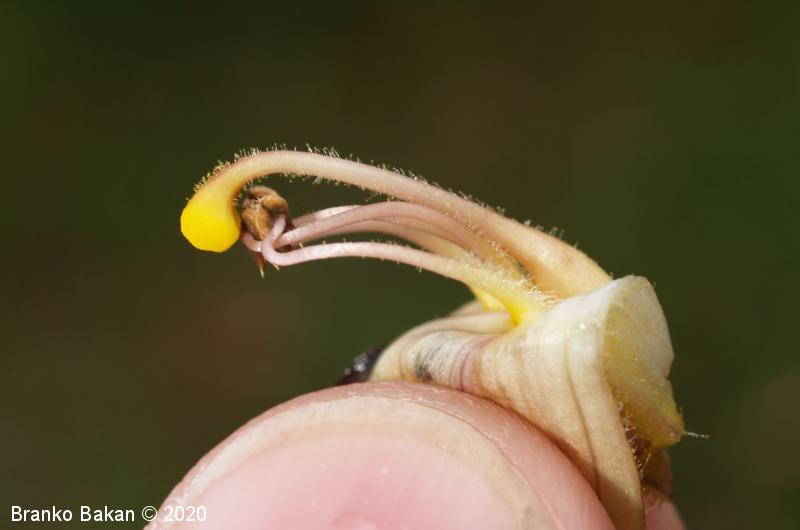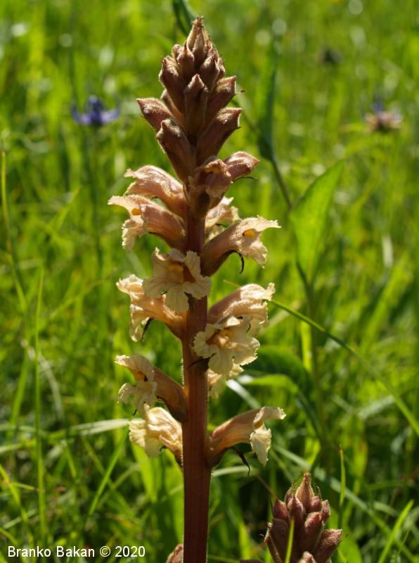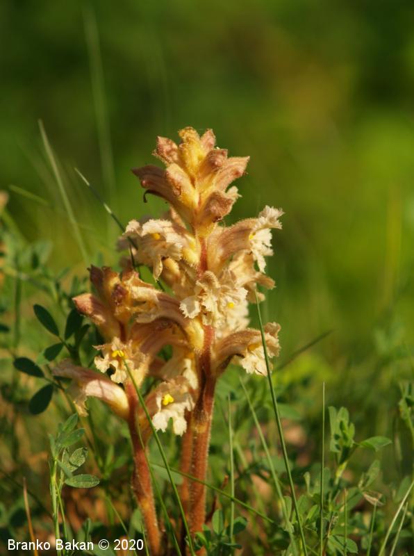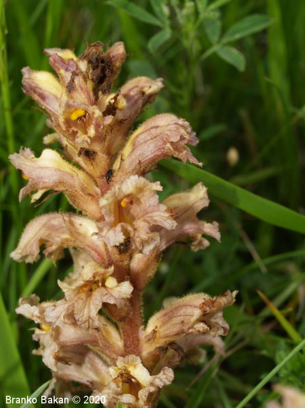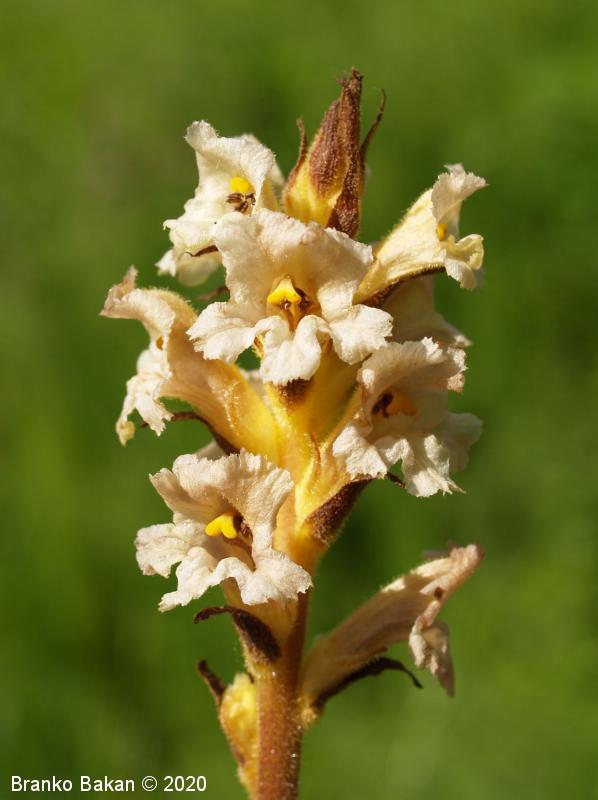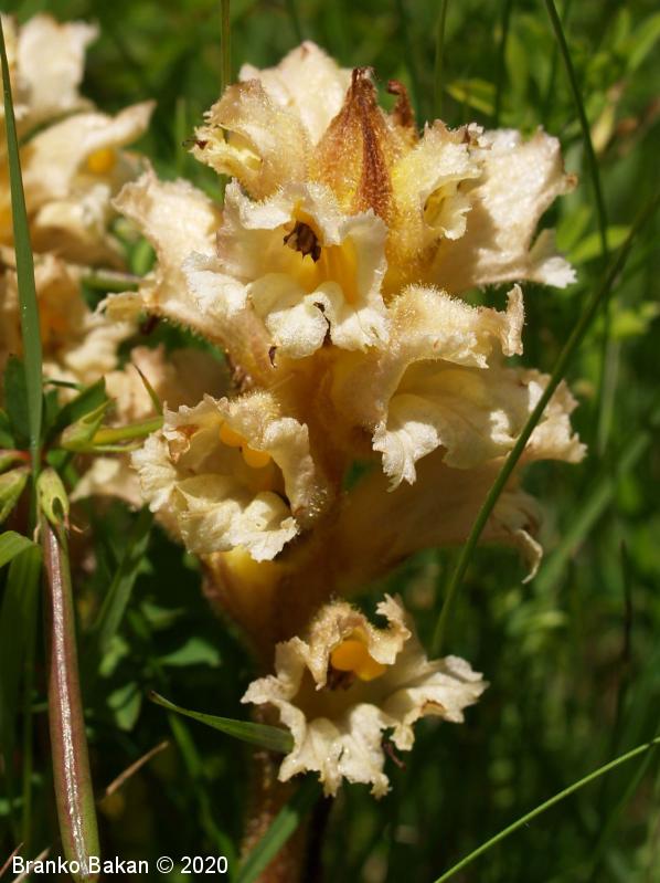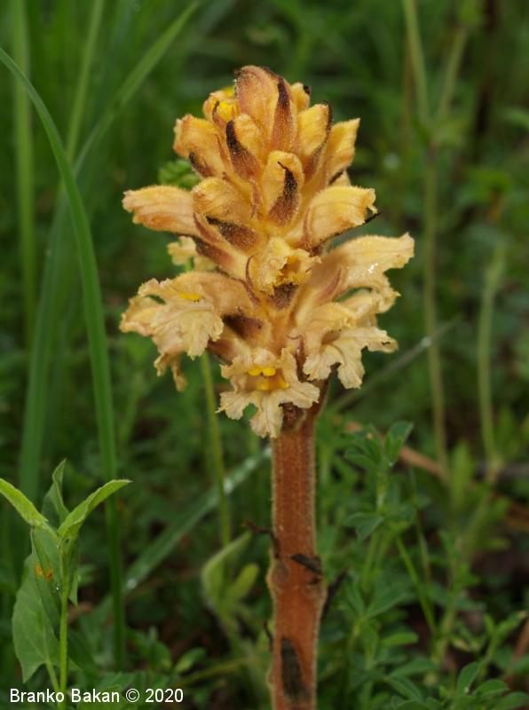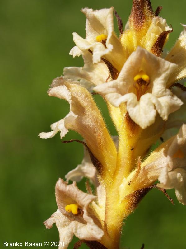 Opis: dvoletnica ali trajnica brez klorofila. Steblo je rumeno do rjavkasto, gosto poraslo z mehkimi in žlezastimi dlakami, v spodnjem delu močno odebeljeno. Listi so luskasti, šilasti, v času cvetenja večinoma že posušeni. Socvetje je zgoščeno, grozdasto, vsak cvet s šilastim krovnim listom. Cvetovi so somerni in ustnati (spodnja ustna je razločno 3-krpa, nazobčana), cevasti, venčna cev je tik na vrhu izrazito ukrivljena, sicer ravna, slamnato rumena ali bledo rjavkasta (pogosto rožnato nadahnjena in ožiljena), porasla z žlezastimi laski. Brazda pestiča je skoraj v celoti rumena, dvodelna, upognjena, pestič je žlezastodlakav. Prašnične niti so po eni strani žlezastodlakave, pritrjene vsaj 2-7 mm nad dnom venca. Plod je glavica.