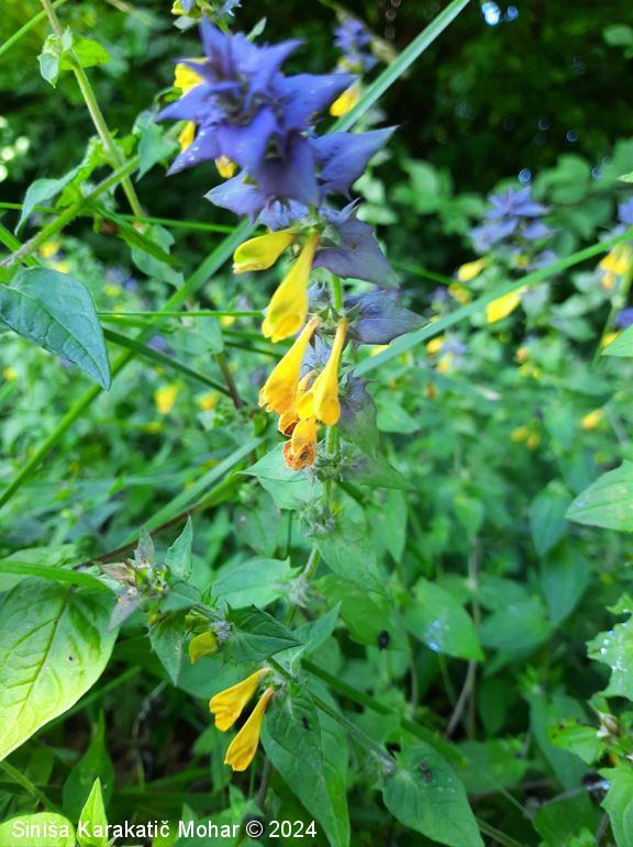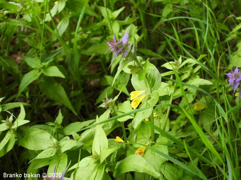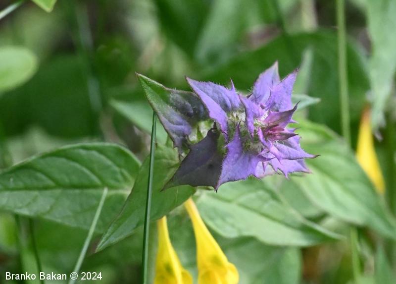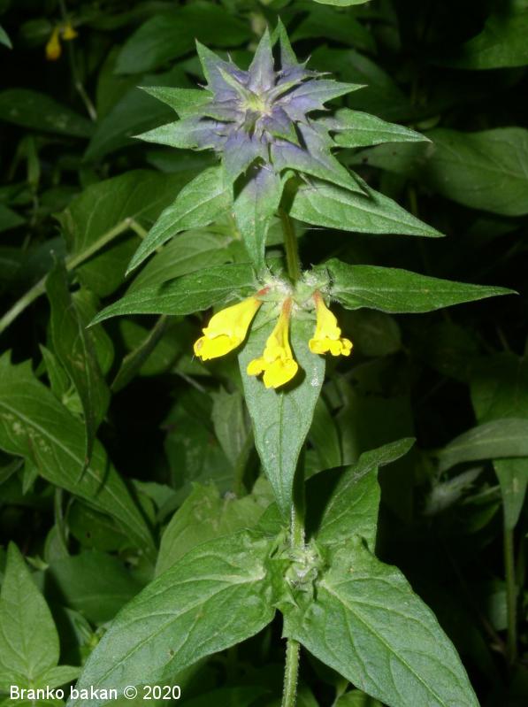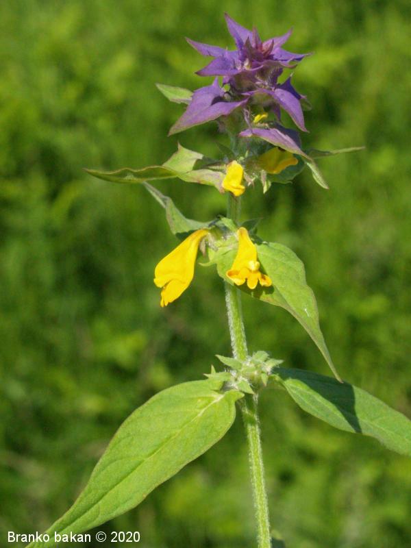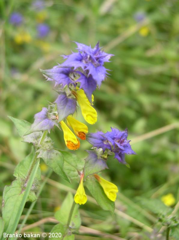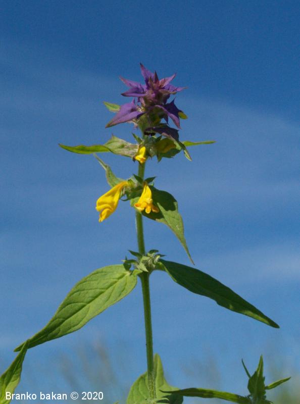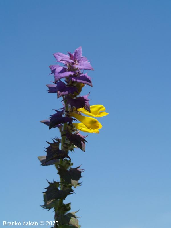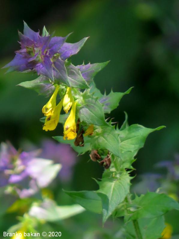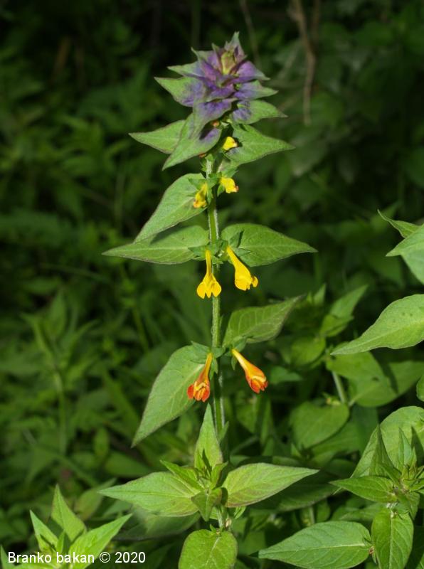 Opis: pokončna, večinoma razrasla enoletnica. Steblo je štirioglato, večinoma golo. Listi so podolgasto suličasti, spodnji pecljati, zgornji sedeči, nasprotno razvrščeni, celorobi. Cvetovi so somerni, ustnati in cevasti, združeni v podaljšana, ovršna, večinoma enostranska socvetja, vsak cvet s podpornim listom, ki je še posebej pri vrhnjih cvetovih modrovijoličasto obarvan, resasto nazobčan in večinoma dolgodlakav. Spodnji del venčne cevi je oranžnorjav, ostali del venca je rumen, spodnja in zgornja ustna venca sta zbližani. Čašni listi so med seboj zrasli do polovice, gosto dolgodlakavi. Plod je glavica.