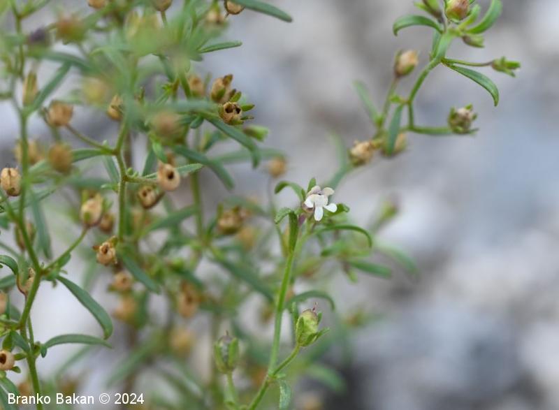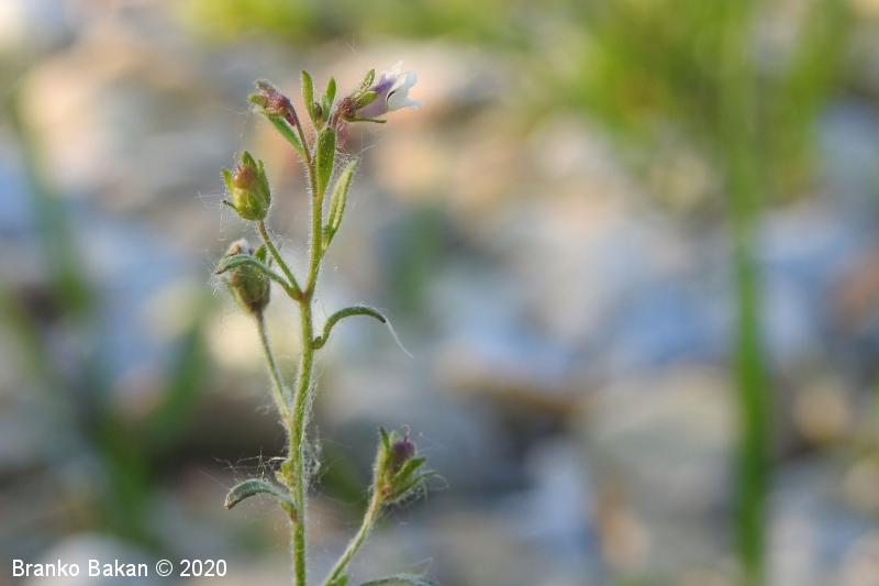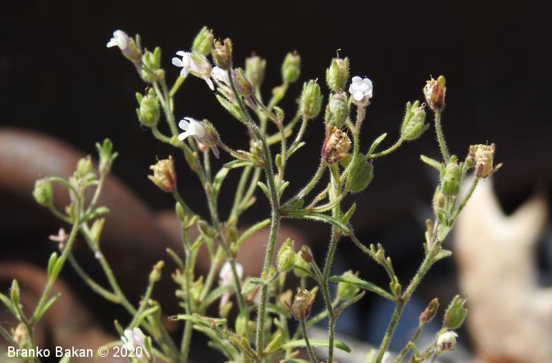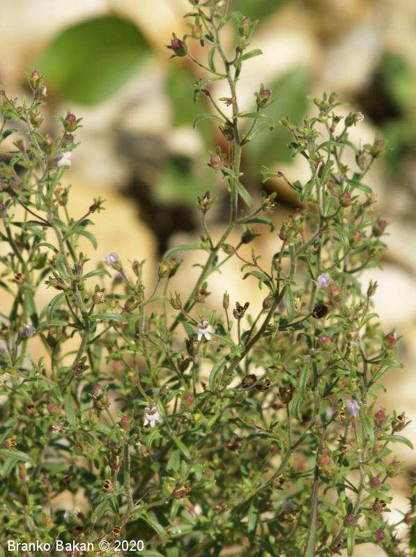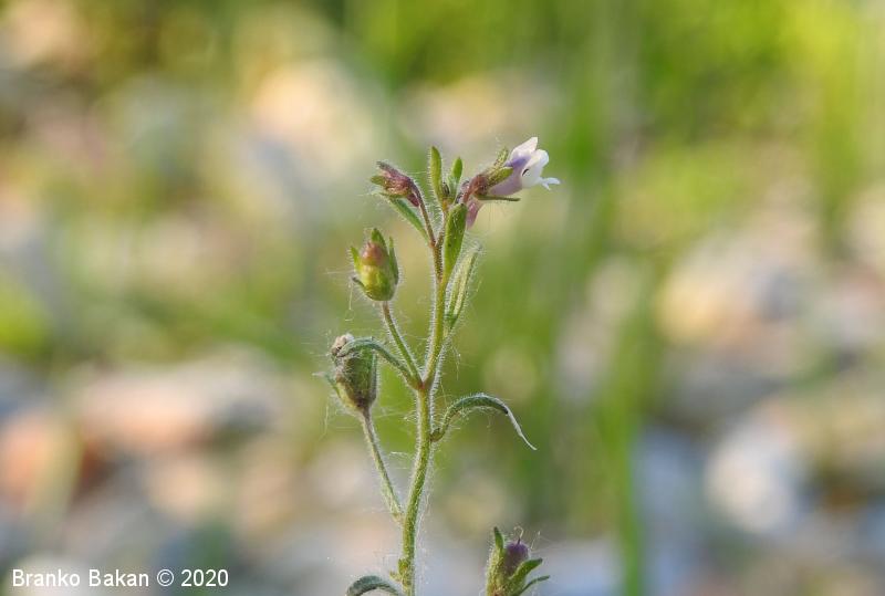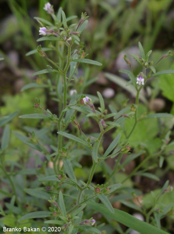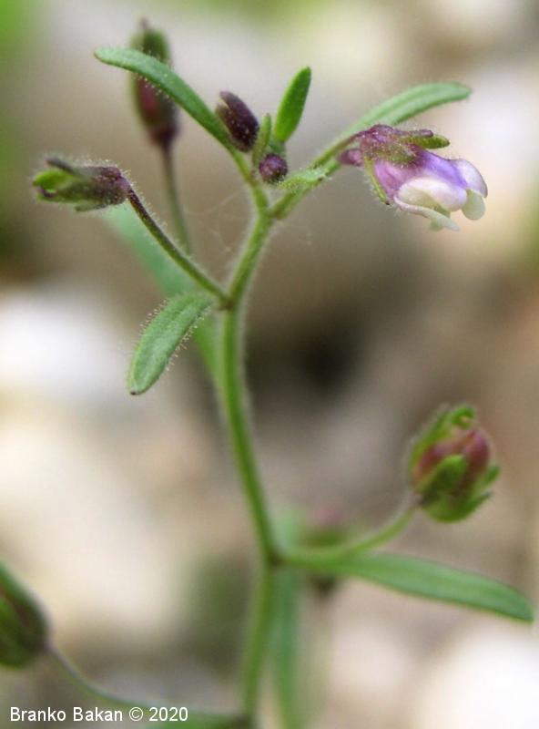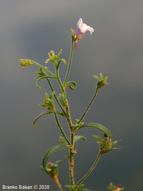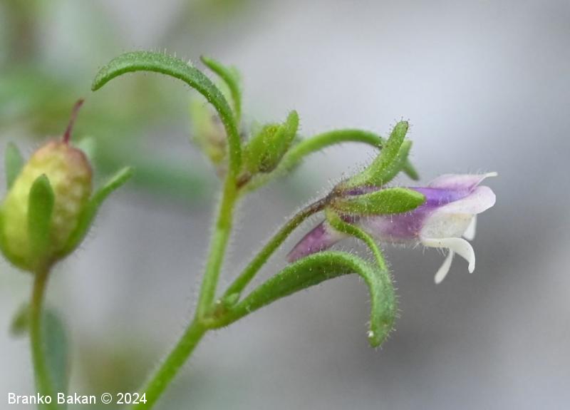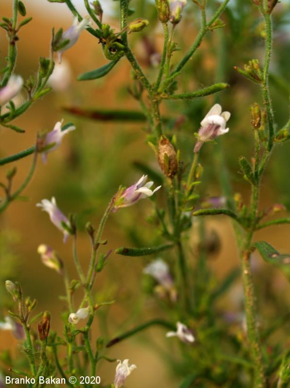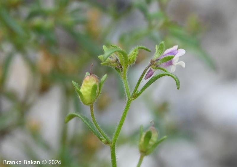 Opis: pokončna, razrasla, gosto žlezastodlakava enoletnica. Listi so večinoma premenjalno razvrščeni, nekateri tudi nasprotni, enostavni, črtalasti, celorobi, na vrhu topi, gostodlakavi. Cvetovi so somerni, ustnati, dolgopecljati (nad 5 mm), posamični v zalistjih, precej drobni, svetlovijoličasti, z belkastima ustnama, ki zapirata vhod v venec in s kratko, rahlo ukrivljeno, topo ostrogo (cevasto podaljšan del venca). Čašni listi so črtalasti, žlezastodlakavi, skoraj tako dolgi kot venec. Plod je jajčasta glavica, ki je večinoma daljša od čaše.