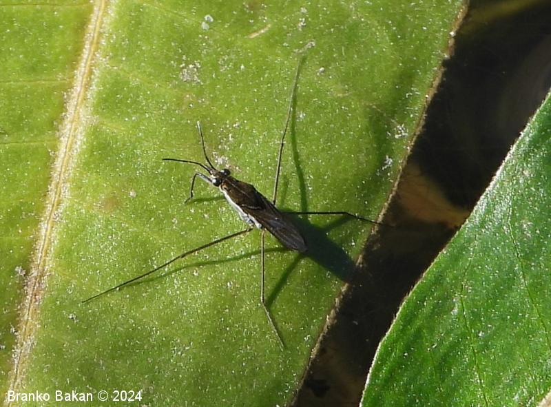 Odrasli osebki: telo je podolgovato, ozko (aerodinamično), temno sivorjavo obarvano, po spodnji strani sivkasto (ob bokih zaradi ujetega zraka pogosto srebrnobelo bleščeče). Glava je drobna, koničasta, oči so dokaj velike, temne. Oprsje (pronotum) je dolgo, ščitasto, sivorjavo, z gredljem na hrbtišču ter s srebrnkastobelimi dlakami ob robovih konice oprsja (ime!). Krila so temnorjava, tako dolga kot zadek, vidno ožiljena. Prednje noge so mnogo krajše od zadnjih dveh parov, namenjene grabljenju plena, na bazi rumenorjavo lisaste, sicer temne.