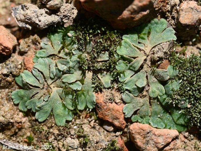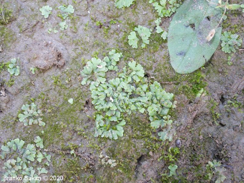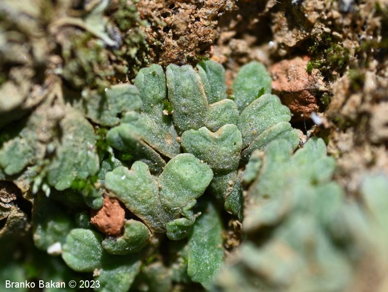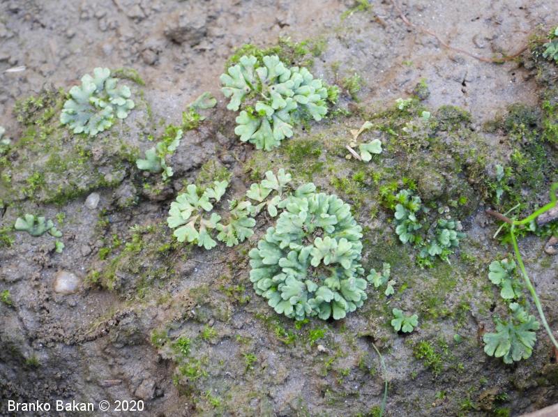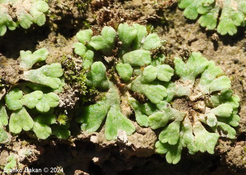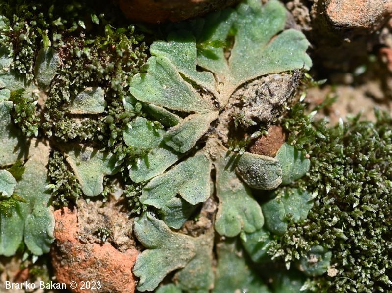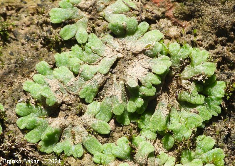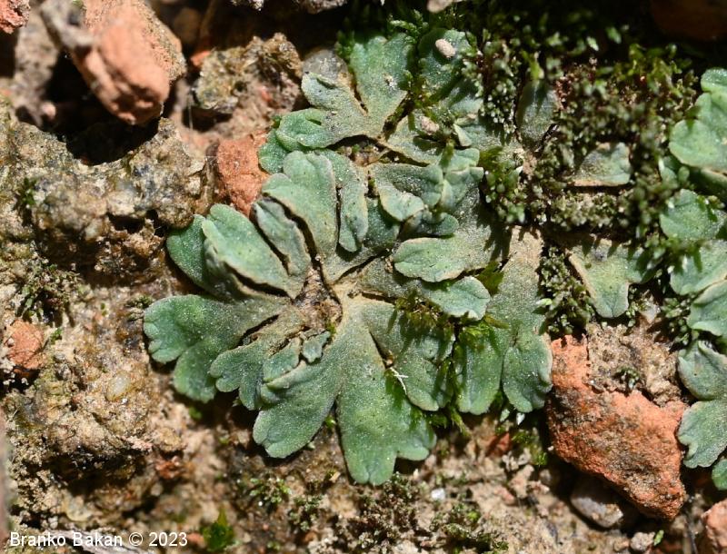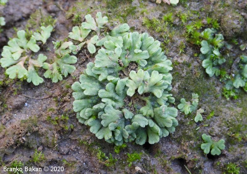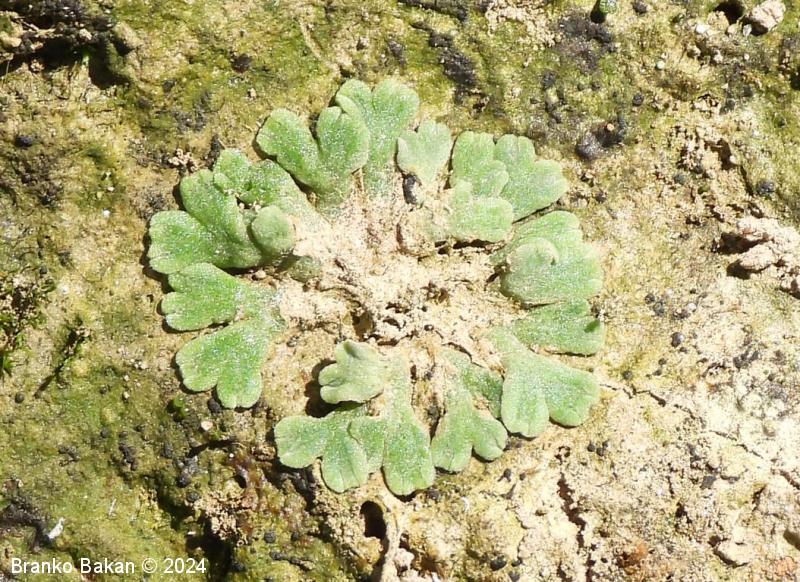 Opis: steljka gametofita (spolne generacije) se plosko prirašča ob tla in se vilasto (dihotomno) razrašča, večinoma je rozetasto ali pahljačasto oblikovana, modrozeleno obarvana. Stranski izrastki steljke so 2-3.5 mm široki, krpati, na konicah razločno vdolbeni (vdolbina pogosto spominja na črko V), sicer ploski, brez razločne vzdolžne brazde (kot pri zelo podobni R. sorocarpa). Anteridiji in arhegoniji (spolni organi) so nekoliko vgreznjeni in se razvijejo v osrednjem delu steljke. Sporogoni so zelo preprosti, zgrajeni le iz črne pušice (kapsula) in se razvijejo v gručah iz oplojenih jajčnih celic v arhegonijih (ta del steljke pogosto potemni).