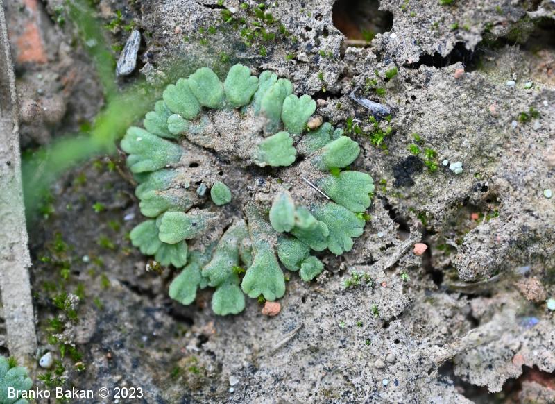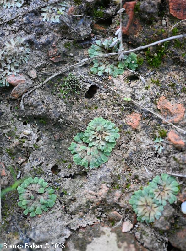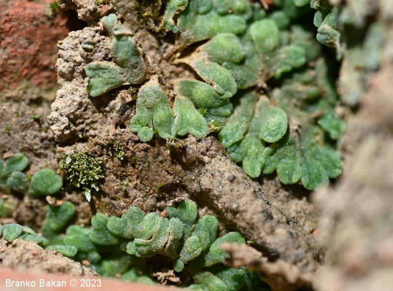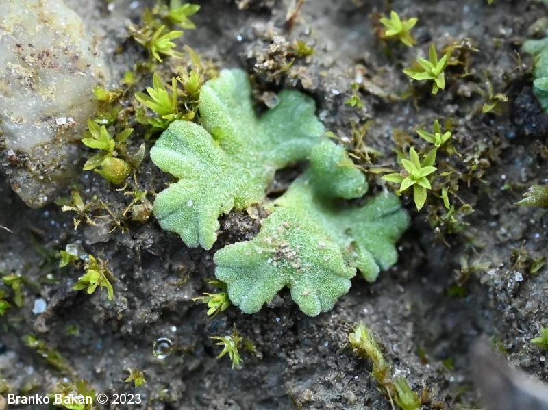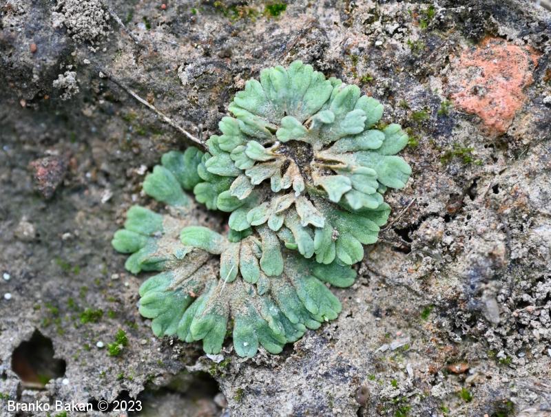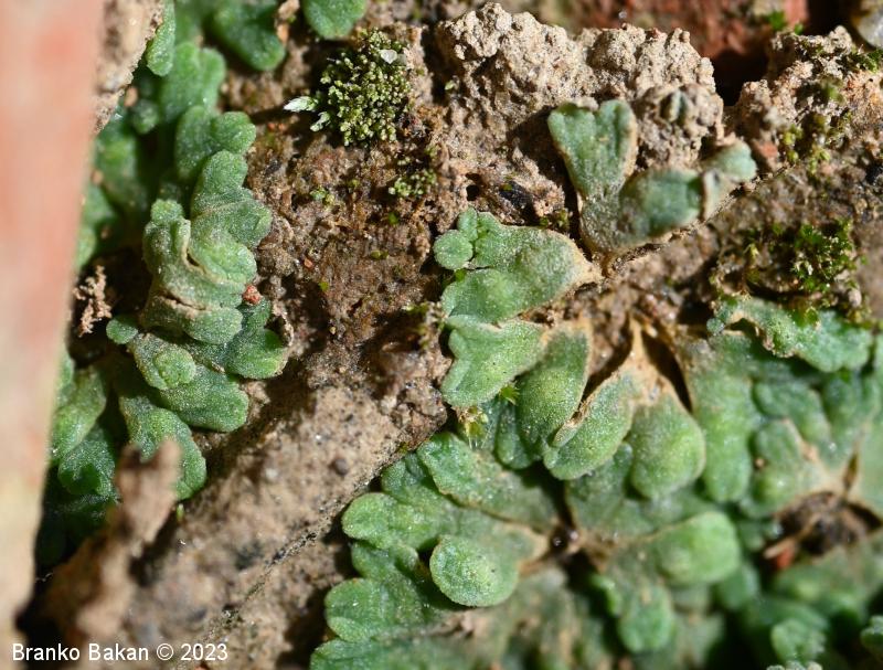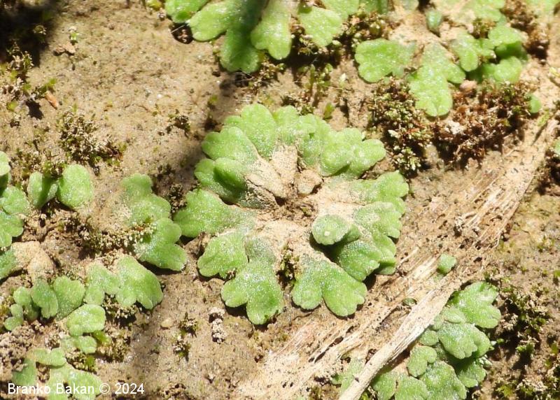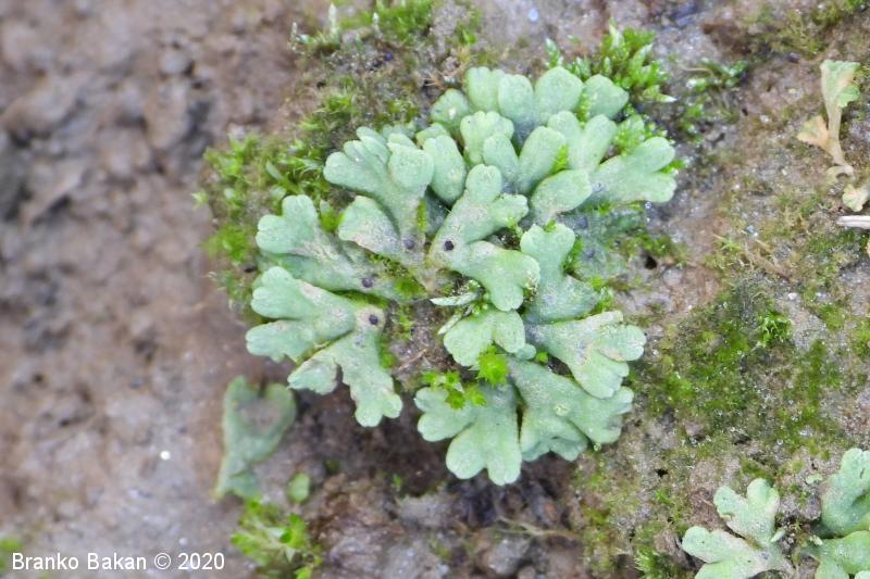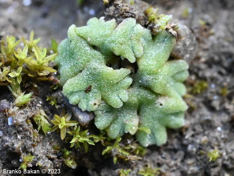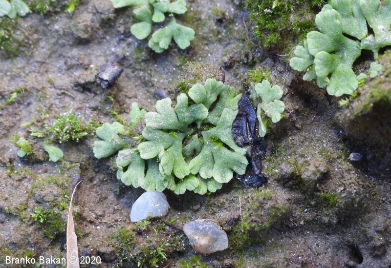Opis: steljka gametofita (spolne generacije) se plosko prirašča ob tla in se vilasto (dihotomno) razrašča, večinoma je rozetasto ali pahljačasto oblikovana, modrozeleno obarvana. Stranski izrastki steljke so 2-3.5 mm široki, krpati, na konicah razločno vdolbeni (vdolbina pogosto spominja na črko V), sicer ploski, brez razločne vzdolžne brazde (kot pri zelo podobni R. sorocarpa). Anteridiji in arhegoniji (spolni organi) so nekoliko vgreznjeni in se razvijejo v osrednjem delu steljke. Sporogoni so zelo preprosti, zgrajeni le iz črne pušice (kapsula) in se razvijejo v gručah iz oplojenih jajčnih celic v arhegonijih (ta del steljke pogosto potemni).