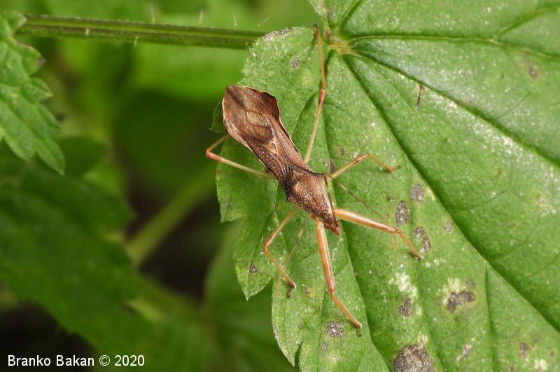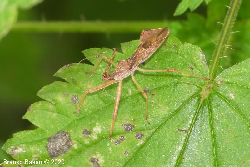 Odrasli osebki: dokaj vitka, cimetasto rjavo obarvana stenica s plosko razširjenim zadnjim delom zadka in izrazitejšima trnatima izrastkoma na oprsju. Glava je zelo ozka, dolga, naprej orientirana, z dolgim, krepkim in srpastim kljuncem. Tipalnice so dolge, rdečerjave, z zelo tankimi in pregibnimi sprednjimi členki. Oprsje je v obrisu podolgasto šestkotno, na hrbtišču oblasto izbočeno, s stranskima trnatima izrastkoma, večinoma rjavo, s svetlimi pikami. Ščitek (scutellum) je majhen, trikoten. Pokrovke so ozke, proti koncu močno zožene, ukrivljene, rjave, z belimi pikami. Zadek je v zadnjem delu plosko rombasto razširjen. Noge so večinoma svetlorjave, prednje noge so krepke, obrnjene naprej in imajo odebeljena stegenca (femuri).