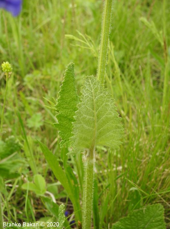 Opis: krepka, pokončna, delno razrasla trajnica s pritlično listno rozeto in močno korenino. Spodnji listi so podolgasto jajčasti, dolgopecljati, s srčastim ali ravnim dnom, po robu topo nazobčani, zelo redko nacepljeni ali plitvo krpati, nagubano žilnati, dlakavi, zgornji stebelni listi so večinoma suličasti, sedeči, mnogo manjši od priltičnih. Cvetovi so ustnati, somerni, temnomodri ali modrovijoličasti, redkeje beli, precej veliki (do 35 mm), dlakavi. Zgornja venčna ustna je žličasto zaobljena, precej večja od spodnje ustne, ki je trokrpa, stranske krpe so lahko zelo široke, belkaste. Čašni listi so zrasli v dvoustnato čašno cev, ki je žlezastodlakava. Plod razpade na 4 plodiče.