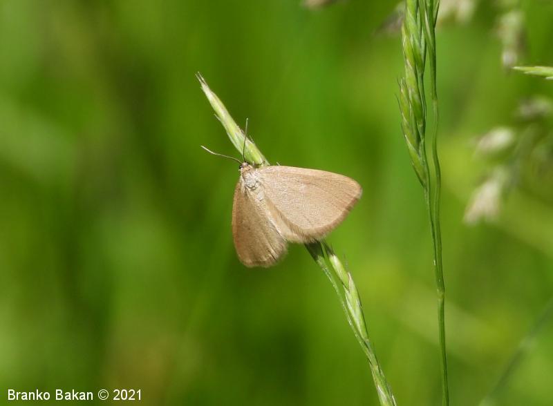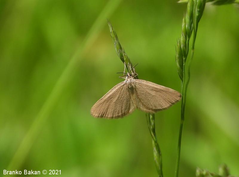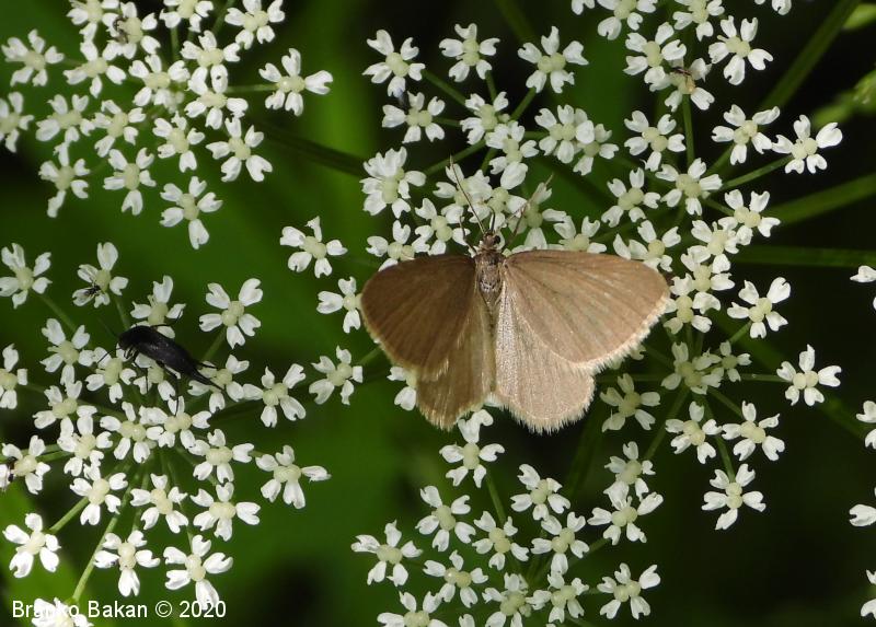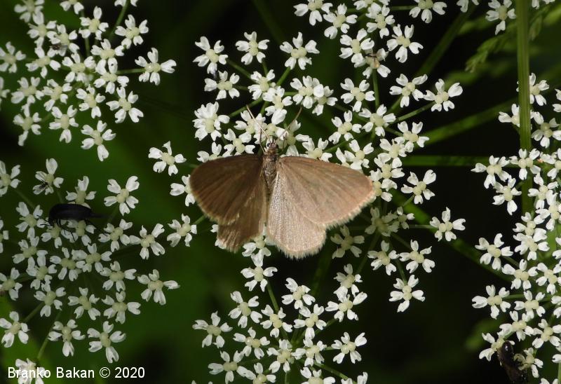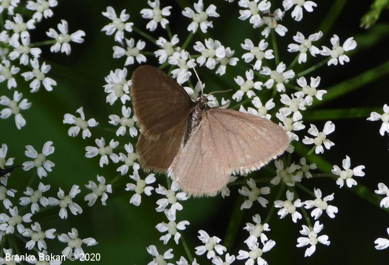 Odrasli osebki: krila so z zgornje in s spodnje strani enotno žametno do motno sivo- ali temnorjava, z razločnimi žilami, rahlo bleščeča, po zunanjem robu resasto dlakava. Tipalnice so pri samčkih drobno resasto glavničaste. Telo je temnorjavo. Znanih je več podvrst.