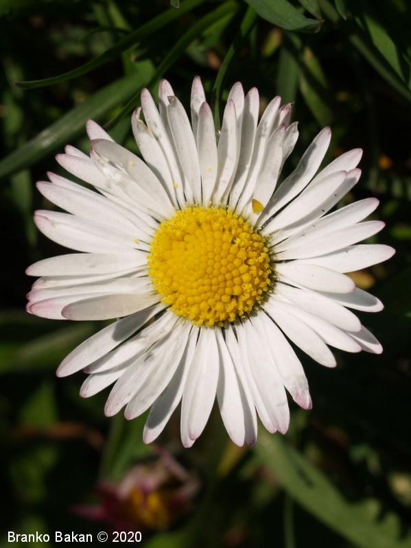 Opis: trajnica z bogato pritlično listno rozeto in posamičnimi cvetočimi stebli ter kratkimi podzemnimi pritlikami. Listi so podolgasto jajčasti do lopatičasti, srhkodlakavi, celorobi ali neenakomerno plitvo izjedeni. Koški so posamični, na dolgih, enostavnih stebelcih, jezičasti cvetovi (zunanji) so z zgornje strani beli, s spodnje večinoma rdečkasti ali škrlatni do rožnati, notranji (cevasti) cvetovi so rumeni, nameščeni na rahlo dvignjenem socvetišču, zato izbočeni. Koške obdajajo enoredno nameščeni, eliptičnosuličasti ovojkovi listi. Plod je orešek (rožka), ki nima razvite kodeljice (v ščetinice preobraženi čašni listi).
