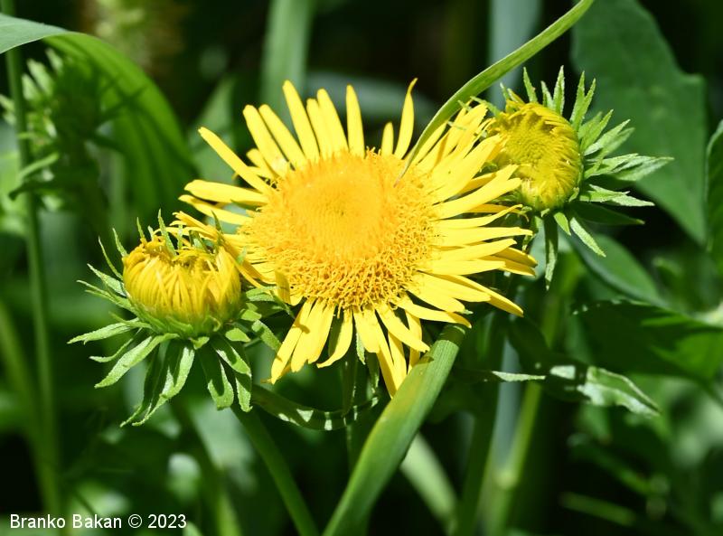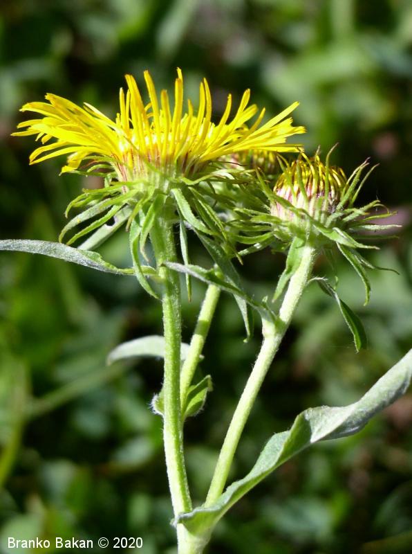 Opis: pokončna, srhkodlakava, večinoma le v cvetni regiji razrasla trajnica z dolgimi, podzemnimi pritlikami. Listi so podolgastosuličasti, sedeči, pri dnu z ušesci objemajo steblo, celorobi ali s posamičnimi, kratkimi zobci, nerazločno mrežasto žilnati. Koški (socvetja) so posamični na koncu poganjka, precej veliki (2-3.5 cm v premeru), pladnjasto razprti, obdajajo jih črtlastosuličasti ovojkovi listi, ki so enoredno nameščeni, srhkodlakavi. Jezičasti (zunanji) cvetovi so zelo ozki, številni, rumeni, mnogo daljši od cevastih (notranji) cvetov, ki so umazanorumeni. Plod je orešek (rožka), ki ima na vrhu šop dolgih laskov (kodeljica - reducirani čašni listi).