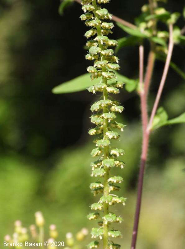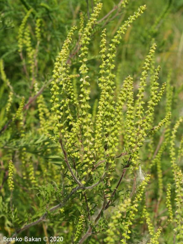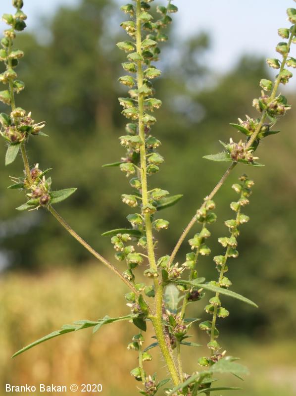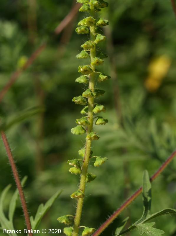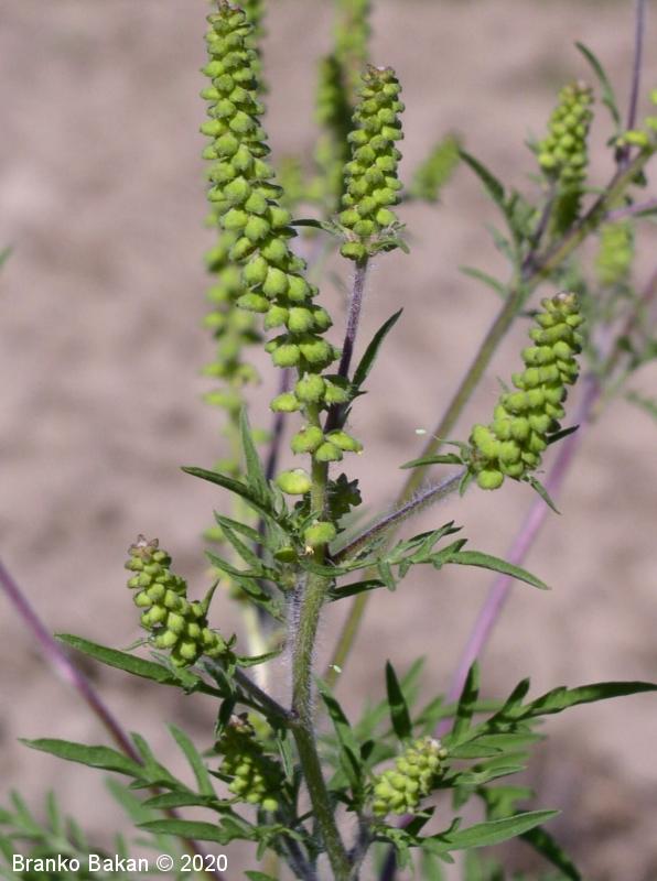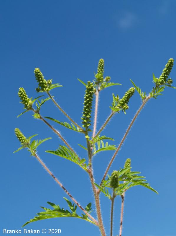 Opis: pokončna, precej razrasla, štrlečedlakava enoletnica. Listi so 2- do 3-krat pernato deljeni v nazobčane ali nacepljene roglje, dolgopecljati, dlakavi, temnozeleni, premenjalno razvrščeni. Koški so drobni, enospolni, moški koški so zelenkasti, kimasti, nanizani v podaljšana, grozdasta socvetja, skoraj v celoti jih obdajajo med seboj zrasli ovojkovi listi, ženski cvetovi so rumenkasti, valjasti, z zalistnih, majhnih skupinicah. Plod je orešek (rožka), na vrhu brez kodeljice (ostanek čašnih listov).