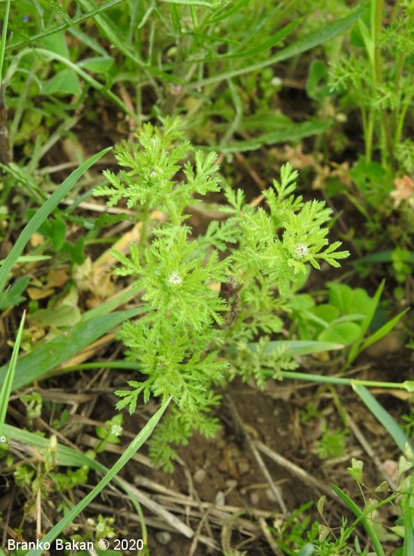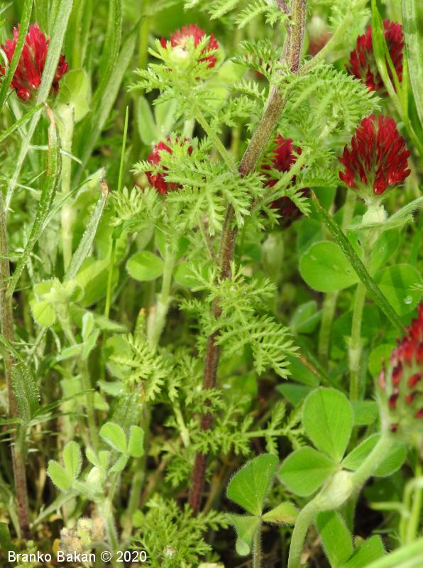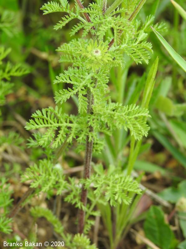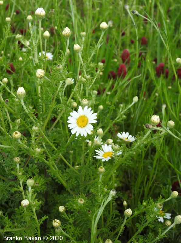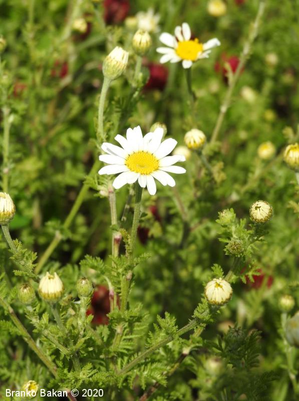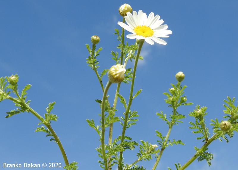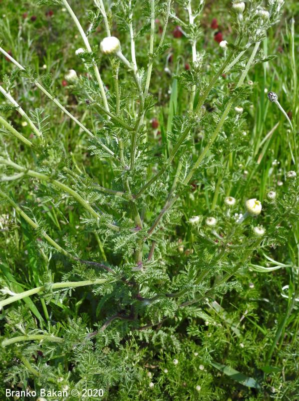 Opis: pokončna, razvejana, gostodlakava enoletnica. Listi so v obrisu podolgasti, 2- do 3-krat pernato deljeni v zelo kratke, plitvo nacepljene roglje (zato precej togi in kompaktni), dlakavi (včasih gosto volnatodlakavi), sedeči, ploski, z neizrazitim vonjem. Koški so 2-3 cm veliki, na dolgih pecljih, z rahlo izbočenim, zapolnjenim socvetiščem (to je poraslo s krovnimi luskami, ki jih dobro vidimo, če odstranimo vse notranje cvetove ali če razpolovimo košek). Zunanji (jezičasti) cvetovi so beli, notranji (cevasti) so rumeni, dehteči. Plod je 4-oglat orešek (rožka), brazdasto progast, z ostrimi robovi, brez kodeljice (reducirani čašni listi).
