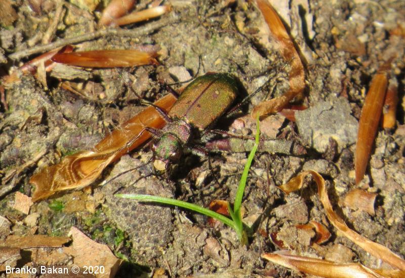 Obnašanje in razvoj: vrsta je toploljubna, aktivna v sončnih dneh od maja do septembra. Odrasli se večinoma zadržuje na odprtih, kamnitih mestih, kjer lovijo različne žuželke in druge manjše členonožce. Pri tem zelo htro tekajo naokrog, občasno tudi poletijo z brenčečim zvokom. Ličinke so črvaste oblike in živijo v navpično izkopanih podzemnih rovih, kjer prežijo na plen. Glava je dokaj velika, z velikimi čeljustmi in precej velikim oprsnim ščitom, zadek je belkast, porasel s šopi ščetinic. Zaradi izginjanja primernih življenjskih prostorov tako za ličinke, kot tudi za odrasle živali, je marsikje po Evropi vrsta močno nazadovala in postala ogrožena.