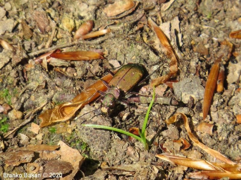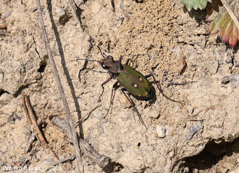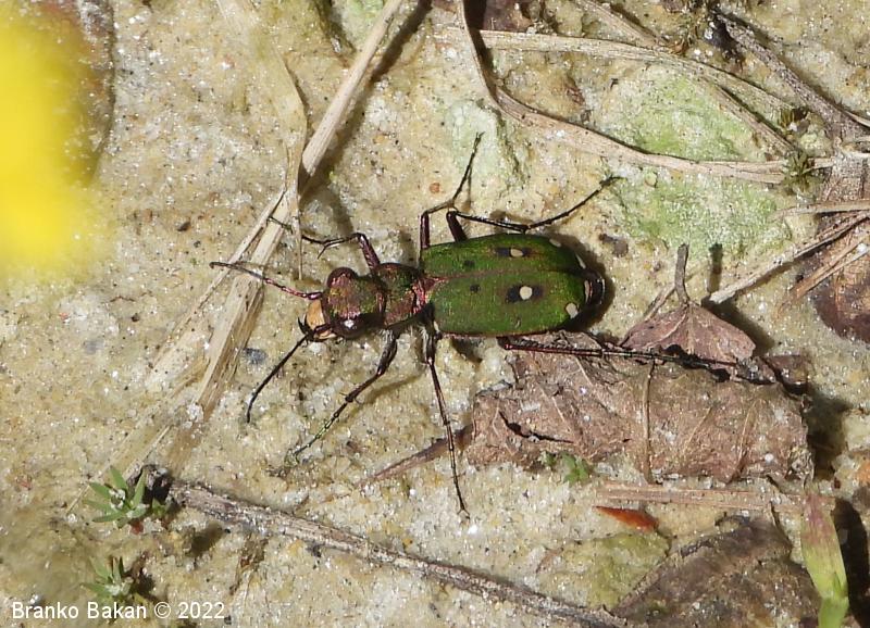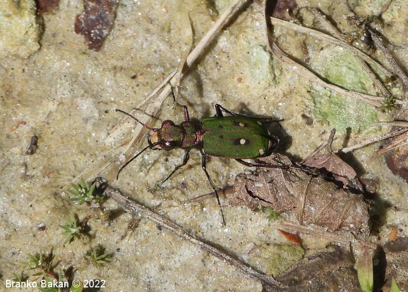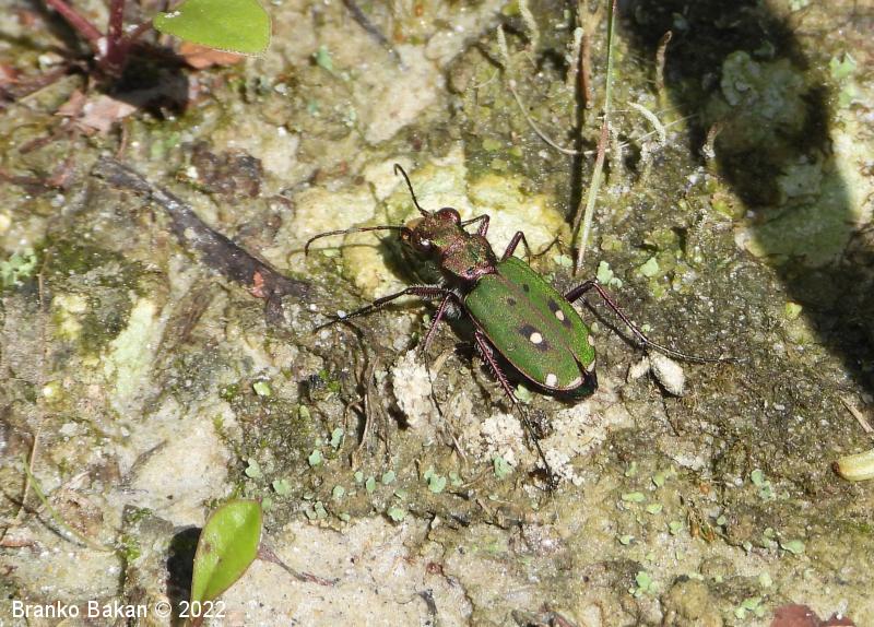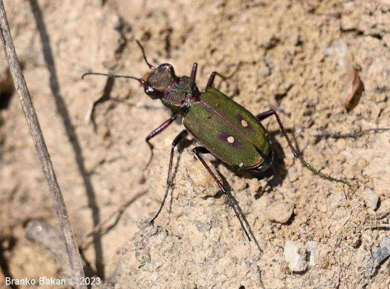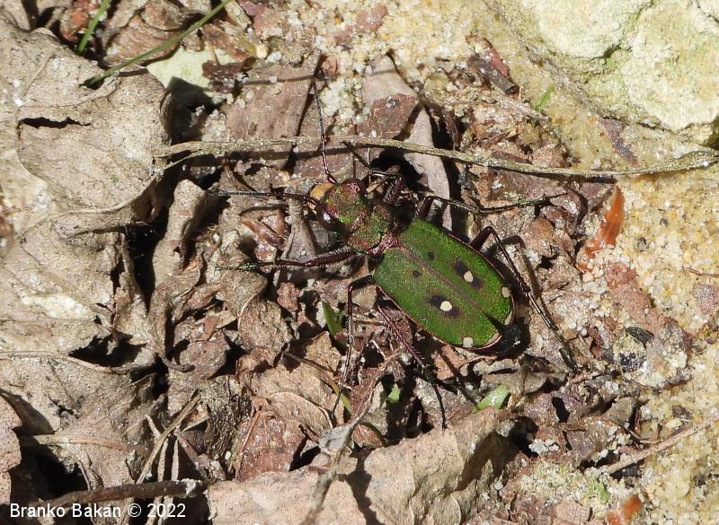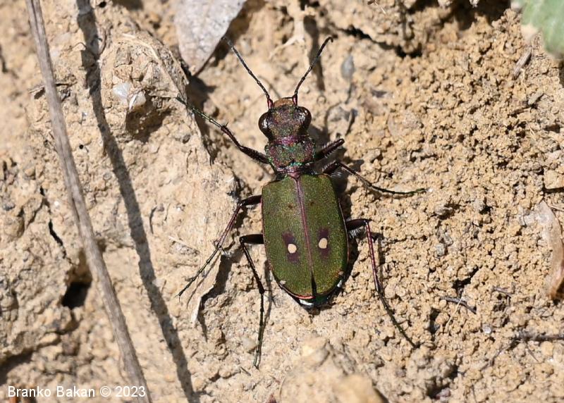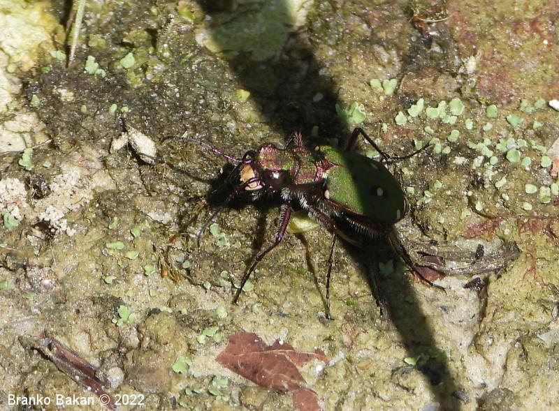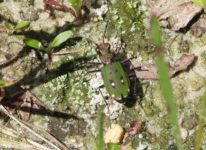 Odrasli osebki: prepoznavni po bleščeče zeli obarvanosti in zelo velikih, nazobčanih čeljustih. Glava je precaj široka z velikimi, svetlimi ali temnimi očmi. Čeljusti so navzdol usmerjene, krepke, porasle z velikimi trni, temne, na zunanjem delu večinoma svetlejše, zgornja ustna je belkasta. Tipalnice so dolgočlenaste, kovinsko zelene, segajo do konca oprsja. To je dokaj vitko, nad pokrovkami zoženo, rahlo ugreznjeno na obeh straneh zadnjega dela, kovinsko bleščeče. Pokrovke so v ramenskem delu razširjne, ob straneh zelo rahlo zaobljene in proti koncu zadka zaokrožene, kovinsko zelene z dvema večjima belima lisama tik nad sredino (pogosto sta temno obrobljeni) in s temnima lisama v sprednjem delu ter 2-4 obrobmimi belimi lisami, konice pokrovk so prav tako belkaste. Osrednji beli piki imata pogosto kljukasto podaljšano liso (zato spominjata na notni znak). Noge so precej dolge, porasle s ščetinicami, bakreno bleščeče.