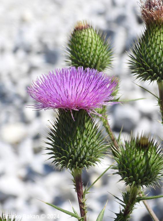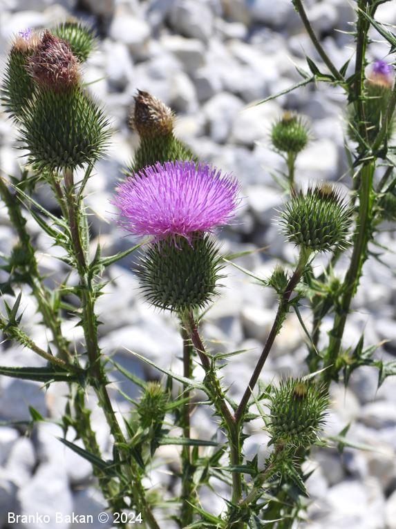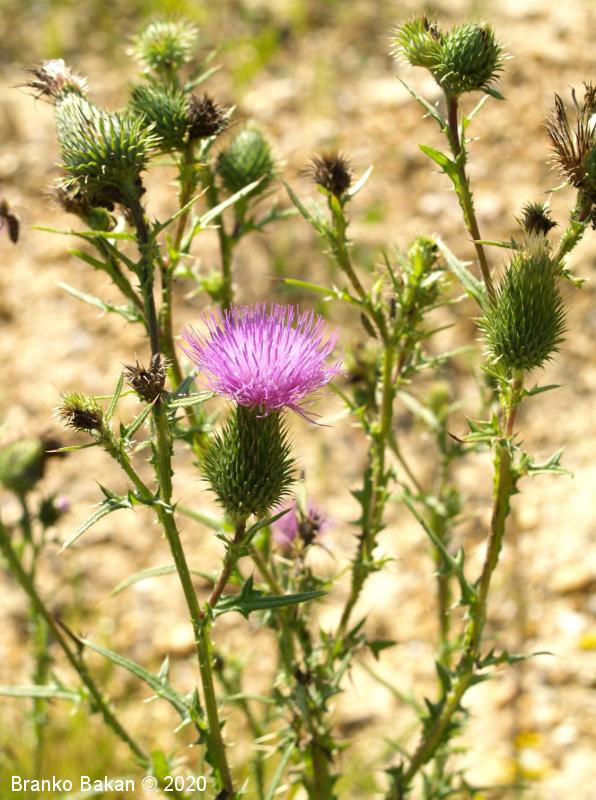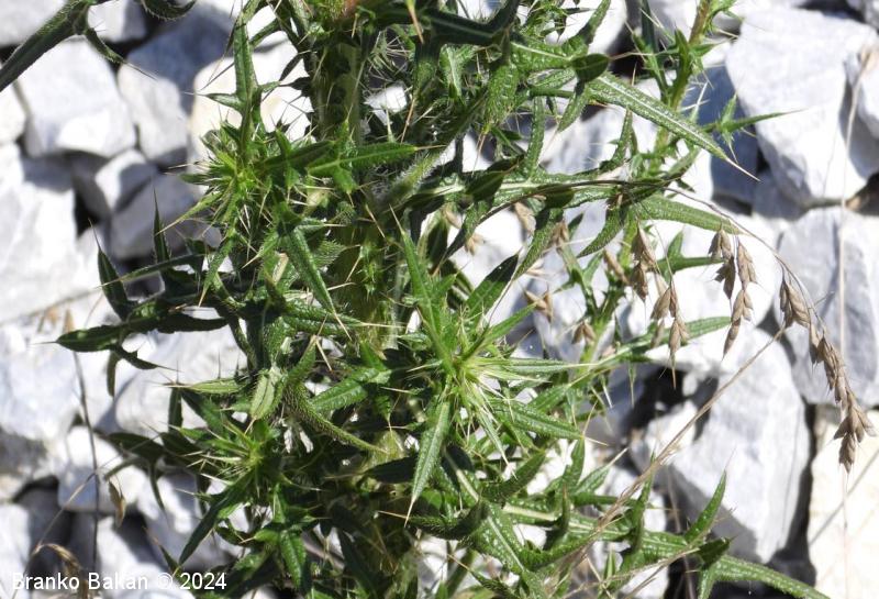 Opis: pokončna, razrasla, močno trnata dvoletnica s steblom (ki razvije gosto pritlično listno rozeto v prvem letu) in je mestoma krilata, večinoma pa je steblo nekrilato. Listi so podolgasto suličasti, pernato deljeni ali narezani v ozko trikotne (ti so med seboj razločno odmaknjeni) ali jajčaste roglje, večinoma raztreseno dlakavi, roglji porasli z dolgimi, togimi, svetlimi trni. Koški so posamični ali 2-4 skupaj na koncu poganjkov, 2-4 cm veliki, v spodnjem delu široko jajčasti do zaobljeni, obdajajo jih ozkosuličasti ovojkovi listi, ki so nameščeni v več redeh, v spodnjem delu ukrivljeni, podaljšani v trnato, svetlo konico, pogosto rahlo pajčevinasto dlakavi. Vsi cvetovi v koških so cevasti, škrlatnordeči. Plod je orešek (rožka), s kodeljico (reducirana čaša) iz belih, peresastih laskov.