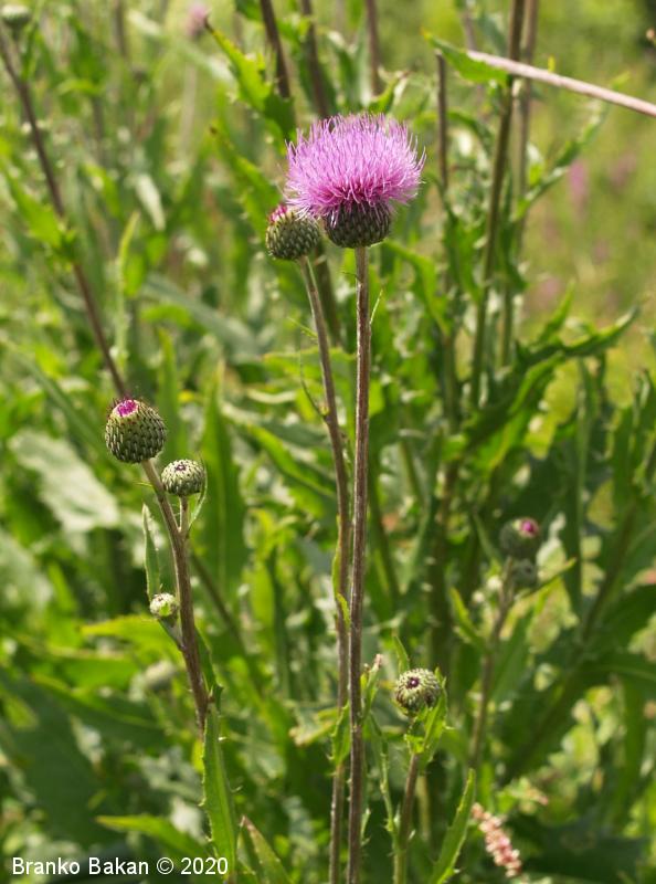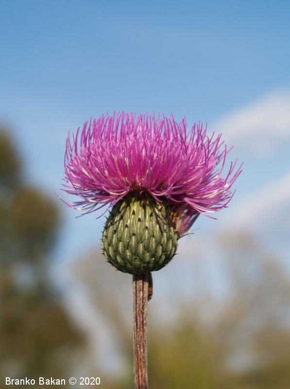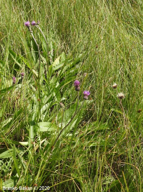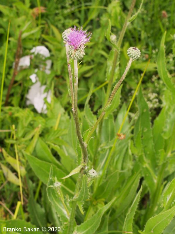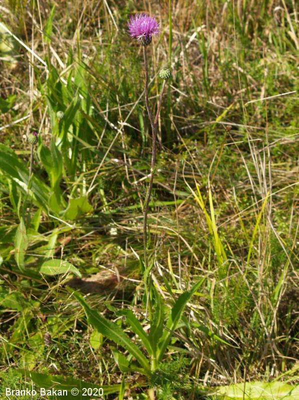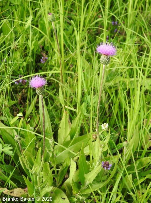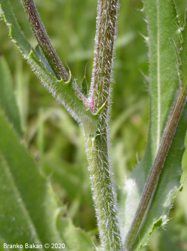 Opis: trajnica z gomoljasto odebeljenimi koreninami in pogosto s pritlično listno rozeto. Spodnji listi so podolgasto suličasti, večinoma celi, pecljati, po robu nazobčani in ostnatotrnati, mehkodlakavi, po spodnji strani belodlakavi, zgornji listi so sedeči, pernato nacepljeni ali deljeni v ozke, ostnatotrnate roglje, prileglodlakavi, sinjezeleni. Koški so večinoma posamični na redko olistanih ovršnih poganjkih, v spodnjem delu skoraj okrogli, obdajajo jih ozkosuličasti ovojkovi listi, ki so nameščeni v več redeh in so tesno prilegli drug ob drugega, v sredini s svetlo progo, na vrhu s kratko, temno, ostnato štrlečo konico. Vsi cvetovi v koških so cevasti, škrlatnordeči. Plod je orešek (rožka), ki ima na vrhu kodeljico (reducirani čašni listi) iz belkastih, peresastih laskov.