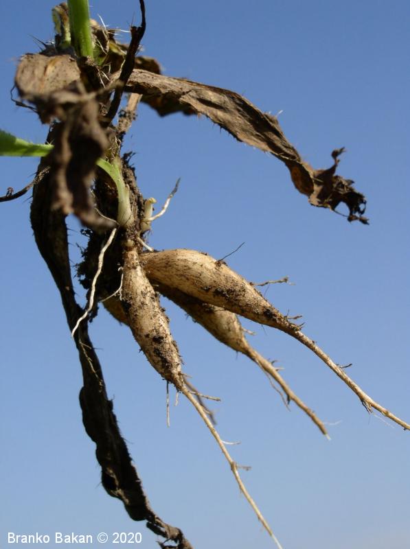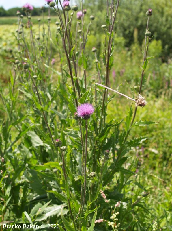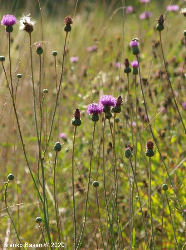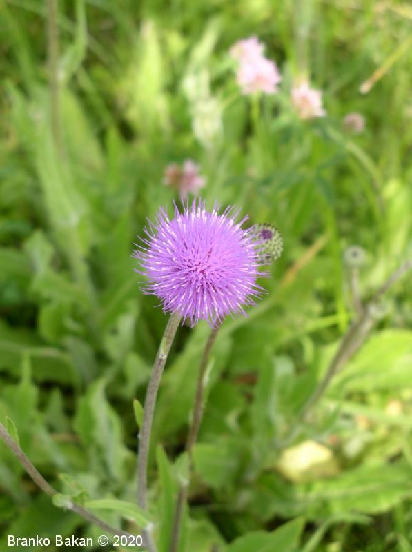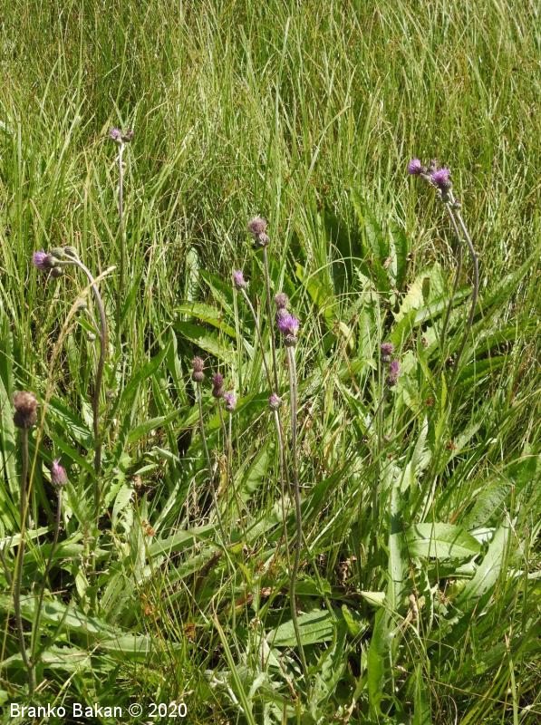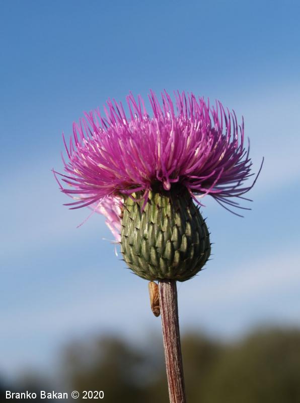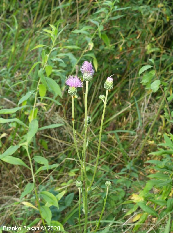 Opis: trajnica z gomoljasto odebeljenimi koreninami in pogosto s pritlično listno rozeto. Spodnji listi so podolgasto suličasti, večinoma celi, pecljati, po robu nazobčani in ostnatotrnati, mehkodlakavi, po spodnji strani belodlakavi, zgornji listi so sedeči, pernato nacepljeni ali deljeni v ozke, ostnatotrnate roglje, prileglodlakavi, sinjezeleni. Koški so večinoma posamični na redko olistanih ovršnih poganjkih, v spodnjem delu skoraj okrogli, obdajajo jih ozkosuličasti ovojkovi listi, ki so nameščeni v več redeh in so tesno prilegli drug ob drugega, v sredini s svetlo progo, na vrhu s kratko, temno, ostnato štrlečo konico. Vsi cvetovi v koških so cevasti, škrlatnordeči. Plod je orešek (rožka), ki ima na vrhu kodeljico (reducirani čašni listi) iz belkastih, peresastih laskov.